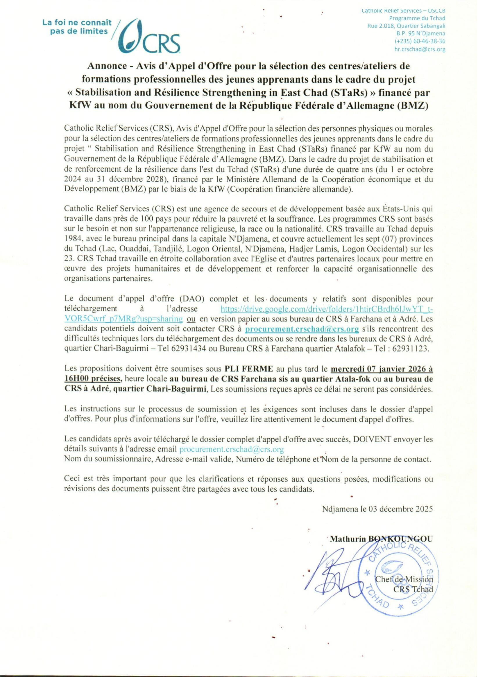 Accueil » Opportunités » Afrique » Tchad » Catholic Relief Services (CRS) lance un avis d’appel d’offres pour la sélection des centres/ateliers de formations professionnelles des jeunes apprenants dans le cadre du projet STaRs, Tchad