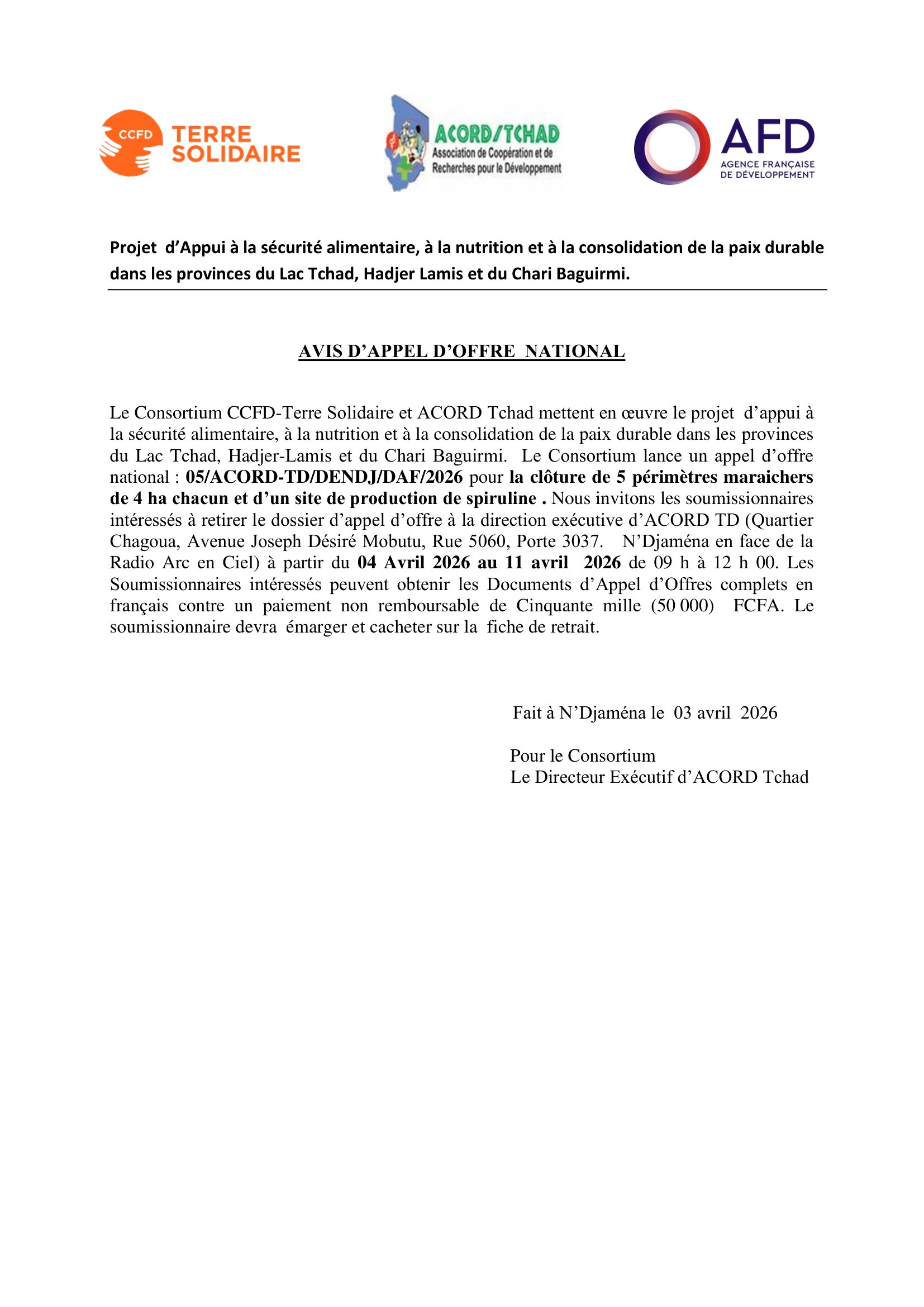 Accueil » Opportunités » Afrique » Tchad » Appel d’Offre National 2026 : CCFD-Terre Solidaire et ACORD Tchad recrutent une entreprise pour la clôture de 5 périmètres maraichers et d’un site de production de spiruline