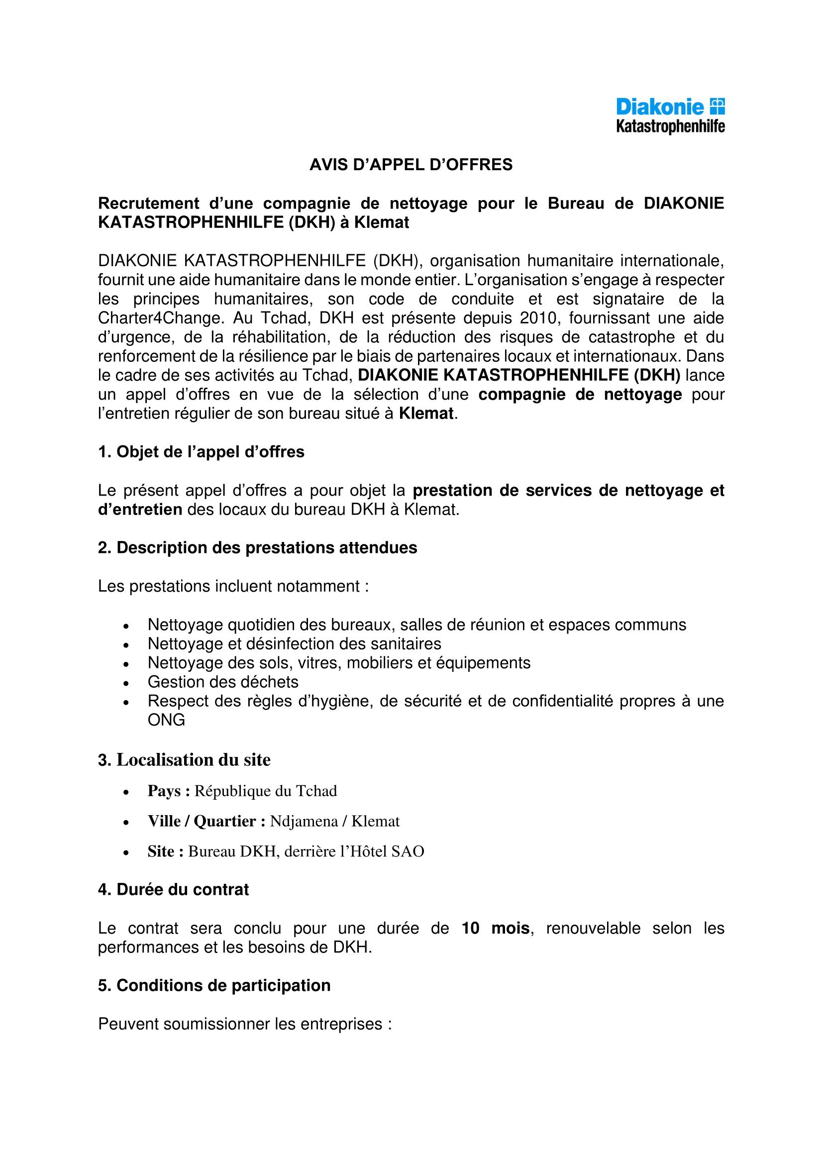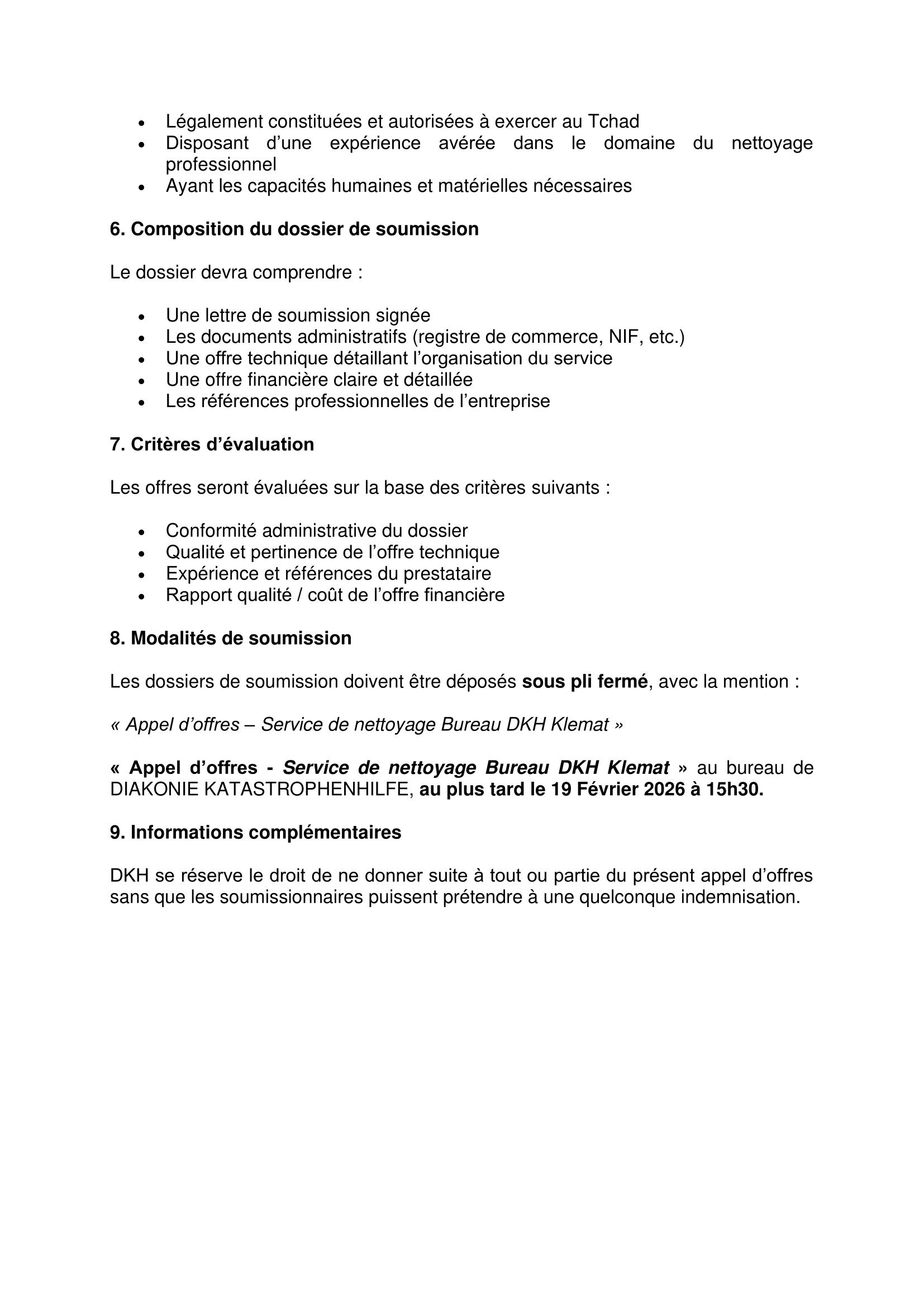 Accueil » Opportunités » Afrique » Tchad » DKH lance un appel d’offres au Tchad pour recruter une compagnie de nettoyage chargée de l’entretien régulier de son bureau situé à Klemat