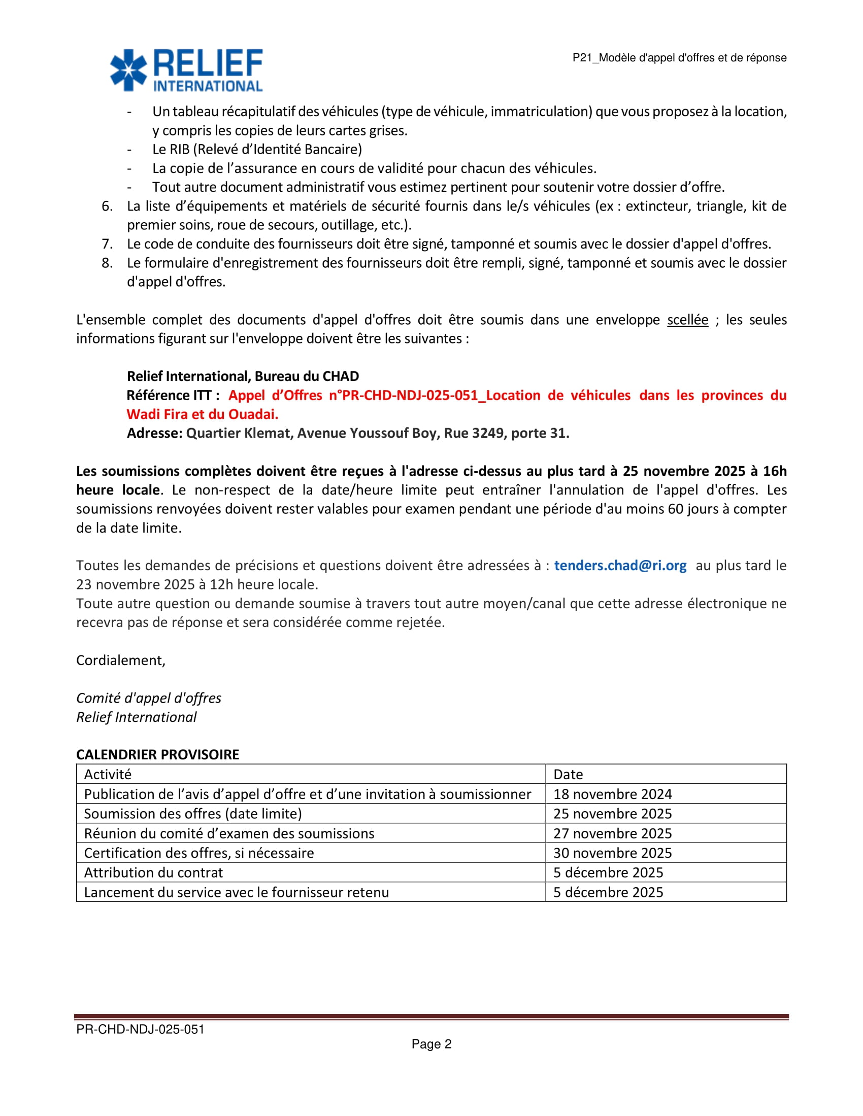 Accueil » Opportunités » Afrique » Tchad » Relief International lance un avis d’appel à manifestation d’intérêt pour la location de Véhicule dans la province du Wadi Fira et du Ouaddaï, Tchad