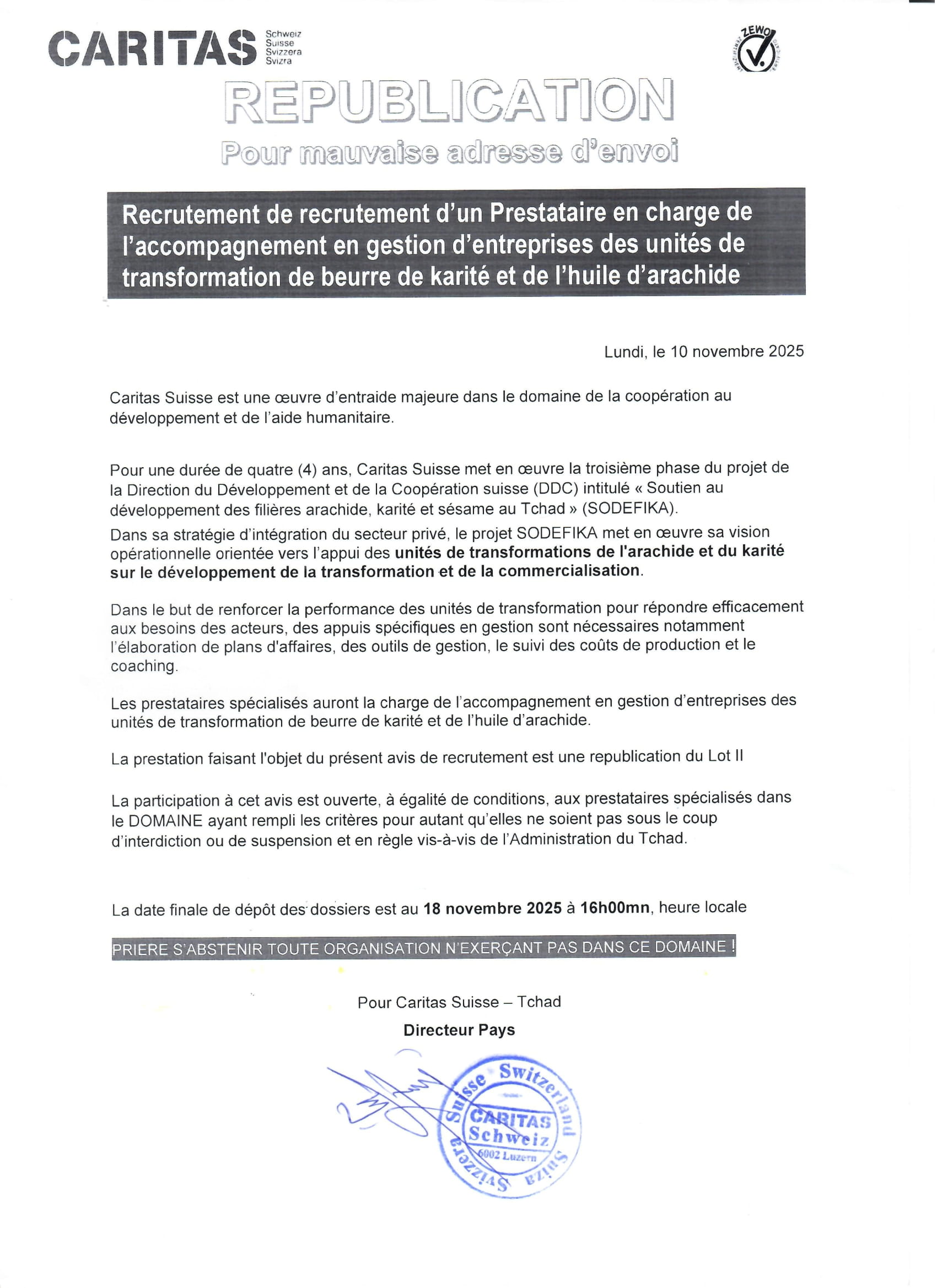 La Caritas Suisse lance un avis de recrutement d’un Prestataire en charge de l’accompagnement en gestion d’entreprises des unités de transformation de beurre de karité et l’huile d’arachide, Tchad