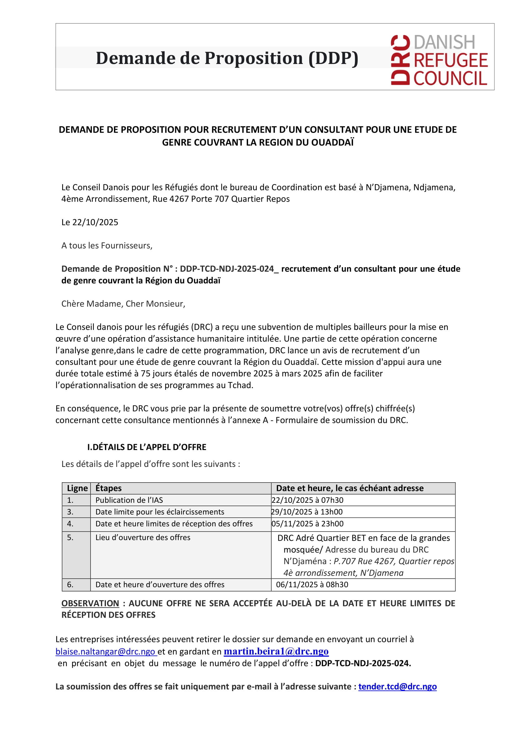 Accueil » Opportunités » Afrique » Tchad » DRC lance un avis d’appel d’offres pour le recrutement d’un consultant pour une étude de genre couvrant la région du Ouaddaï, Tchad