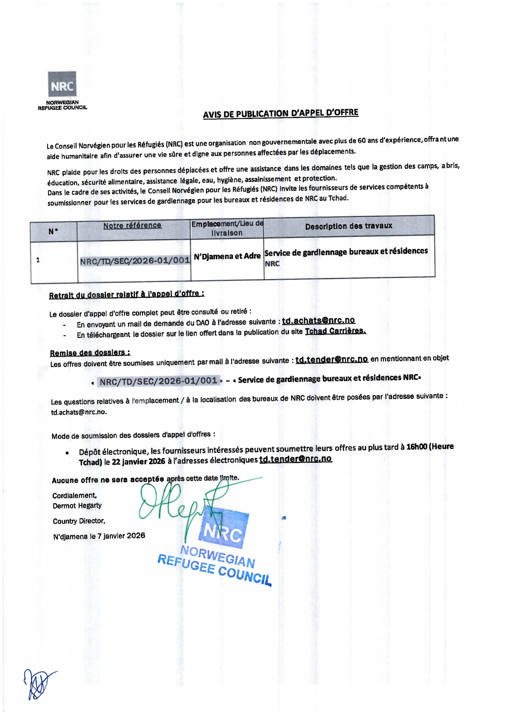 Le Conseil Norvégien pour les Réfugiés (NRC) lance un avis d’appel d’offres pour le recrutement des services de gardiennage pour ses Bureaux et résidences de N’Djamena et Adré, Tchad