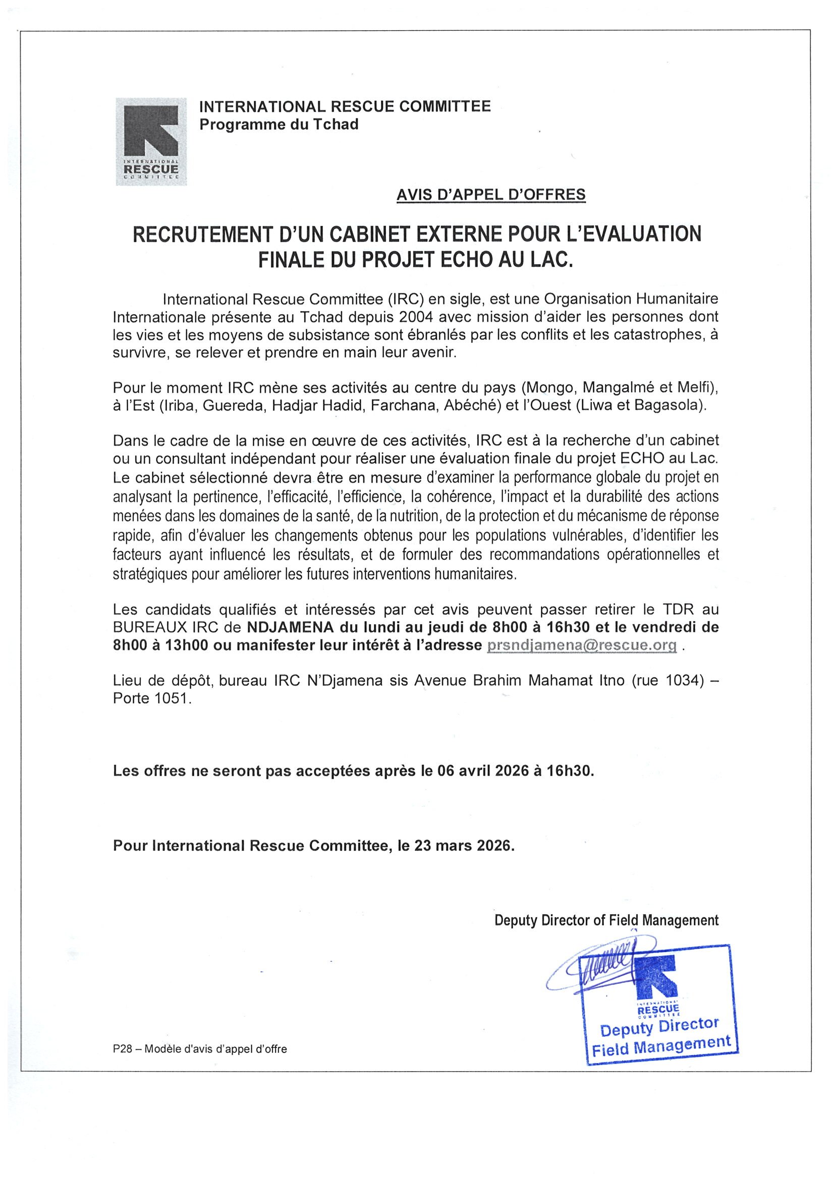Accueil » Opportunités » Afrique » Tchad » L’IRC au Tchad lance un appel d’offres pour le recrutement d’un Cabinet Externe pour l’évaluation finale du projet Echo au Lac