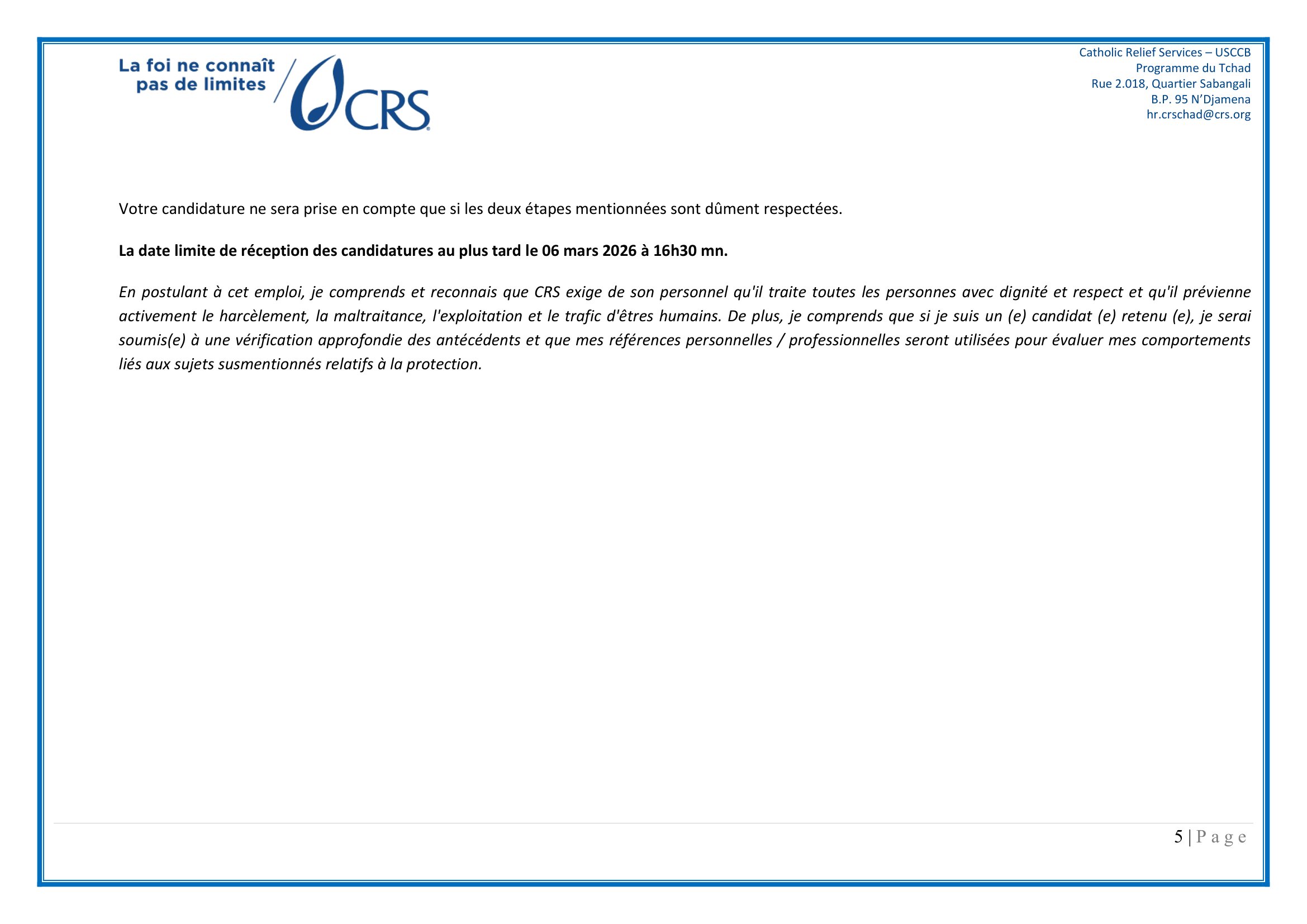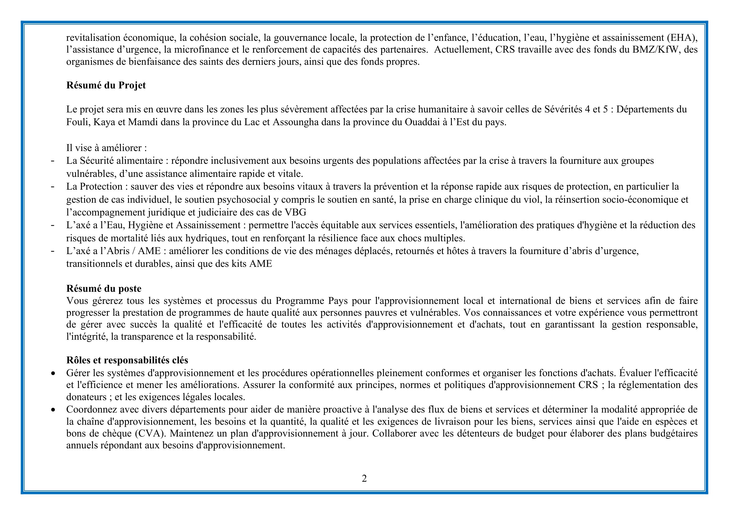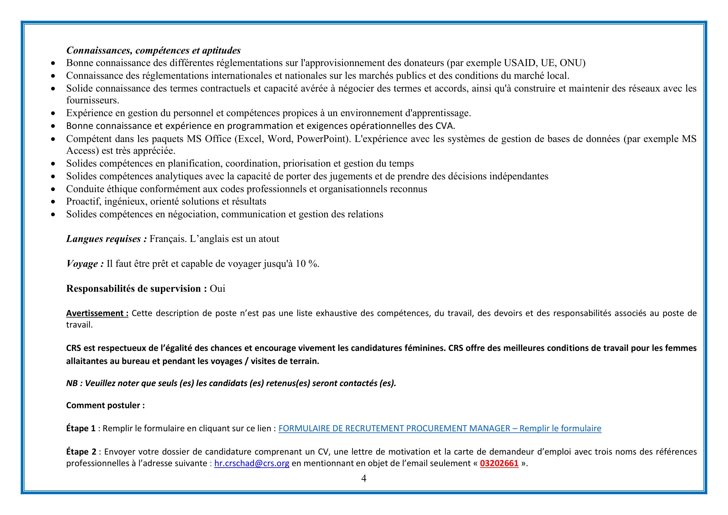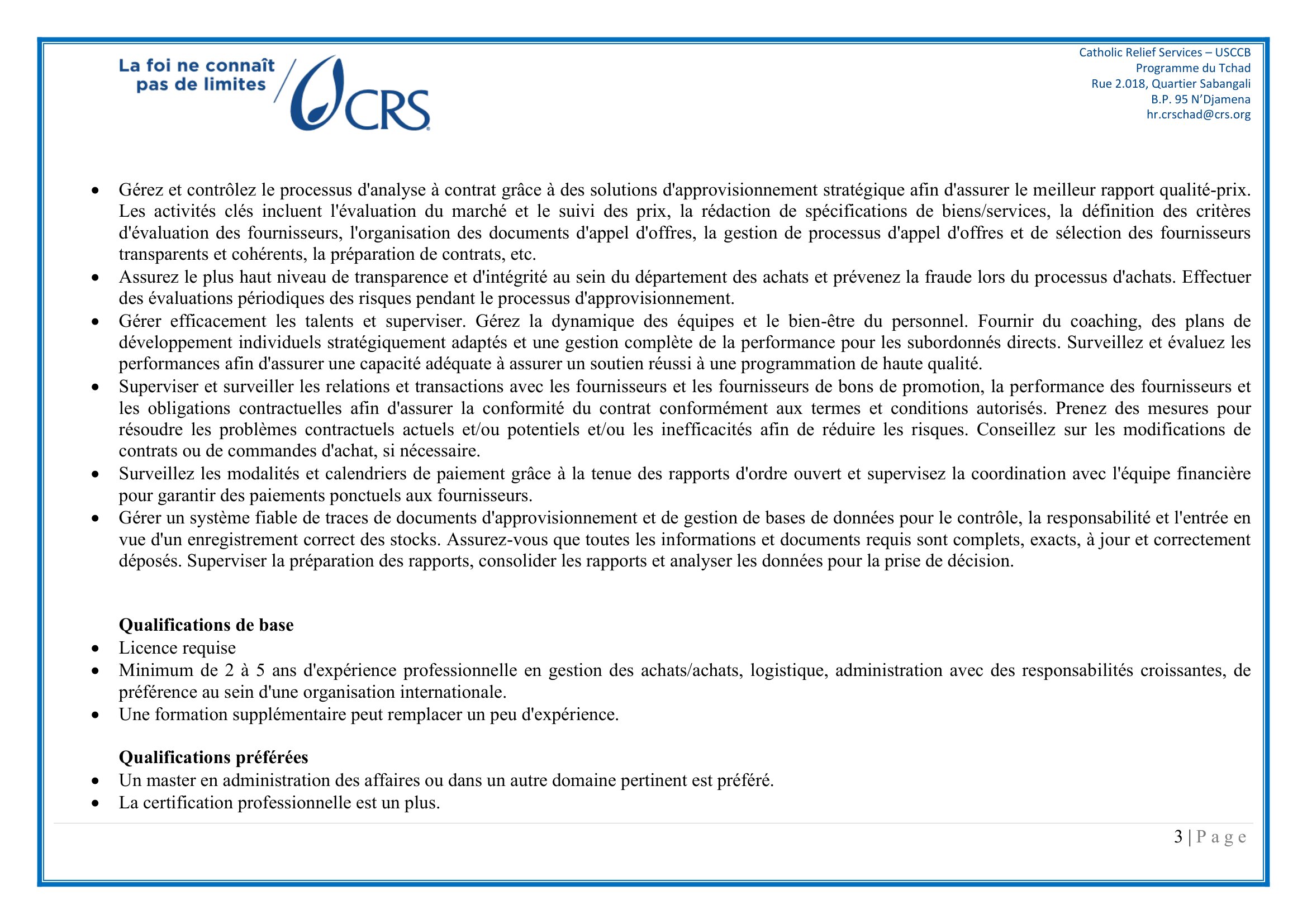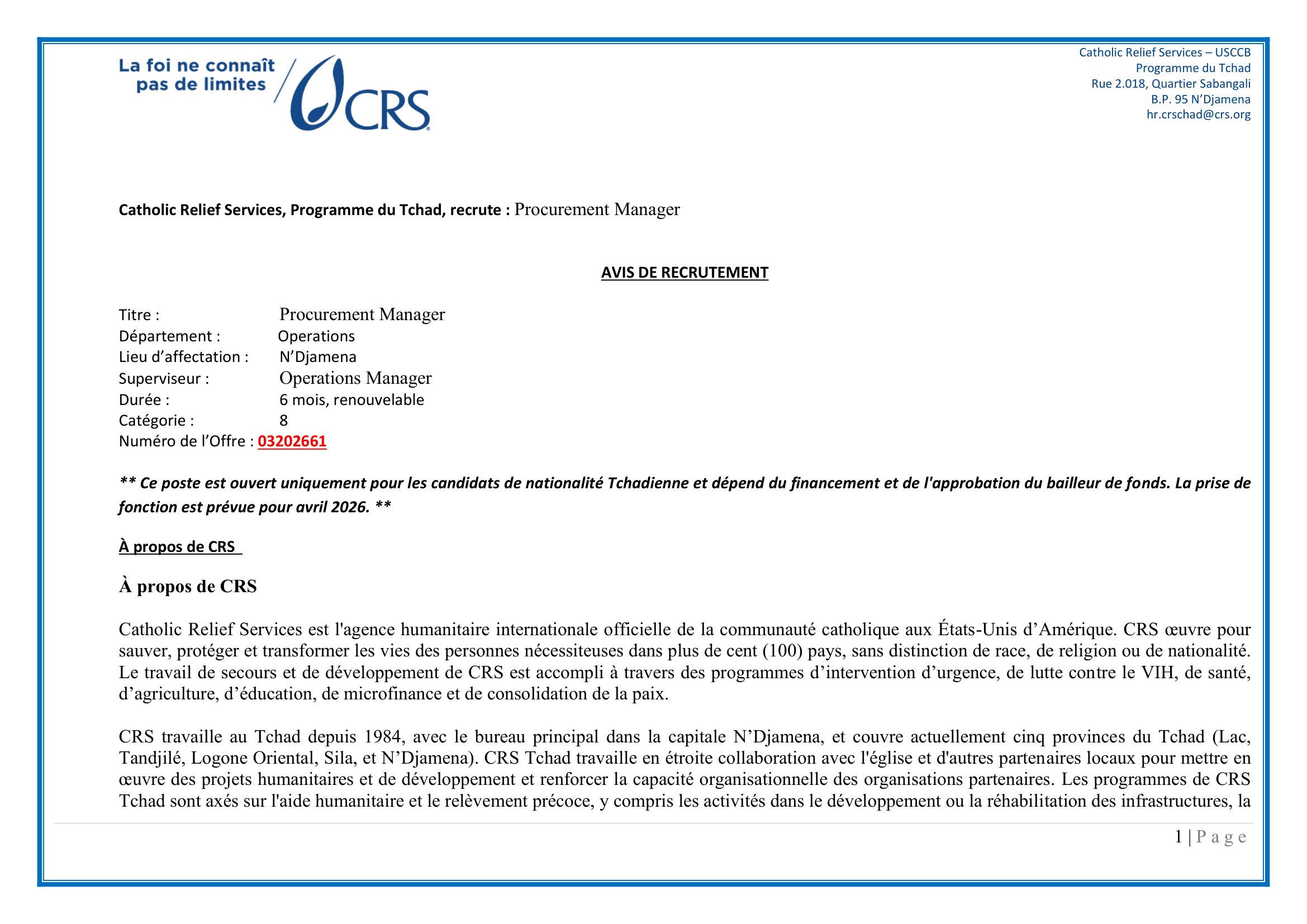 Accueil » Opportunités » Afrique » Tchad » Catholic Relief Services, programme du Tchad recherche un(e) Procurement Manger à N’Djamena