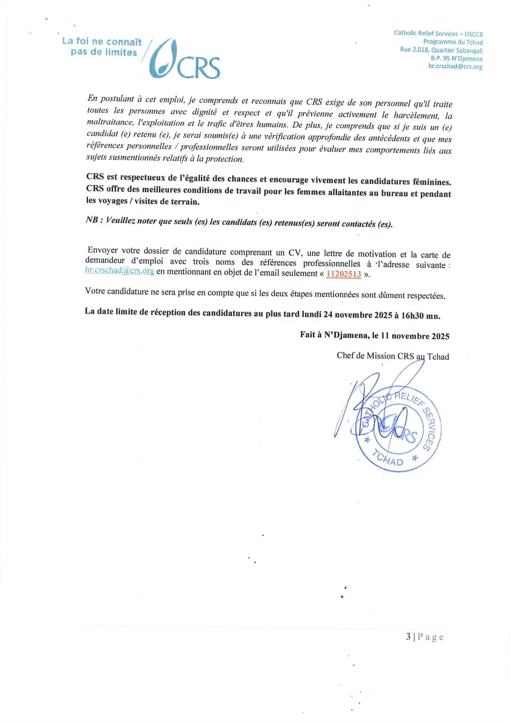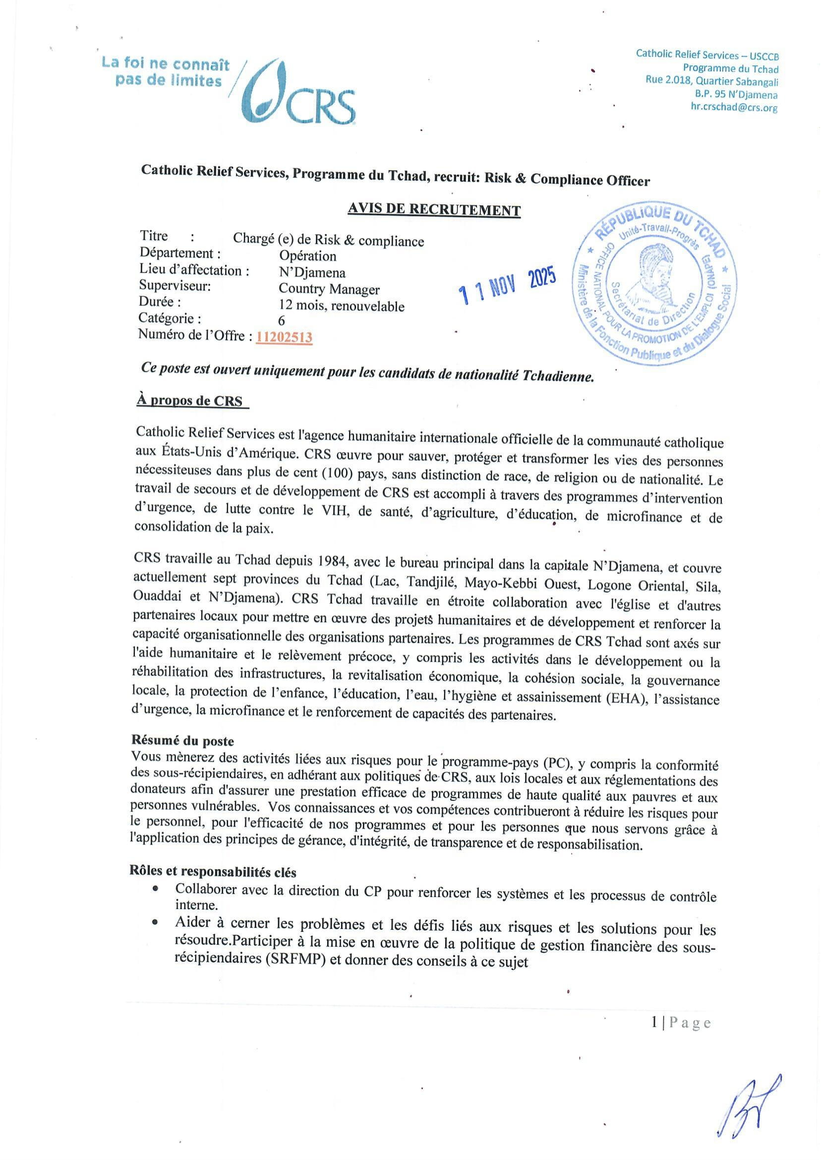Accueil » Opportunités » Afrique » Tchad » Catholic Relief Services (CRS) recrute pour le poste d’un(e) Chargé(e) de Risk & Compliance basé(e) à N’Djamena, Tchad