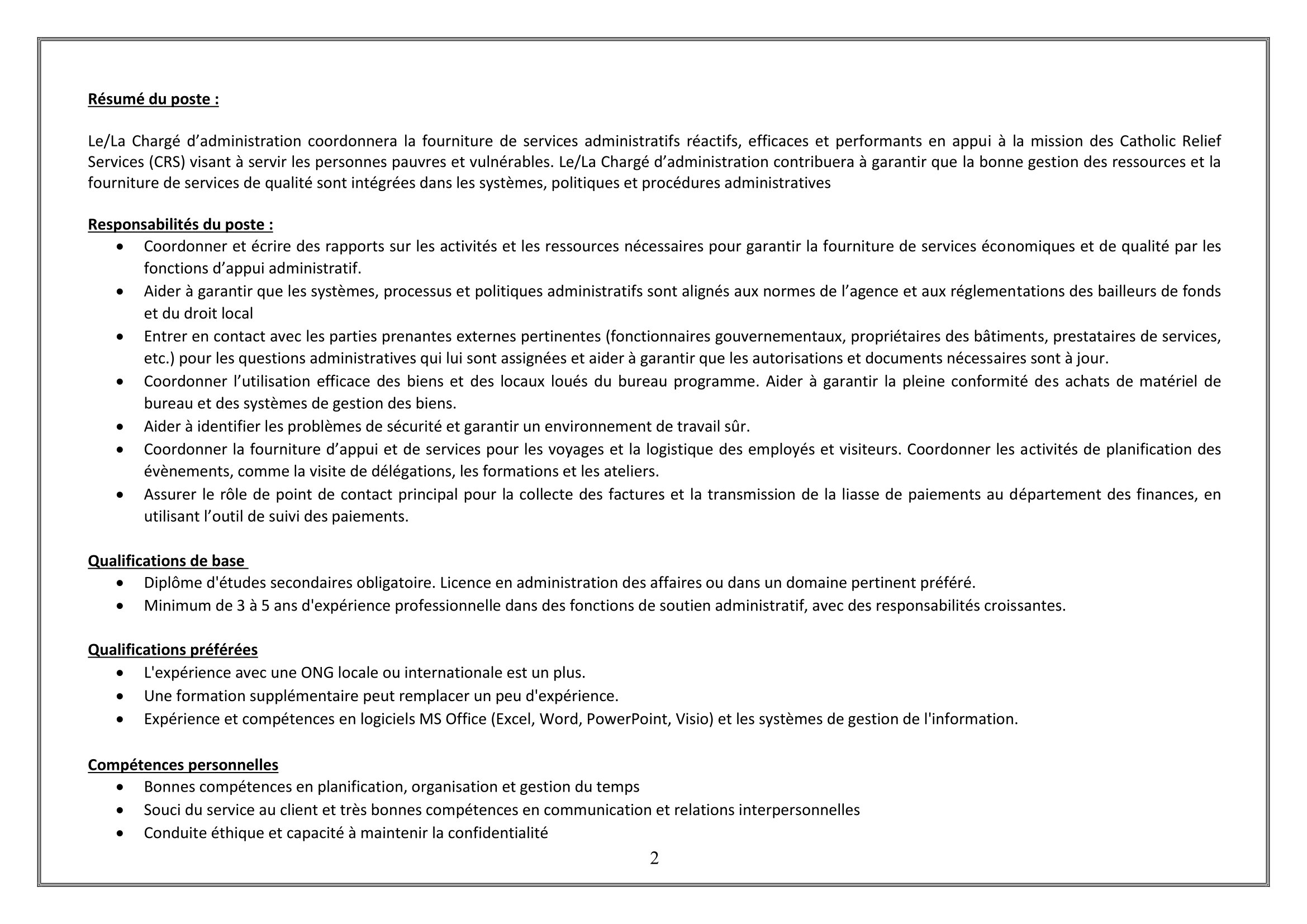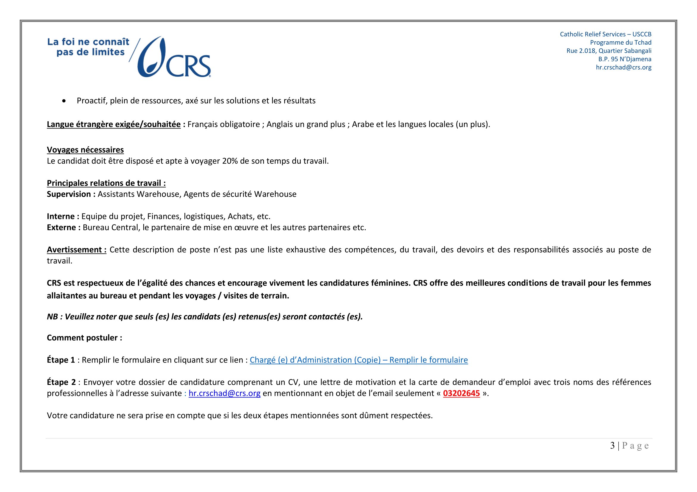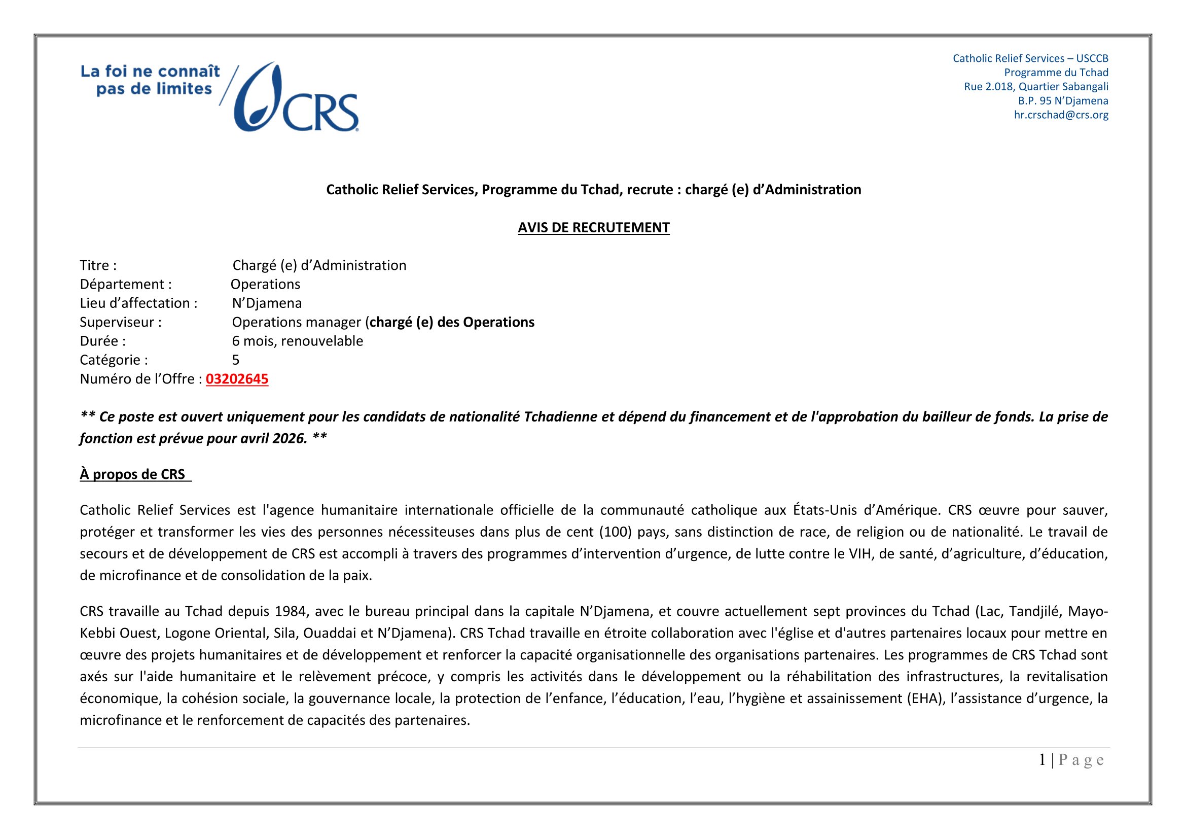 Accueil » Opportunités » Afrique » Tchad » Catholic Relief Services recherche un(e) Chargé(e) d’Administration à N’Djamena, Tchad