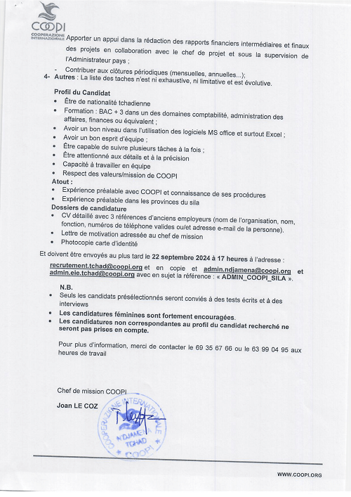 Accueil » Opportunités » Afrique » Tchad » Cooperazione Internazionale recrute un Administrateur Financier, Sila, Tchad
