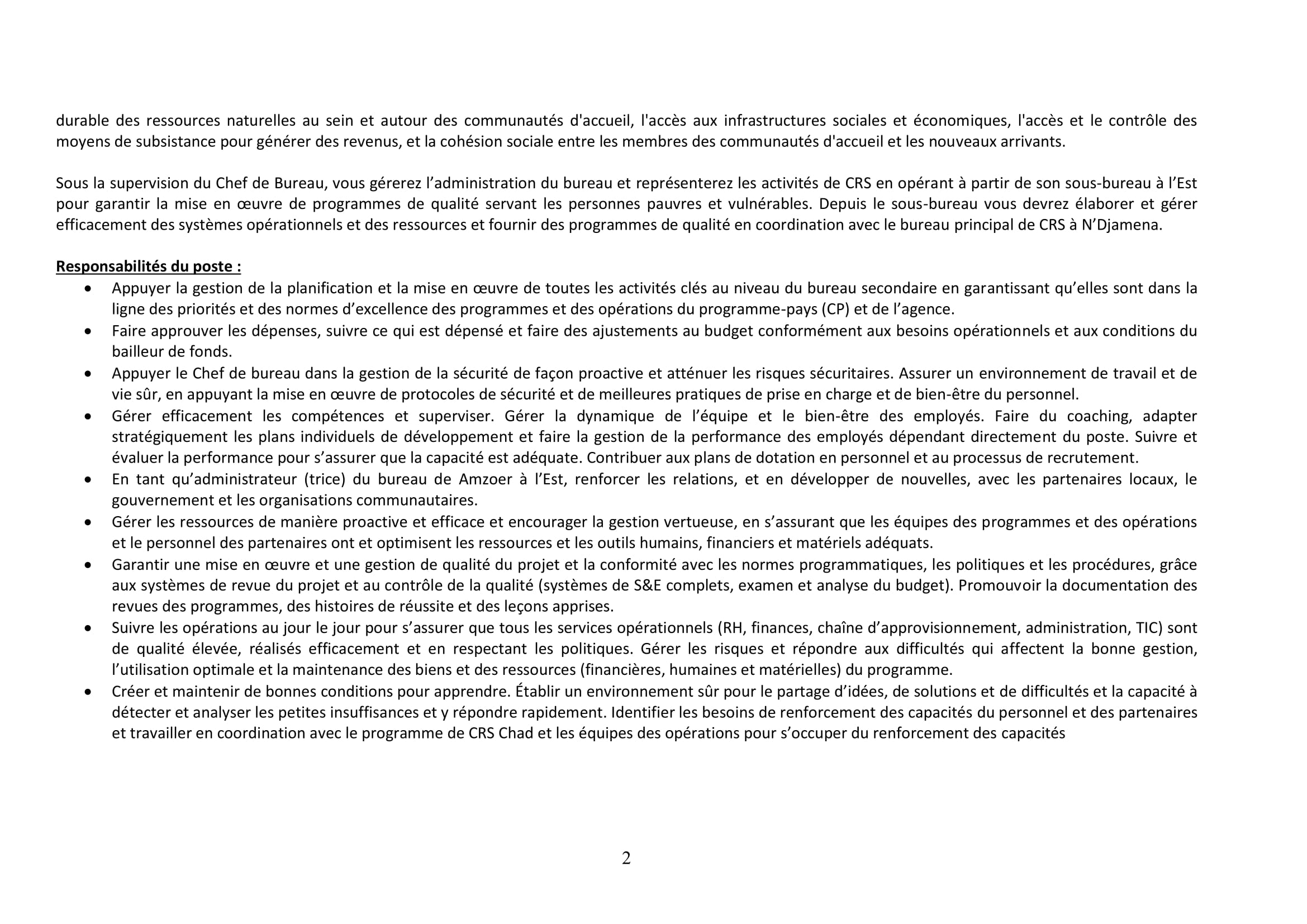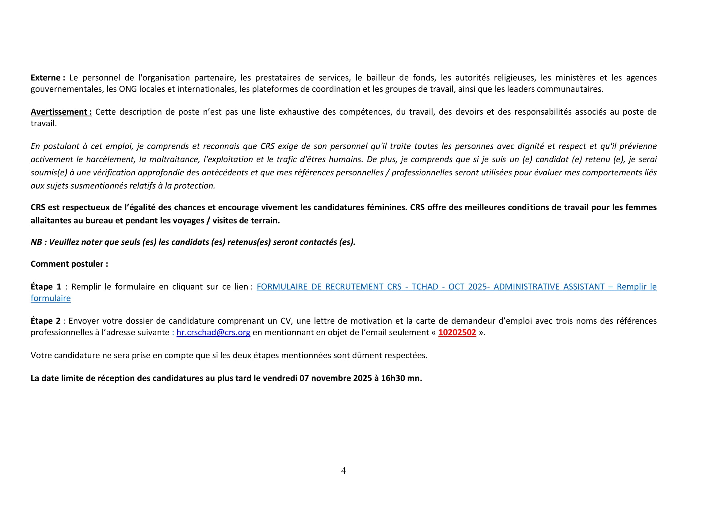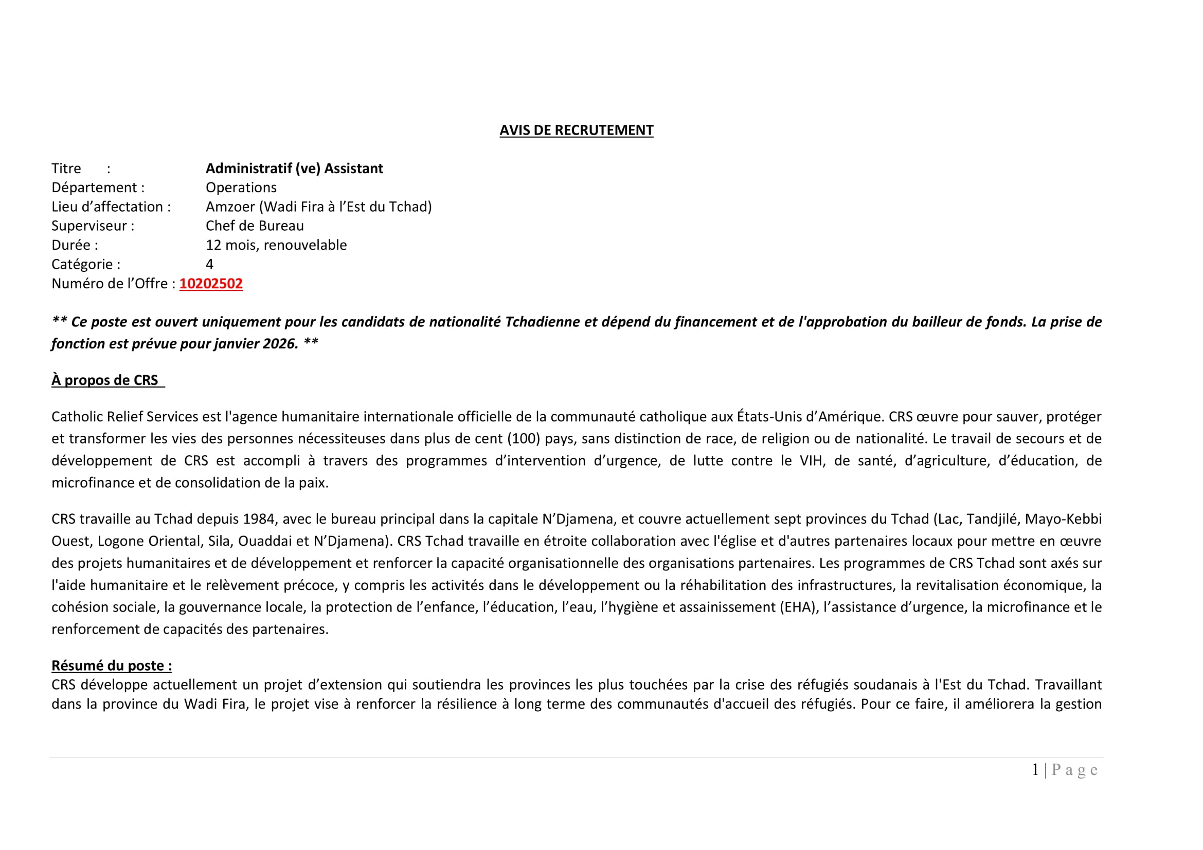 Catholic Relief Services recrute un(e) Assistant(e) administratif(ve) à Amzoer, Tchad