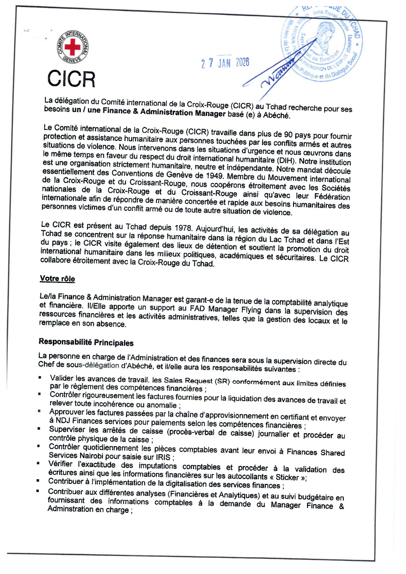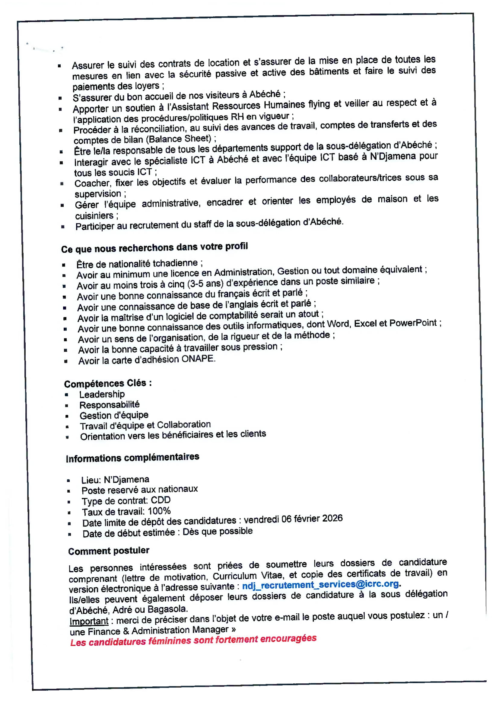 Accueil » Opportunités » Afrique » Tchad » CICR au Tchad recherche pour ses besoins un(e) Manager Finance & Administration basé(e) Abéché
