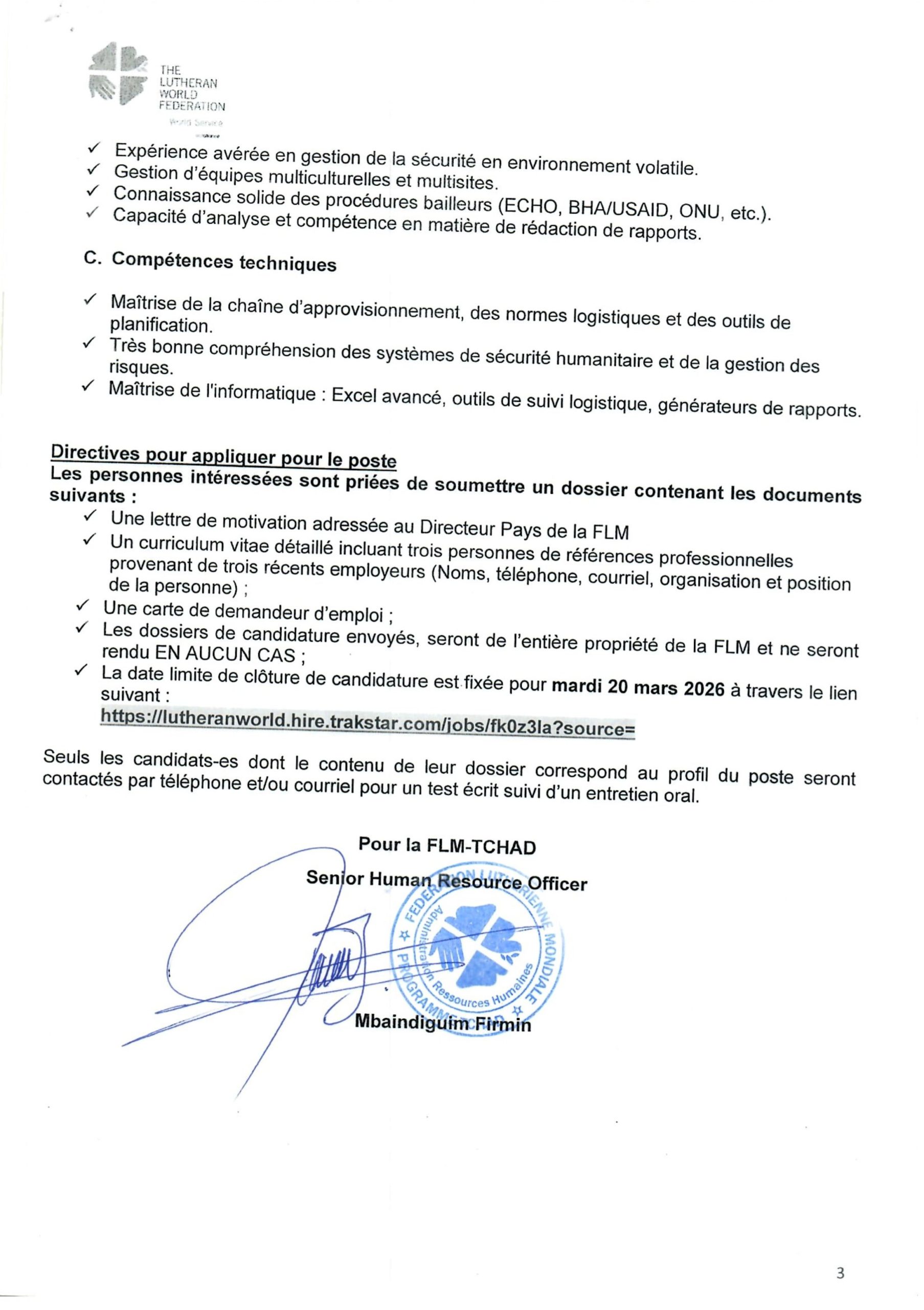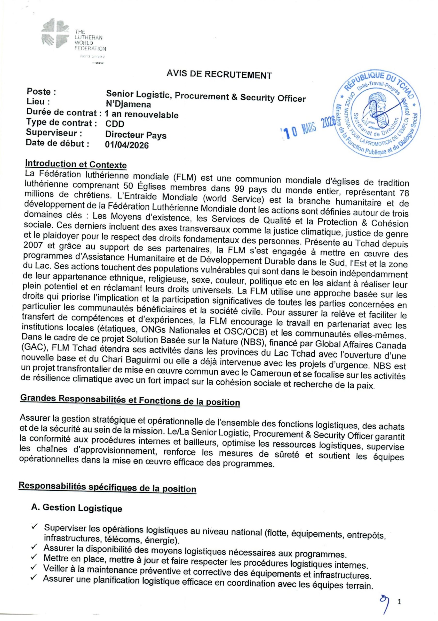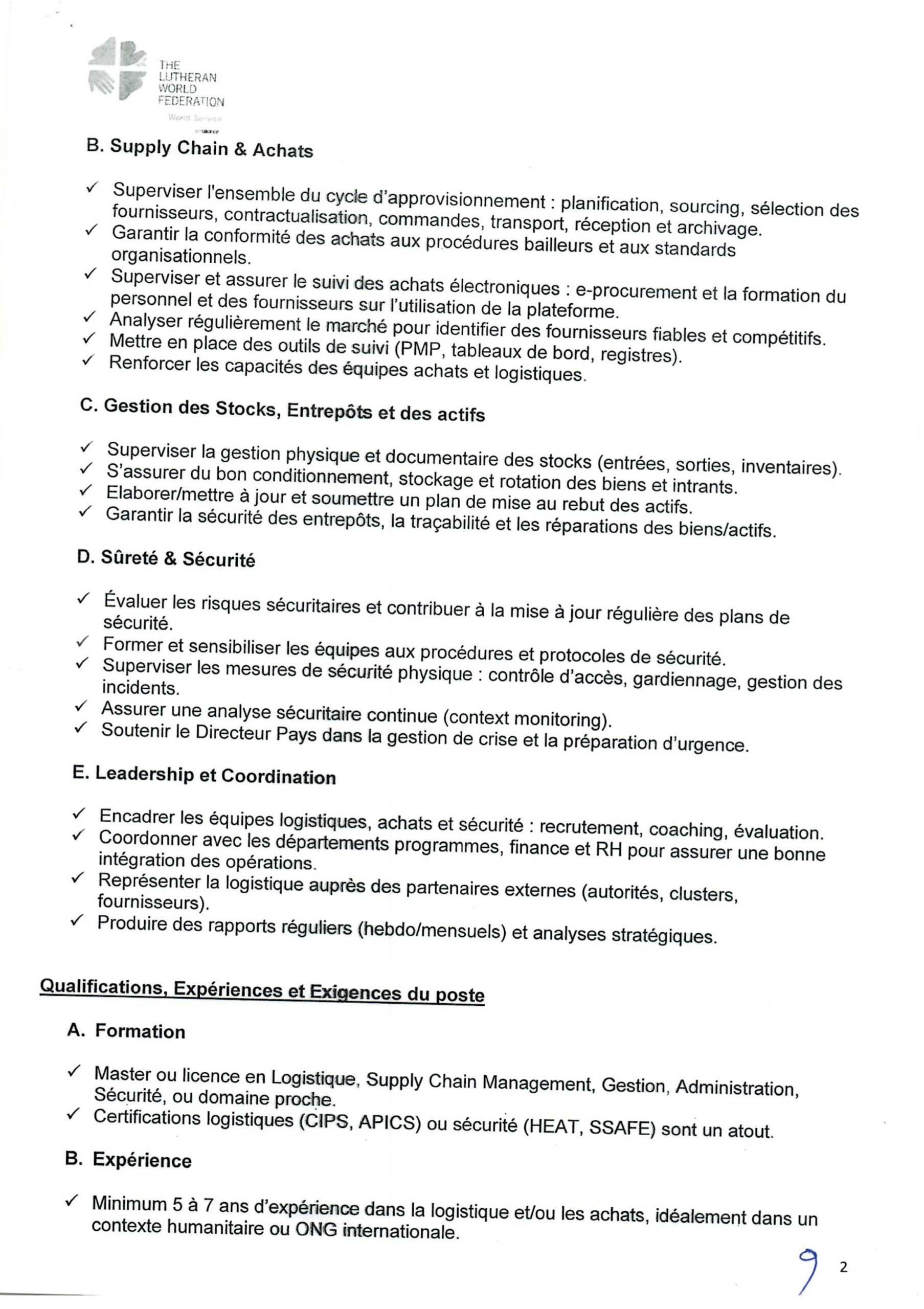 Accueil » Opportunités » Afrique » Tchad » La Fédération Luthérienne Mondiale (FLM) au Tchad recherche un(e) Senior Logistic, Procurement & Security Officer à N’Djamena