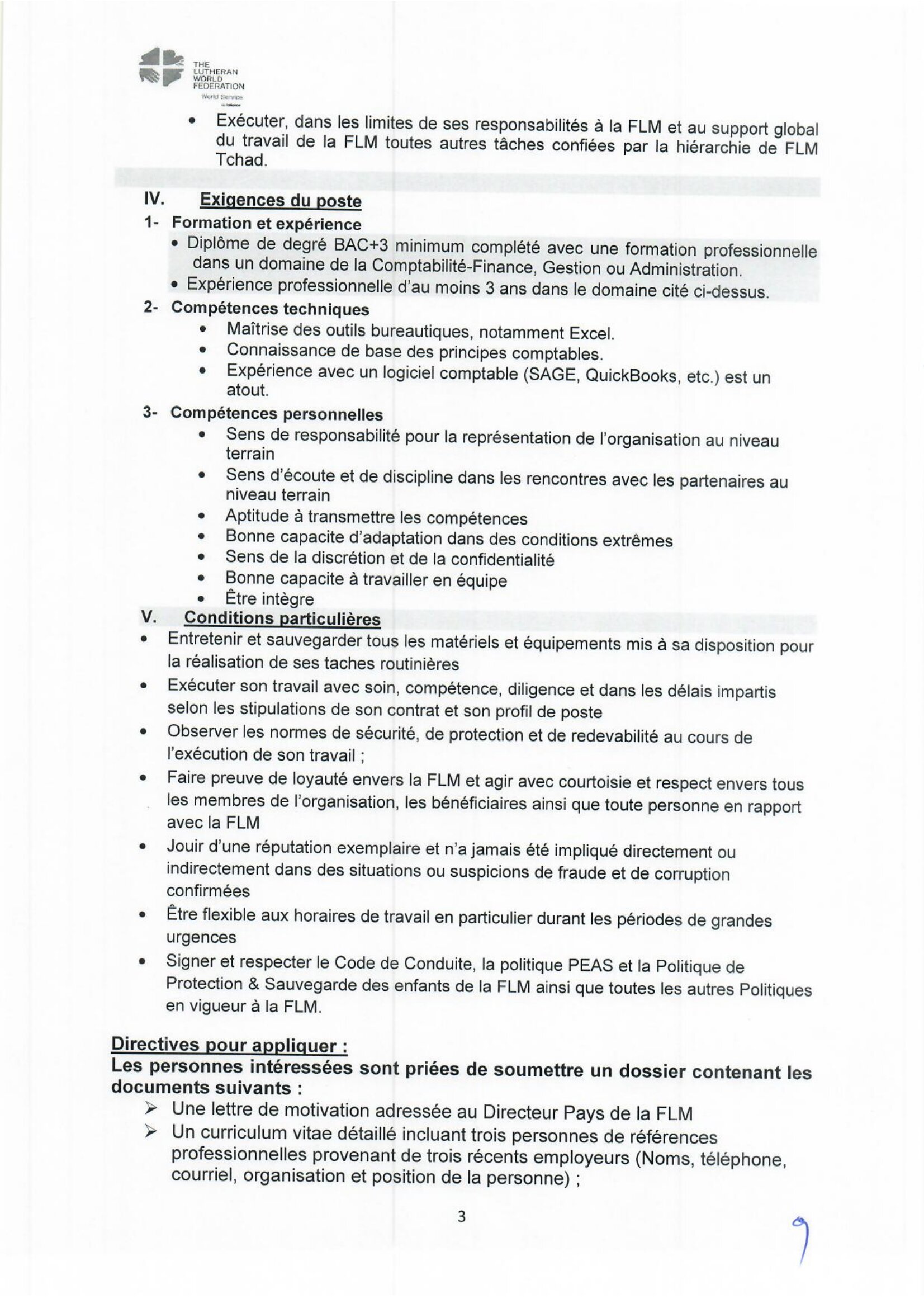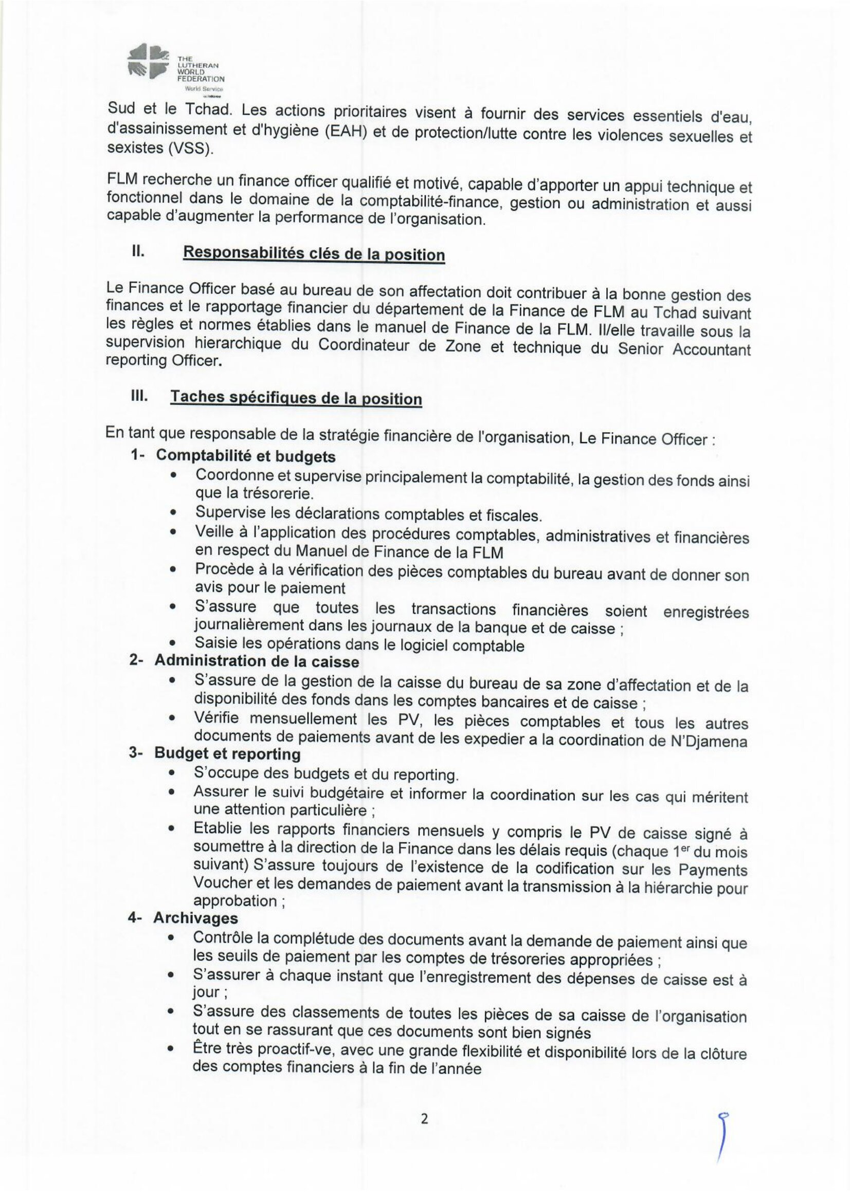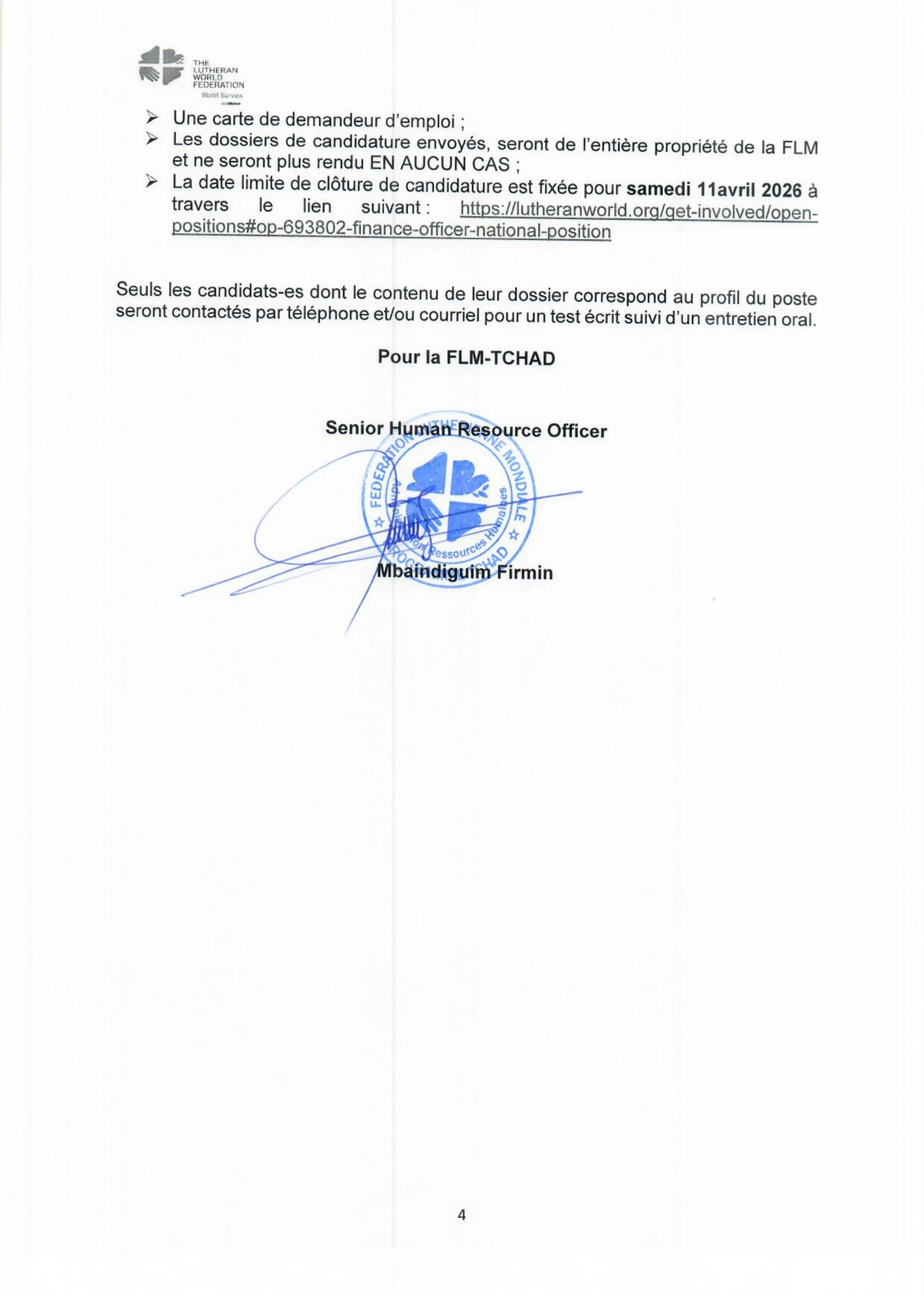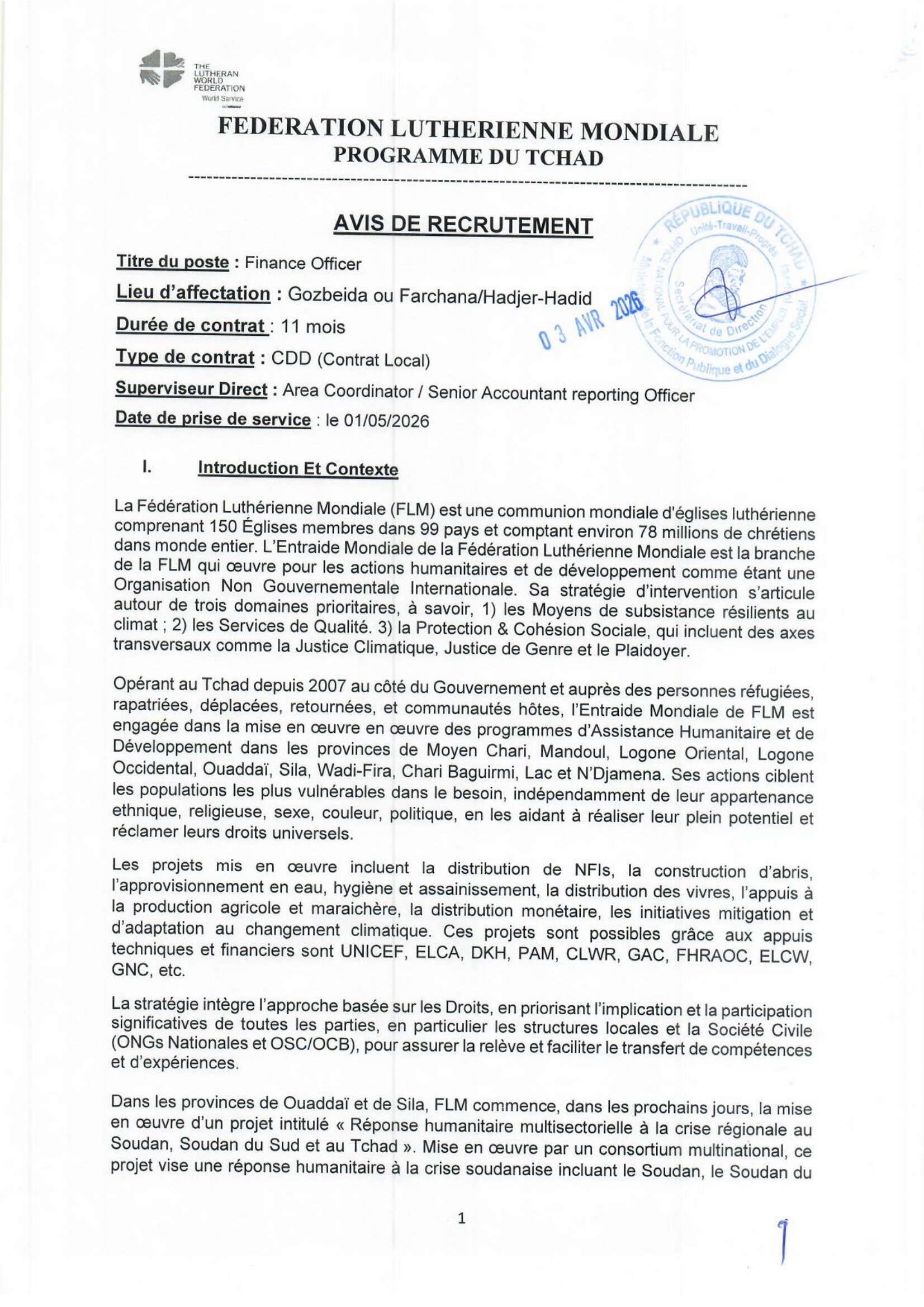 La Fédération Luthérienne Mondiale (FLM) au Tchad recrute un(e) Responsable financier(ère), poste basé à Goz-Beïda ou  Farchana/Hadjer-Hadid