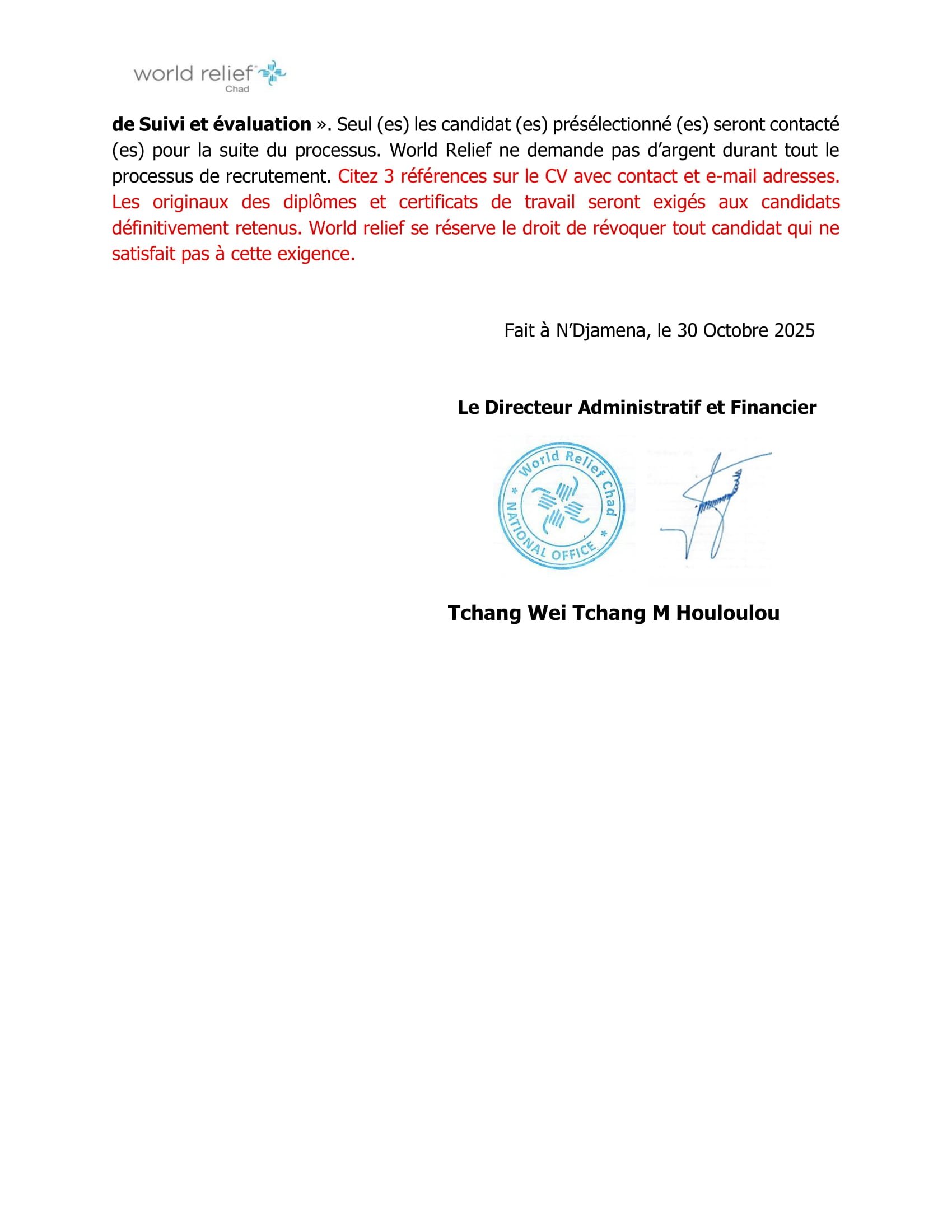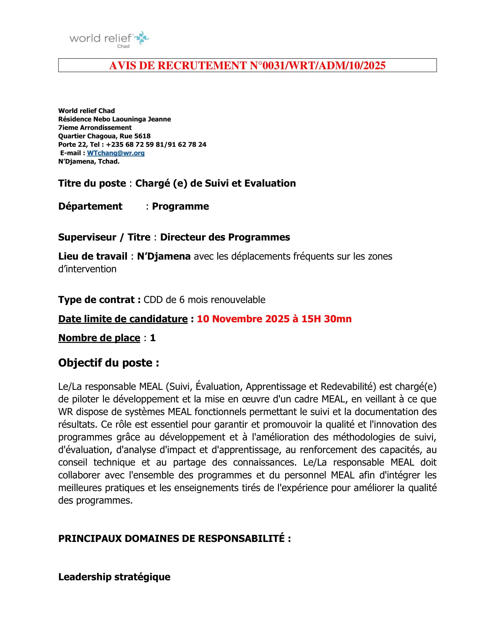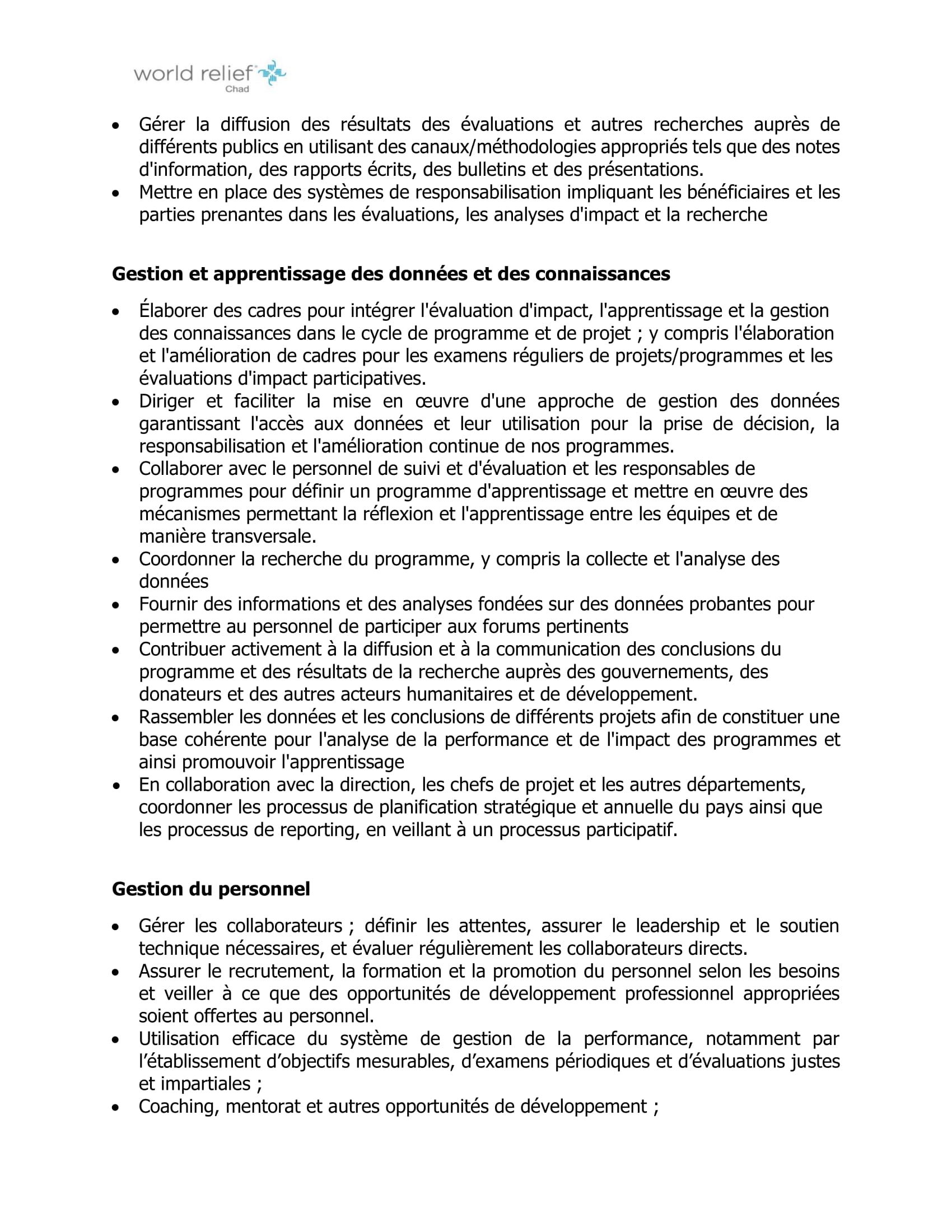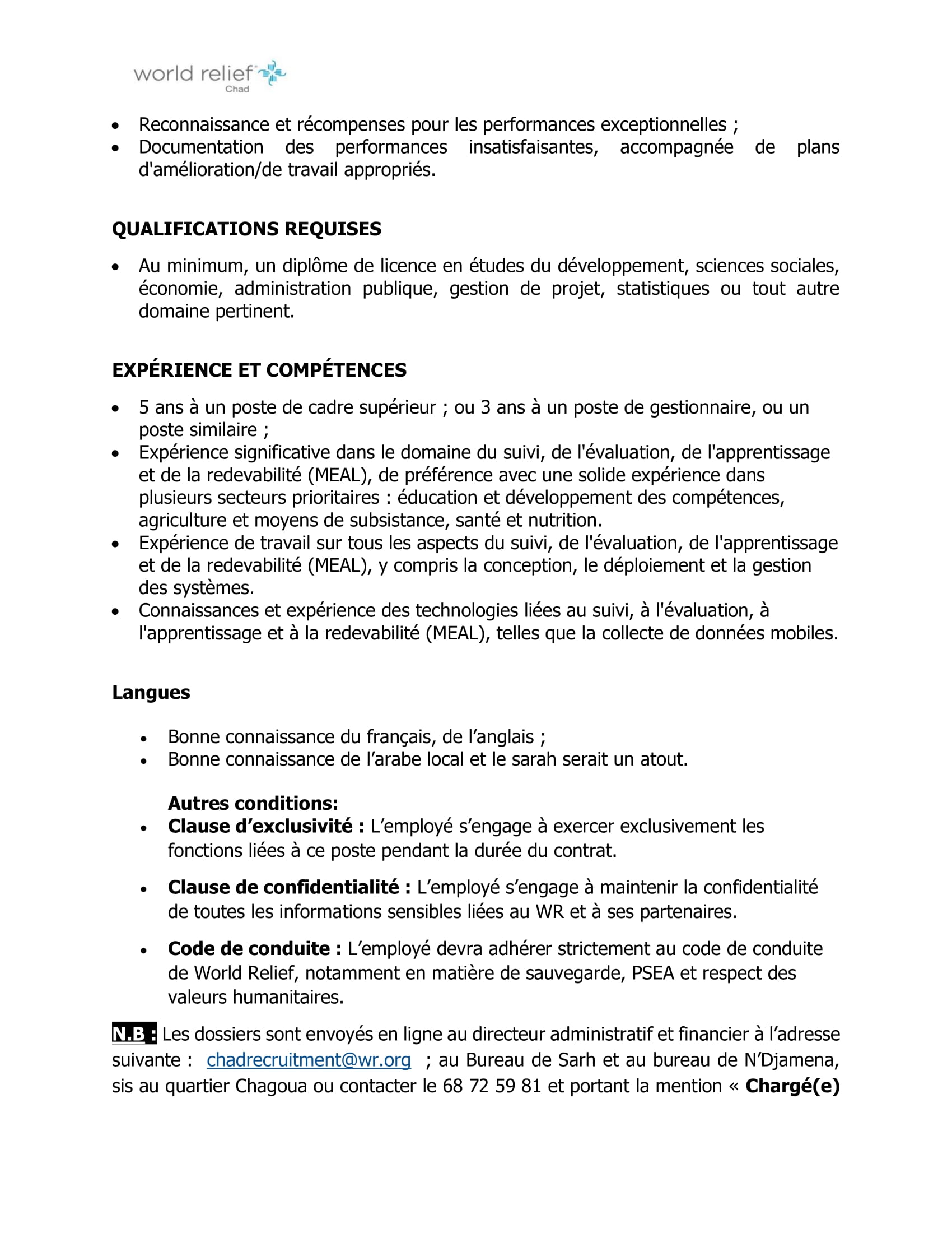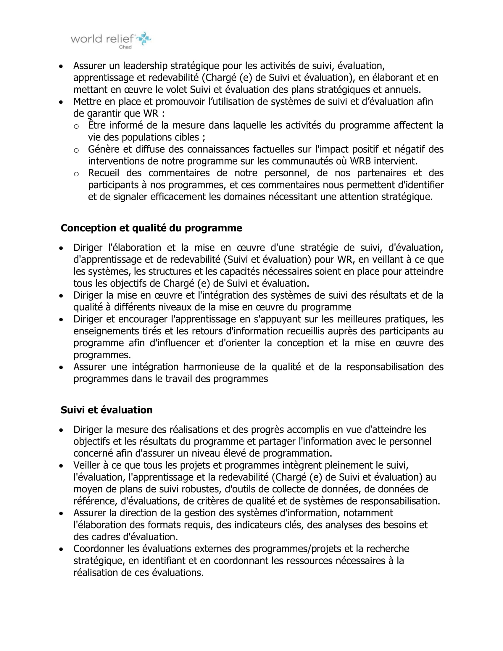 Accueil » Opportunités » Afrique » Tchad » World Relief recrute un(e) Chargé(e) de Suivi et Evaluation (H/F) à N’Djamena, Tchad