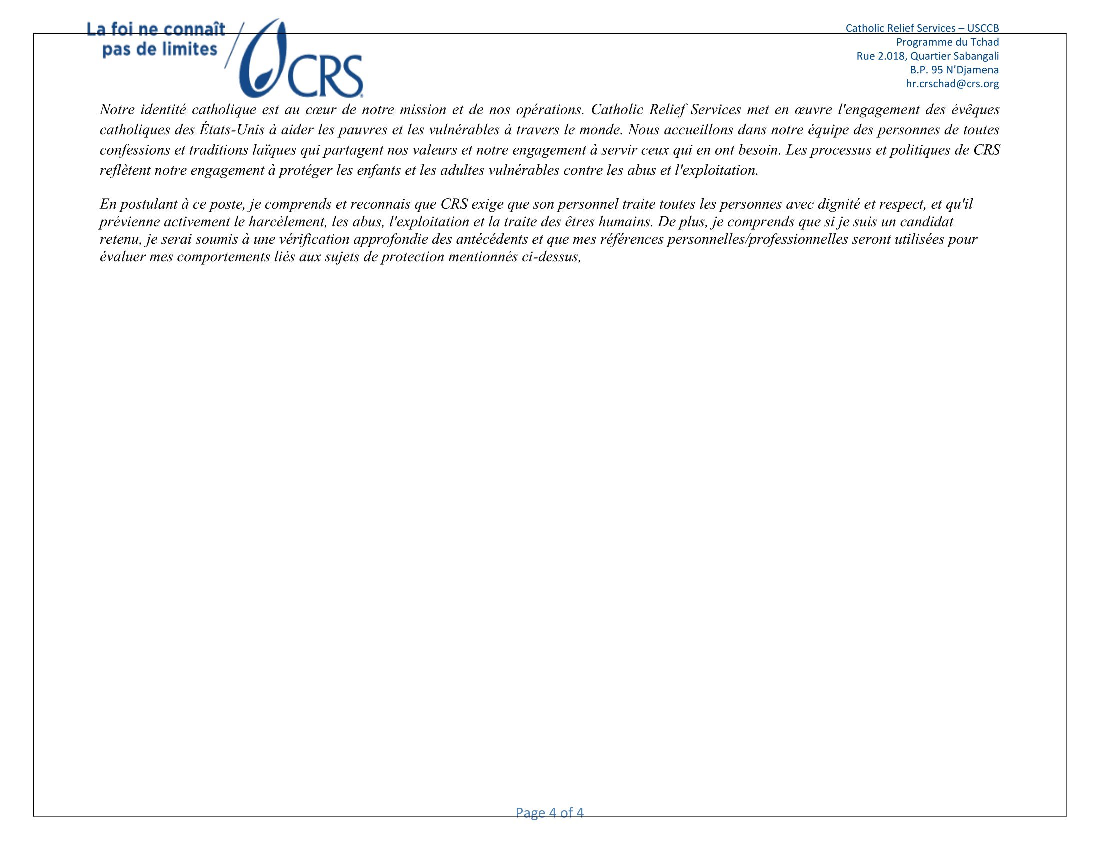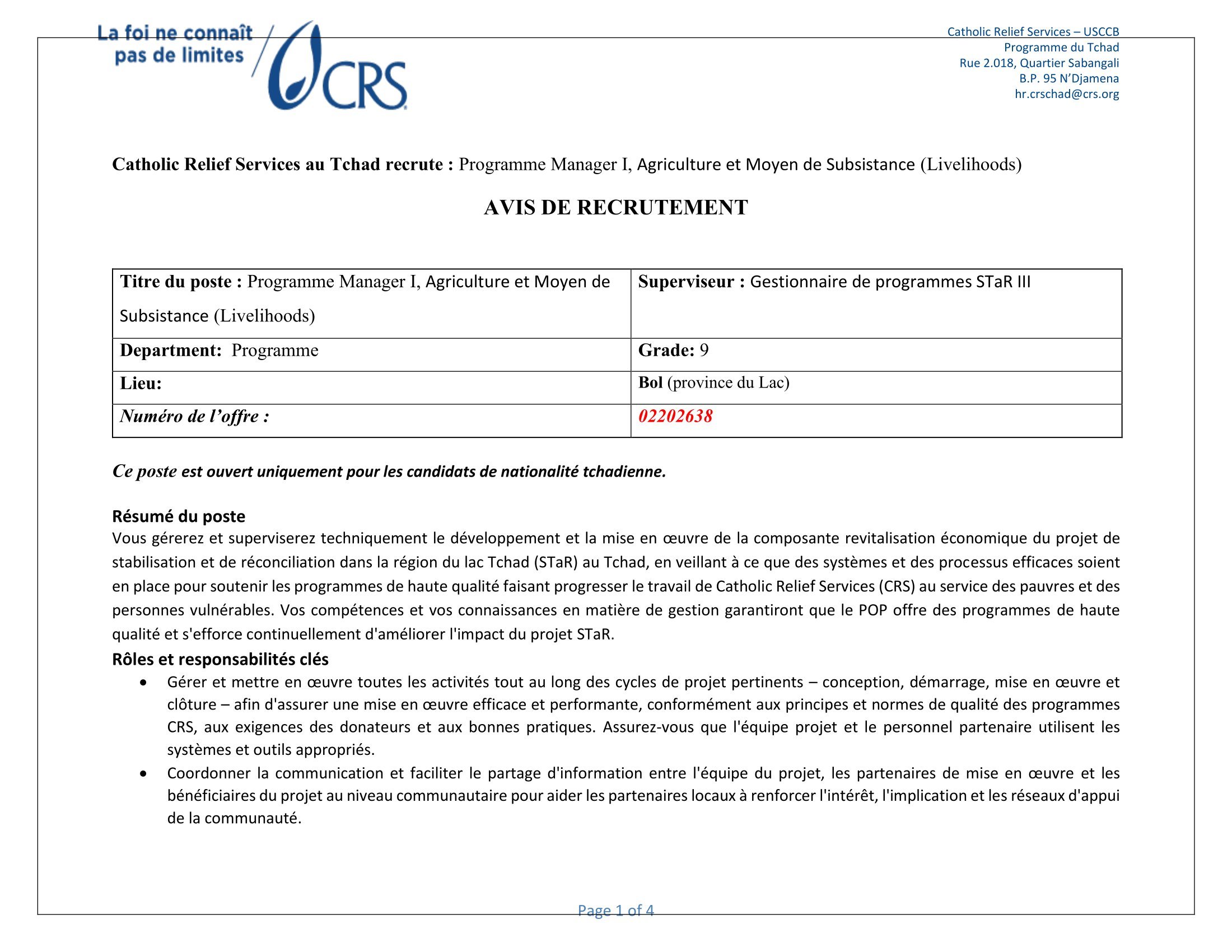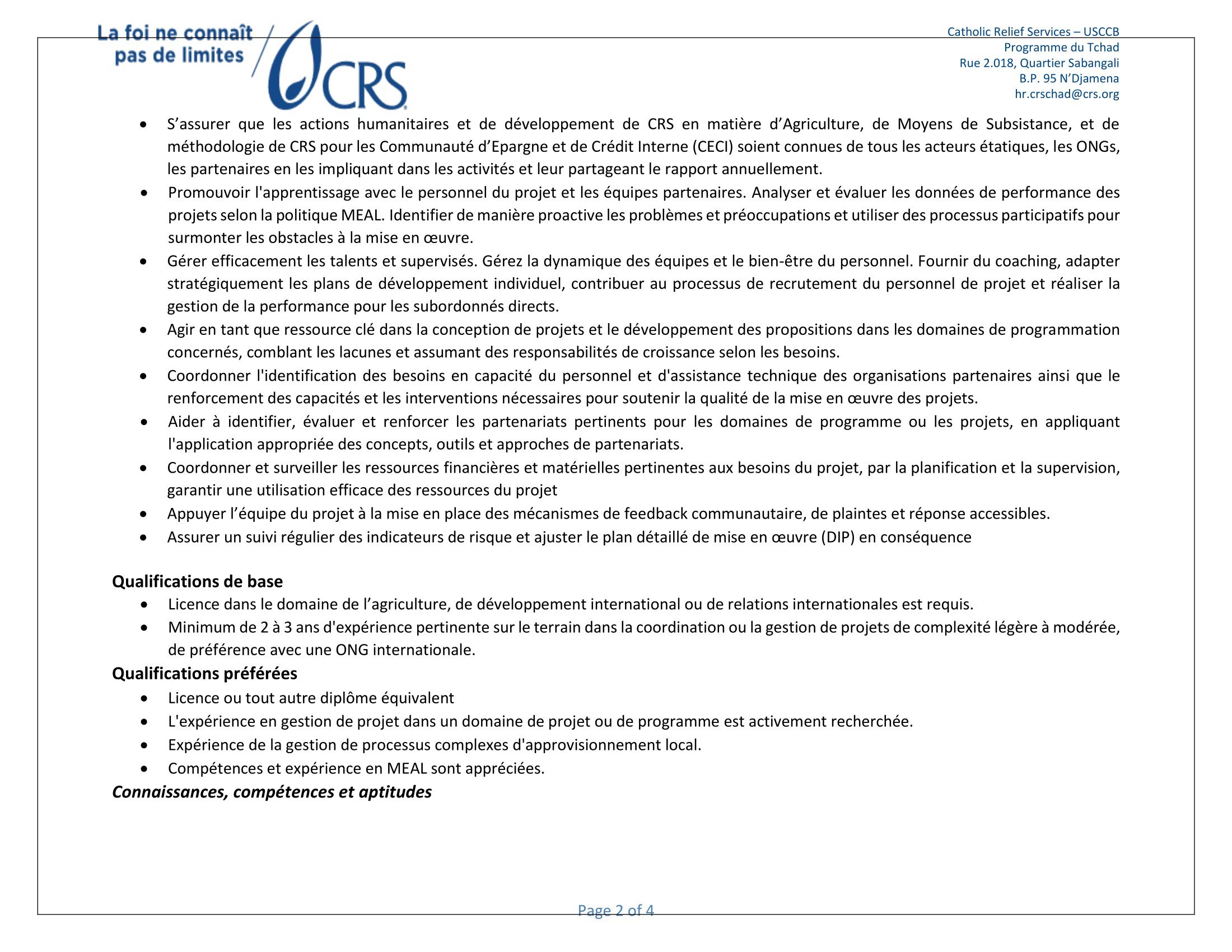 Accueil » Opportunités » Afrique » Tchad » Catholic Relief Services (CRS) au Tchad recrute un(e) Programme Manager, Agriculture et Moyens de Subsistance, Poste basé au Lac (Bol)