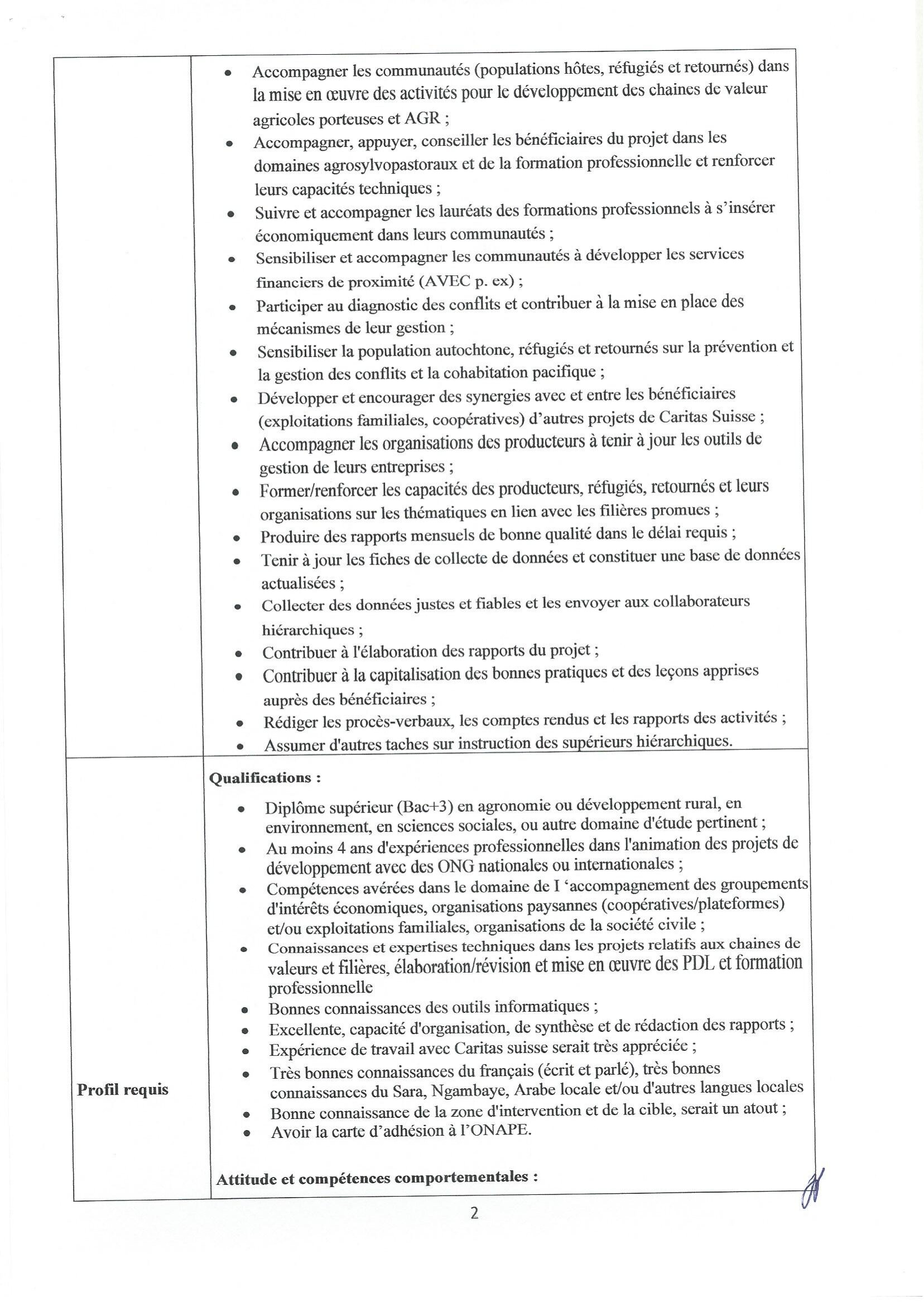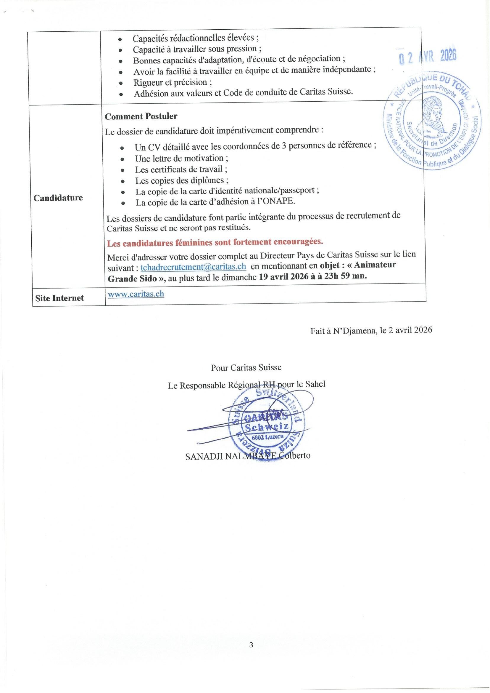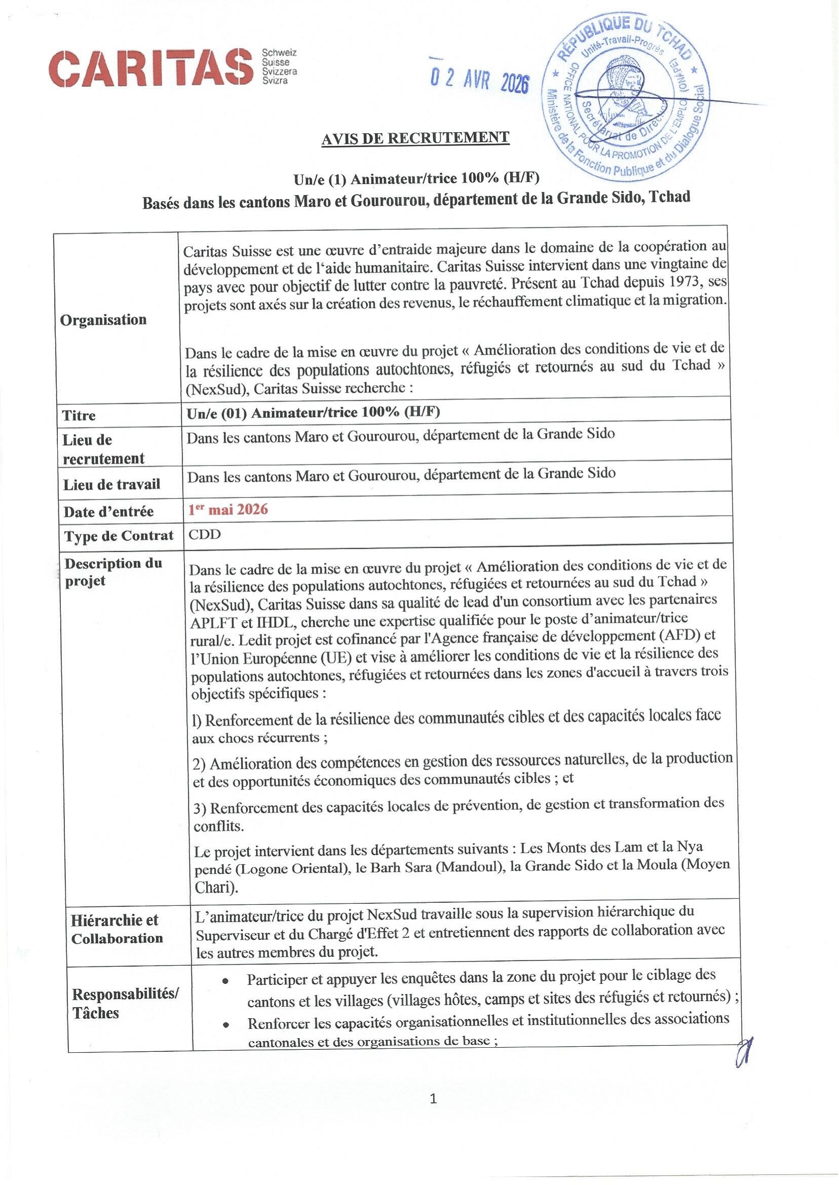 Accueil » Opportunités » Afrique » Tchad » La Caritas Suisse lance un avis de recrutement d’un(e) Animateur(rice) basé(e) dans le département de la Grande Sido, Tchad