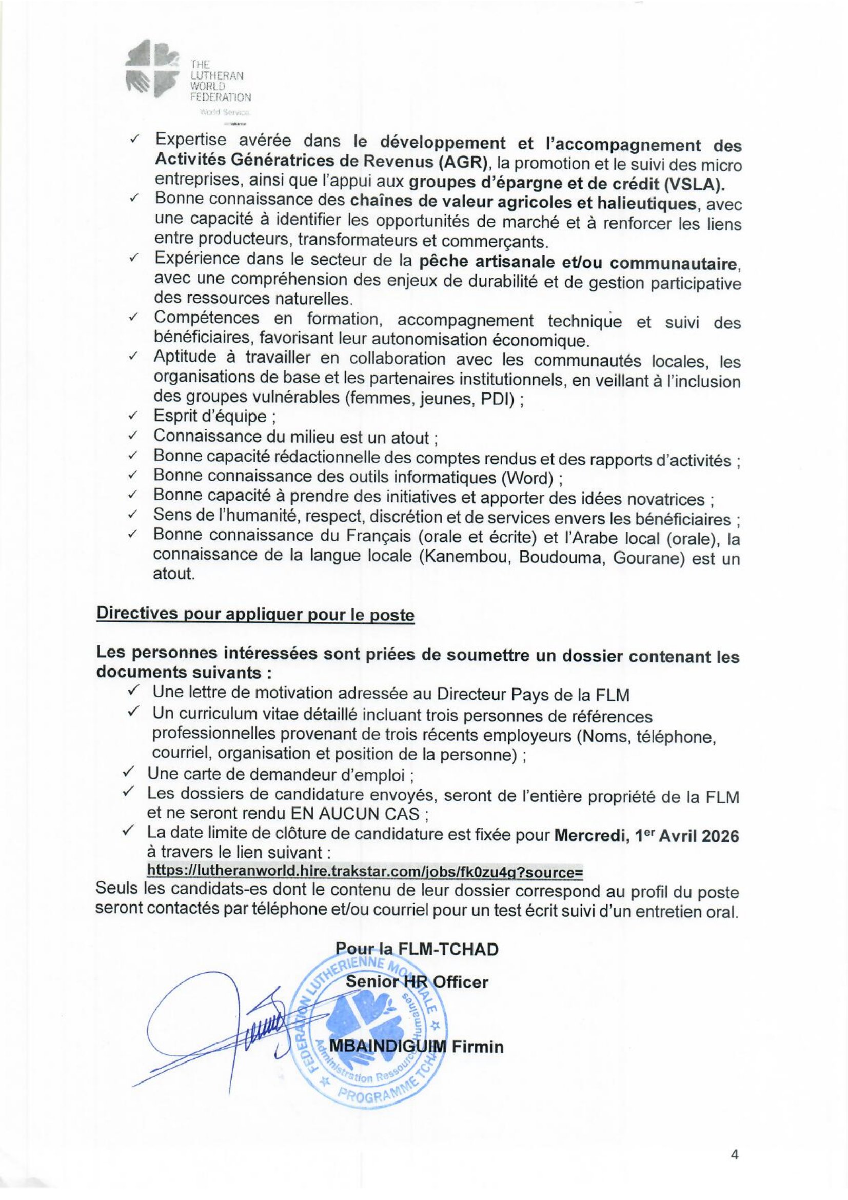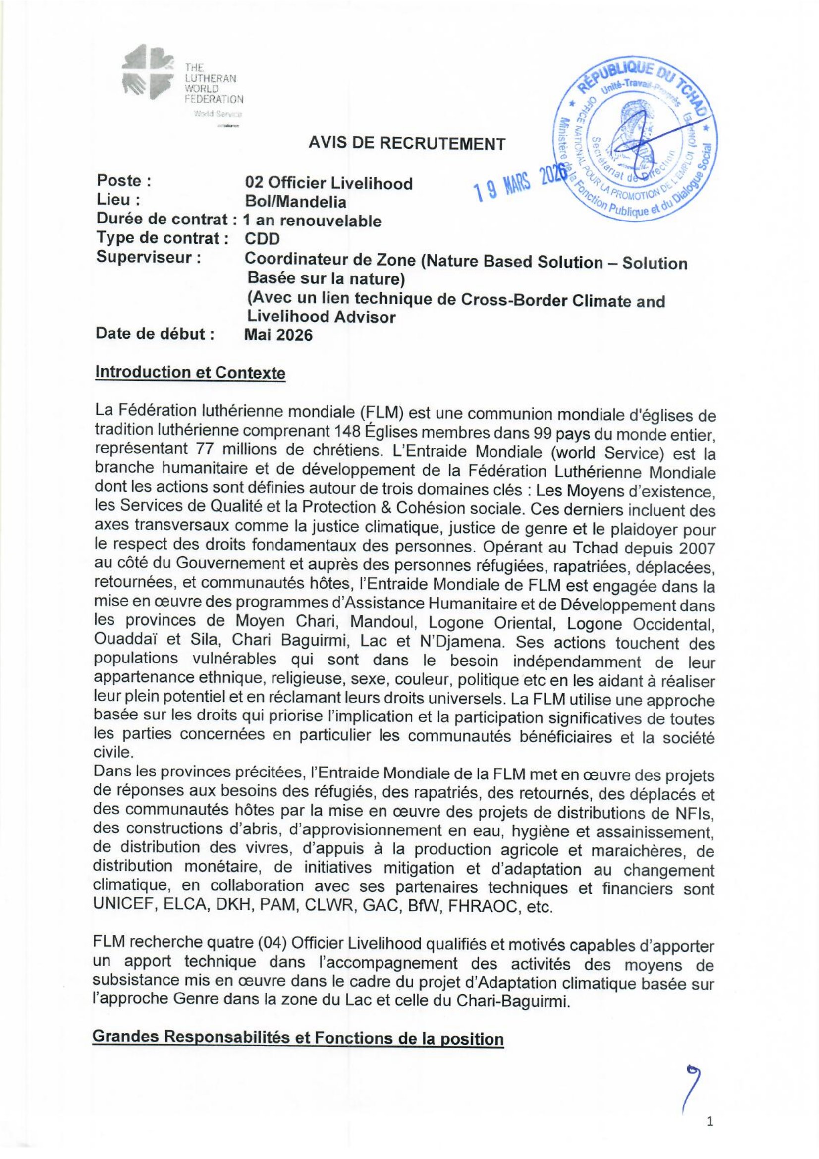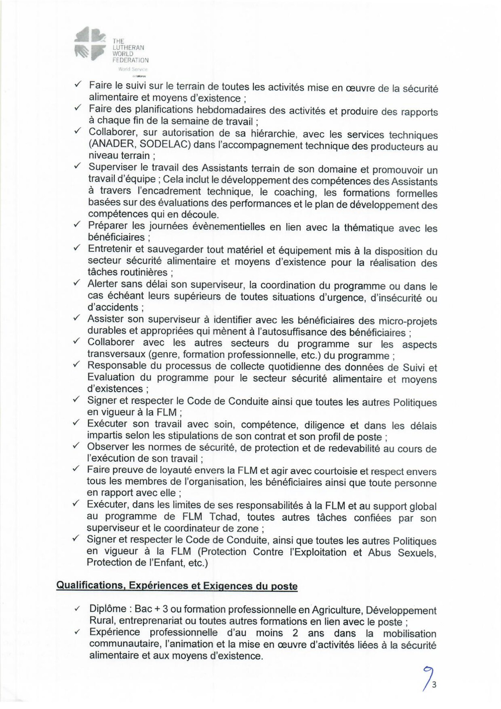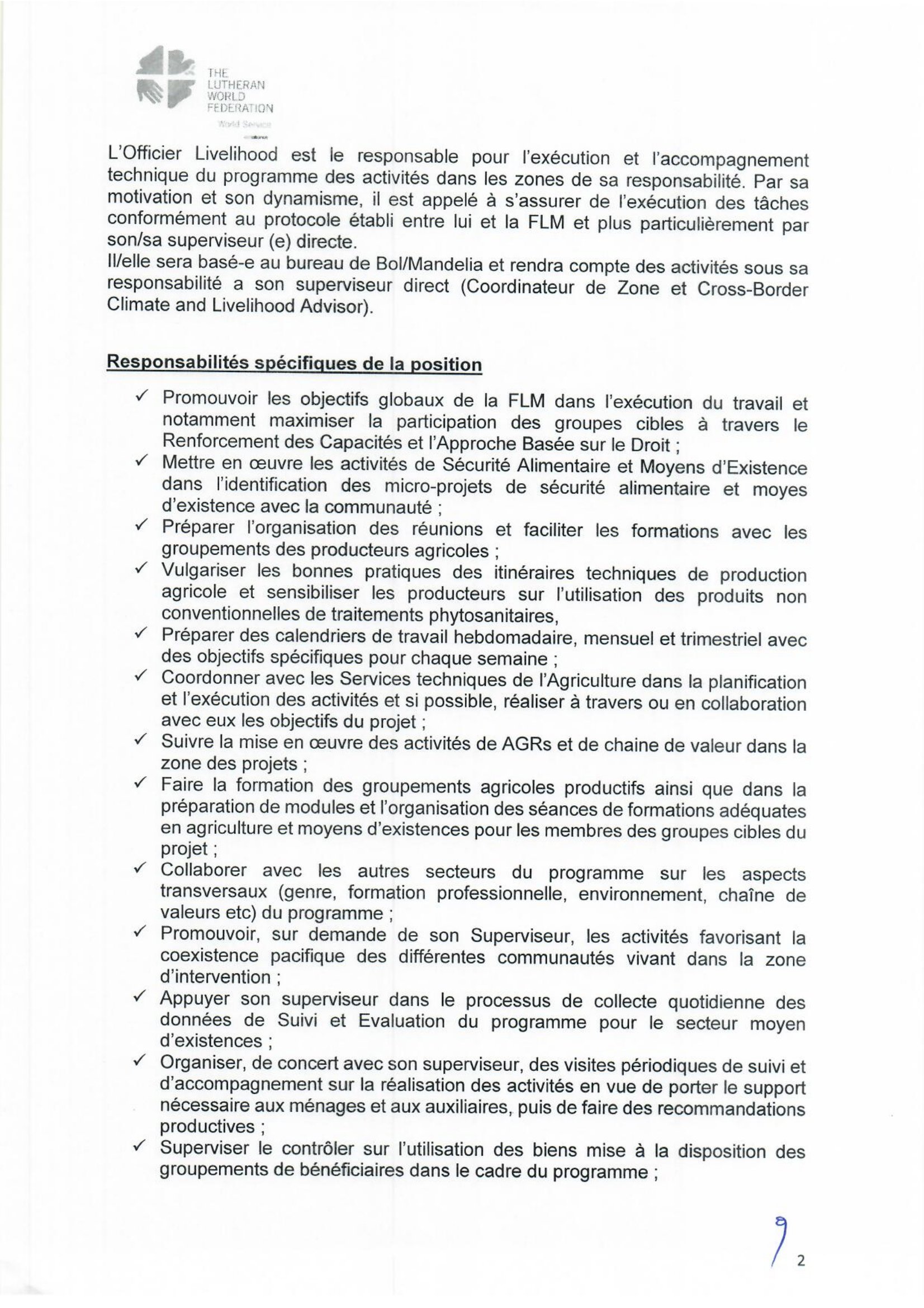 Accueil » Opportunités » Afrique » Tchad » La Fédération Luthérienne Mondiale (FLM) au Tchad recherche 2 Responsables des Moyens de subsistance, poste basés à Bol/Mandelia