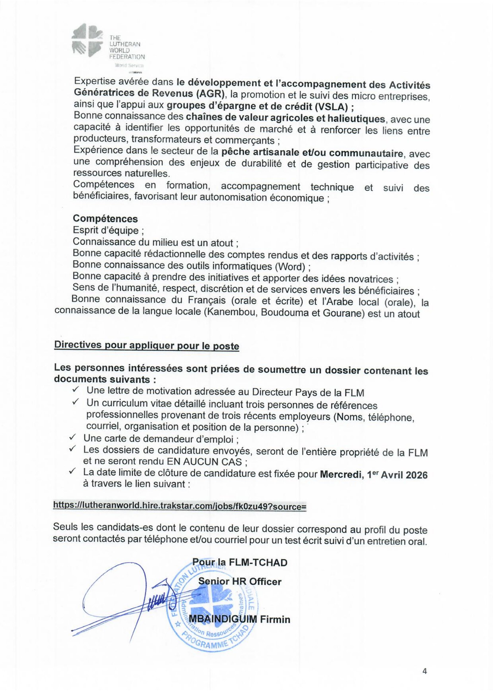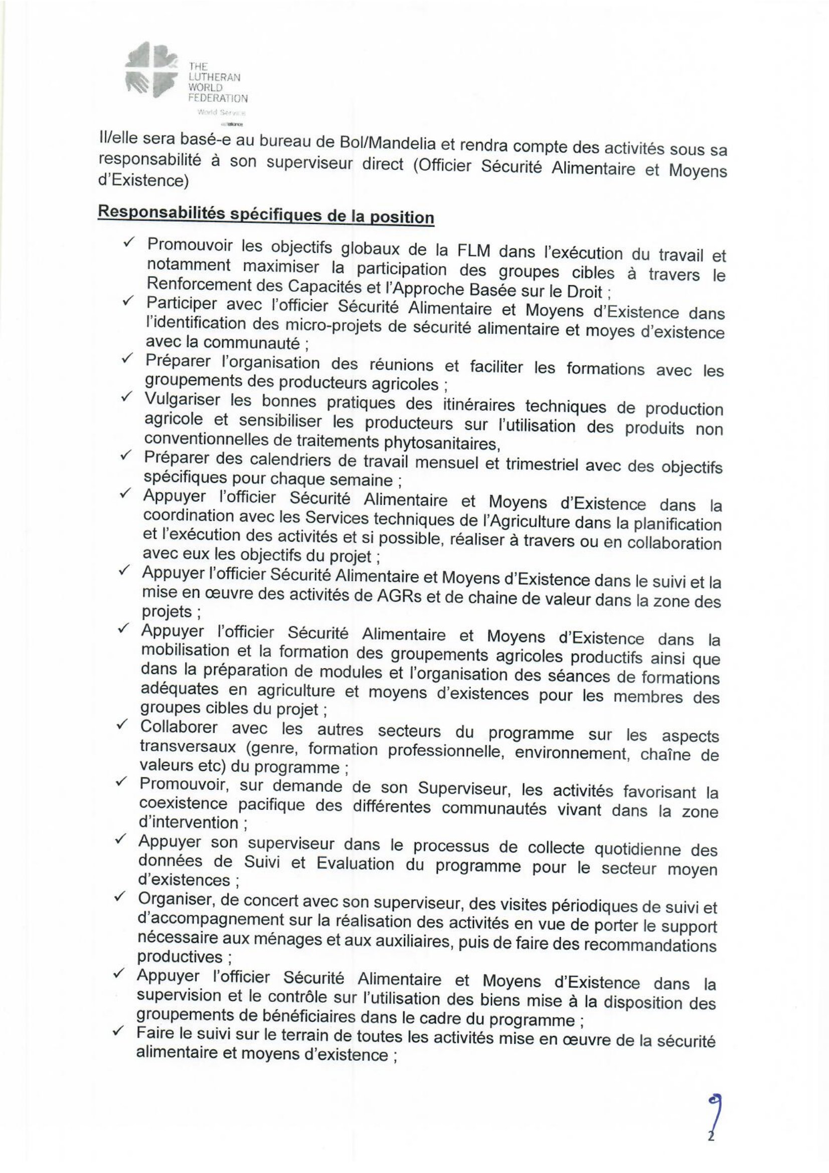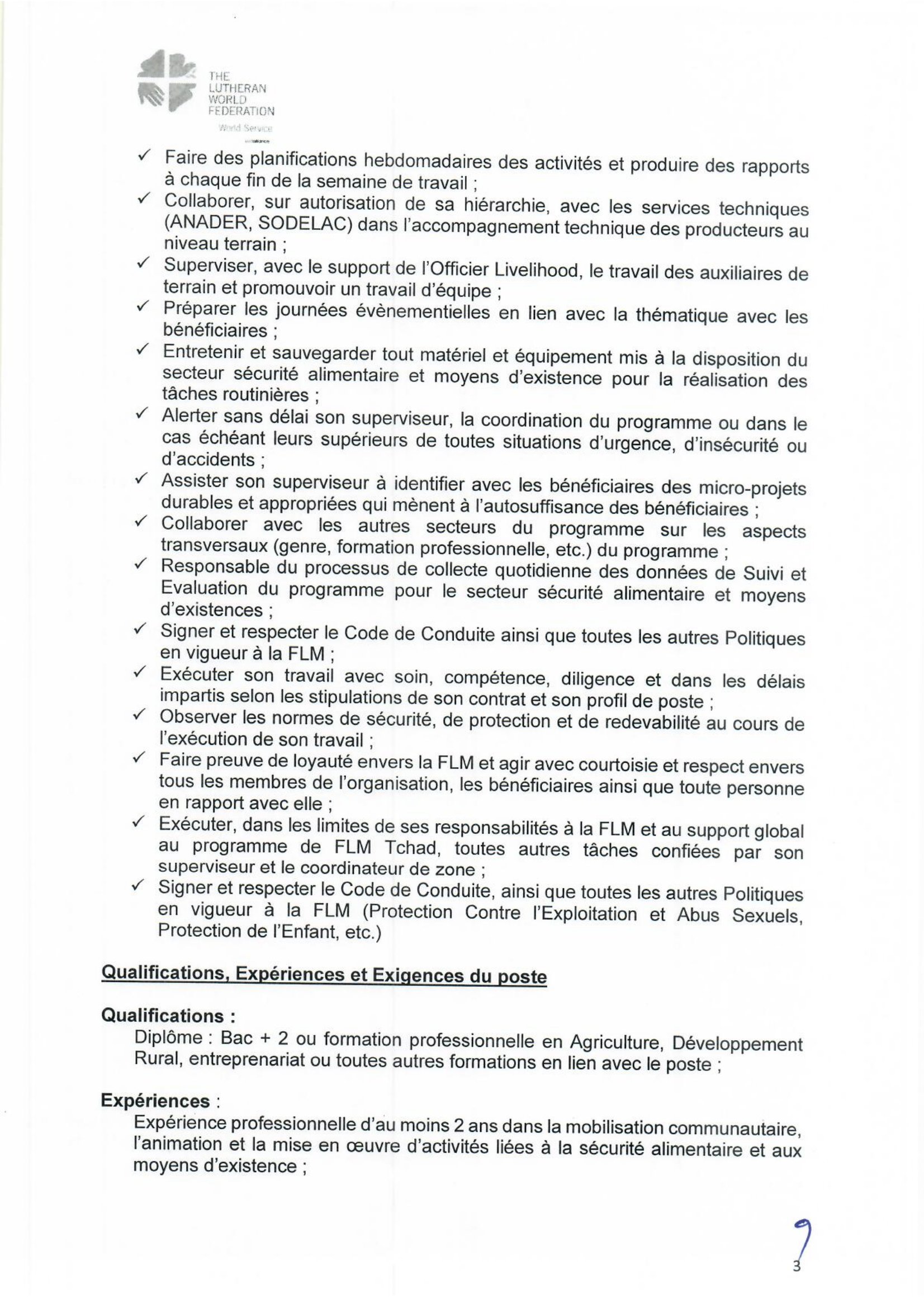 Accueil » Opportunités » Afrique » Tchad » La Fédération Luthérienne Mondiale (FLM) au Tchad recherche 4 Assistants Terrain des Moyens de subsistance, poste basés à Bol/Mandelia