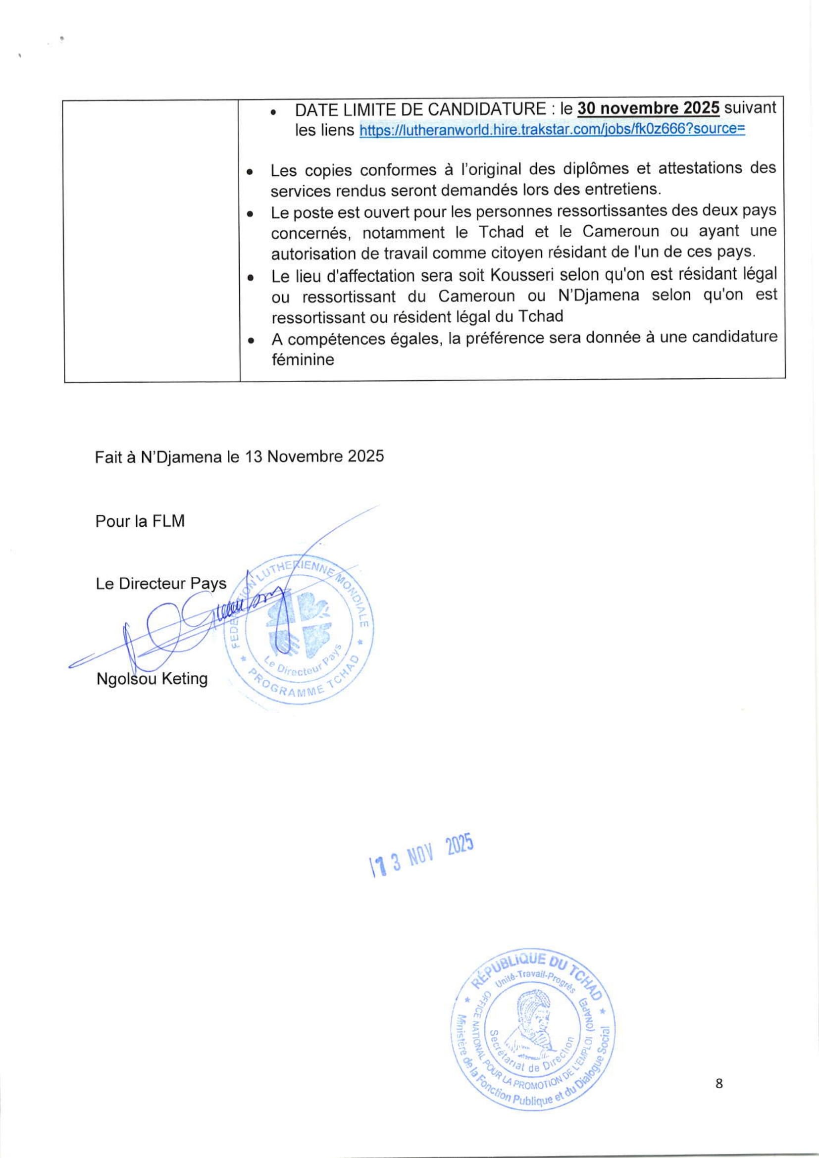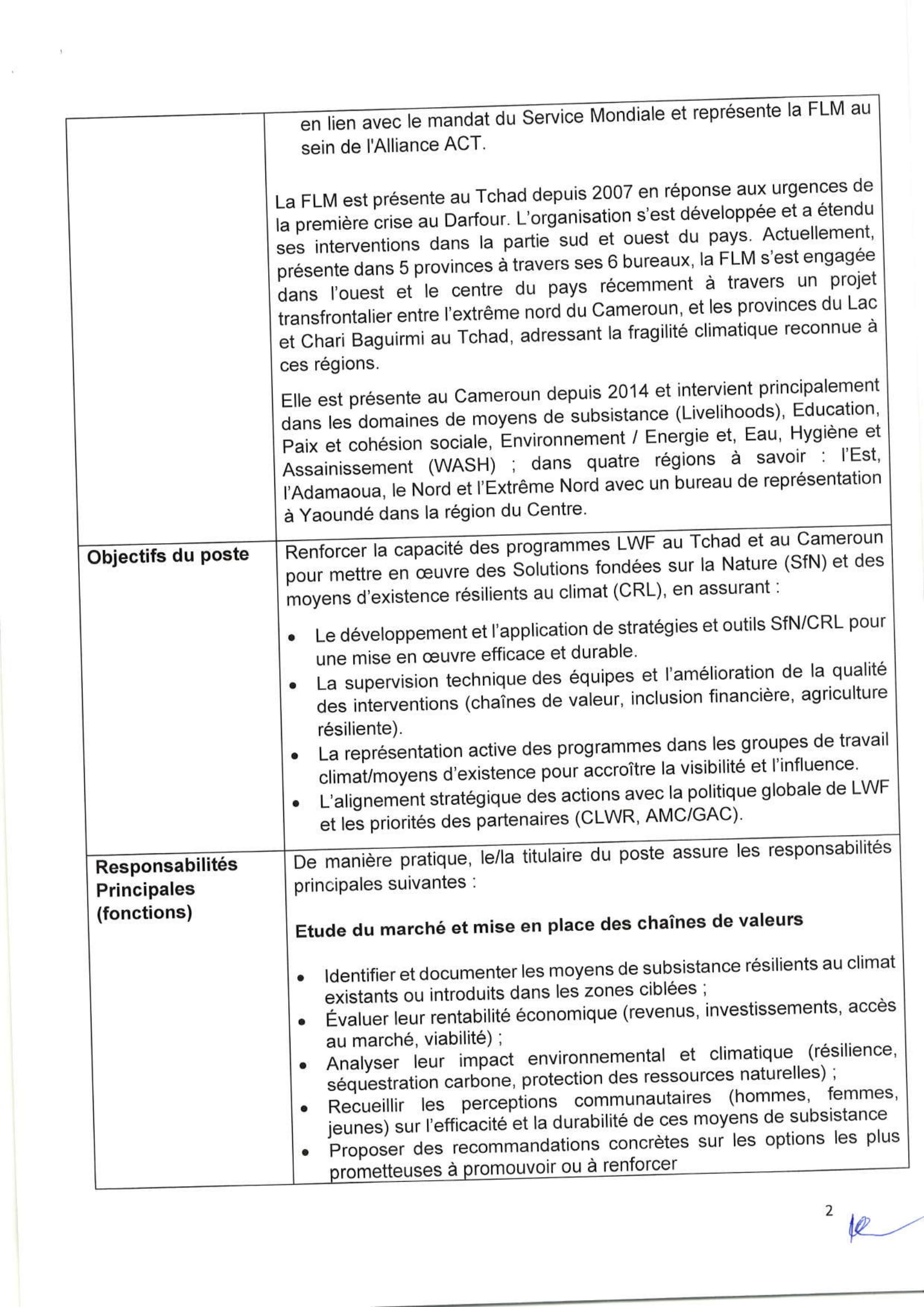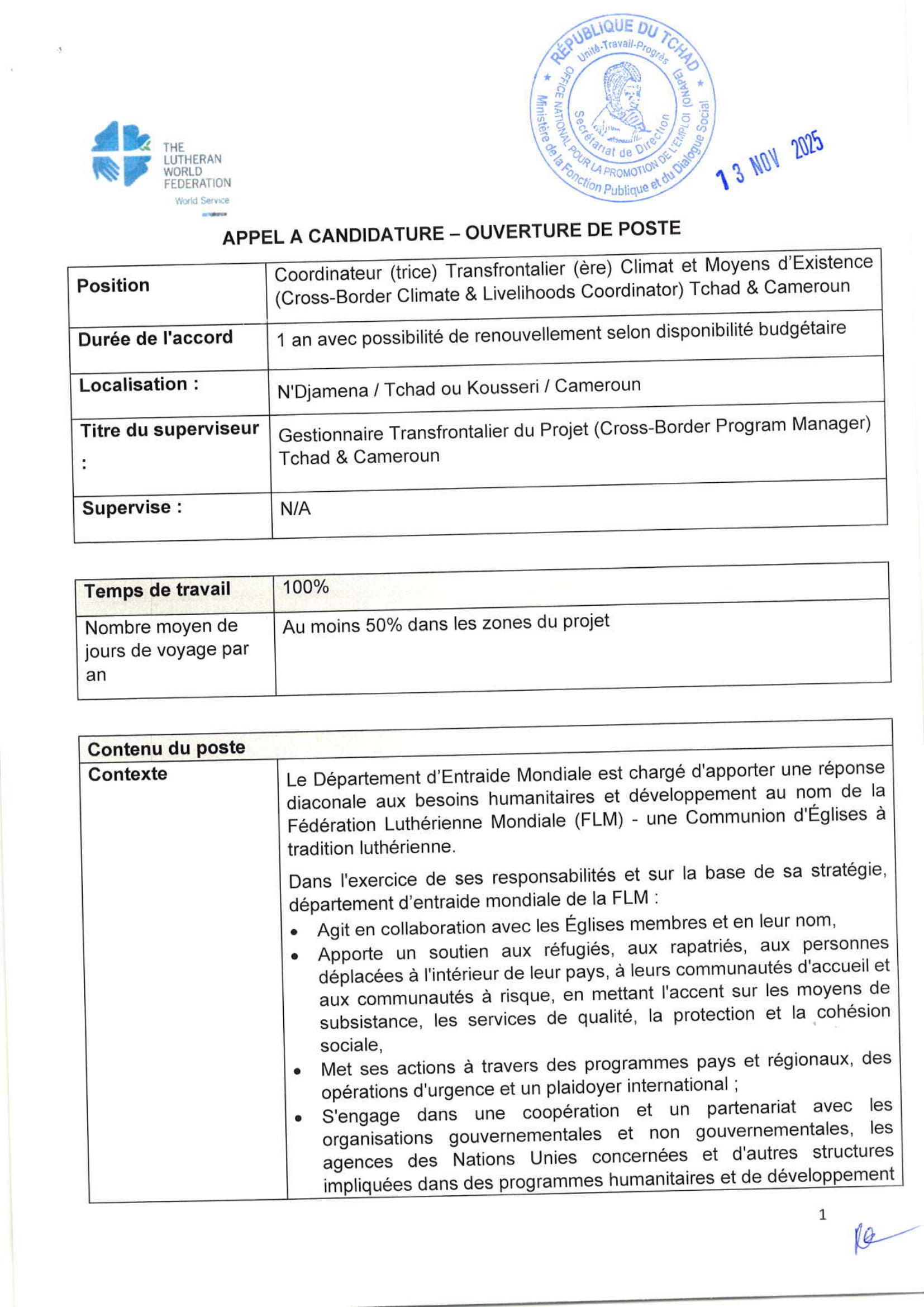 Accueil » Opportunités » Afrique » Tchad » La Fédération Luthérienne Mondiale (FLM) recrute un(e) Coordinateur(trice) Transfrontalier(ère) Climat et Moyens d’Existence, Tchad/Cameroun