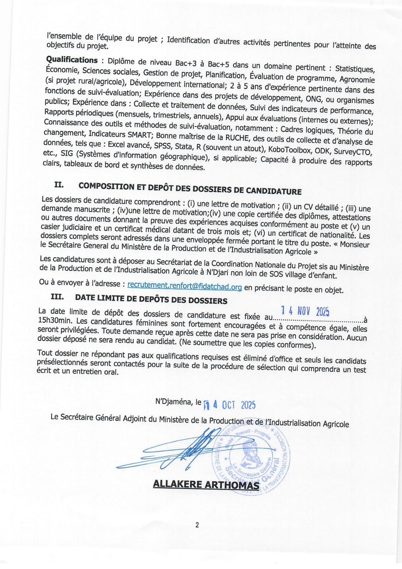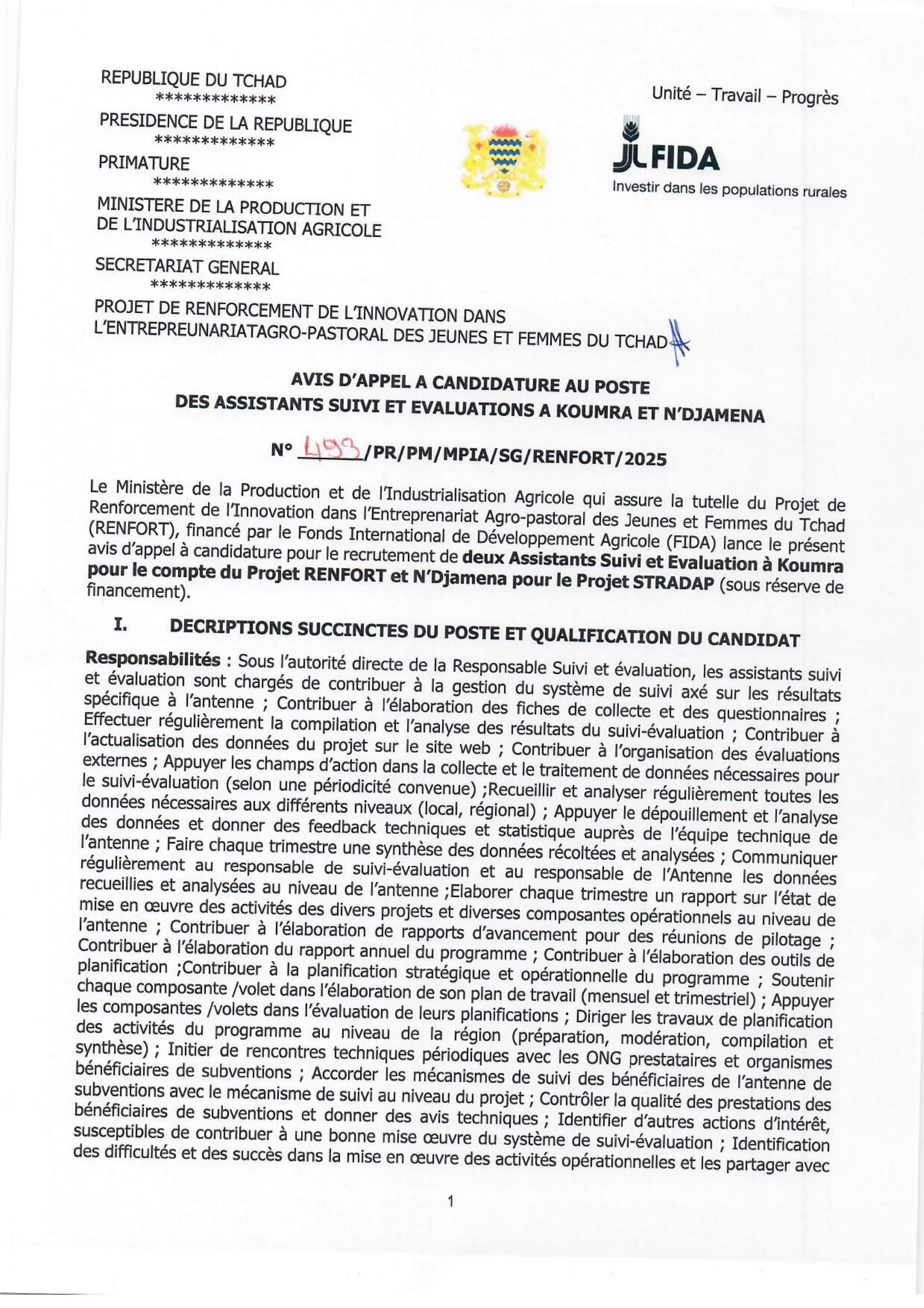 Accueil » Opportunités » Afrique » Tchad » Avis de recrutement des Assistants Suivi et Evaluation du Ministère de la Production et de l’Industrialisation Agricole du Tchad, N’Djamena et Koumra