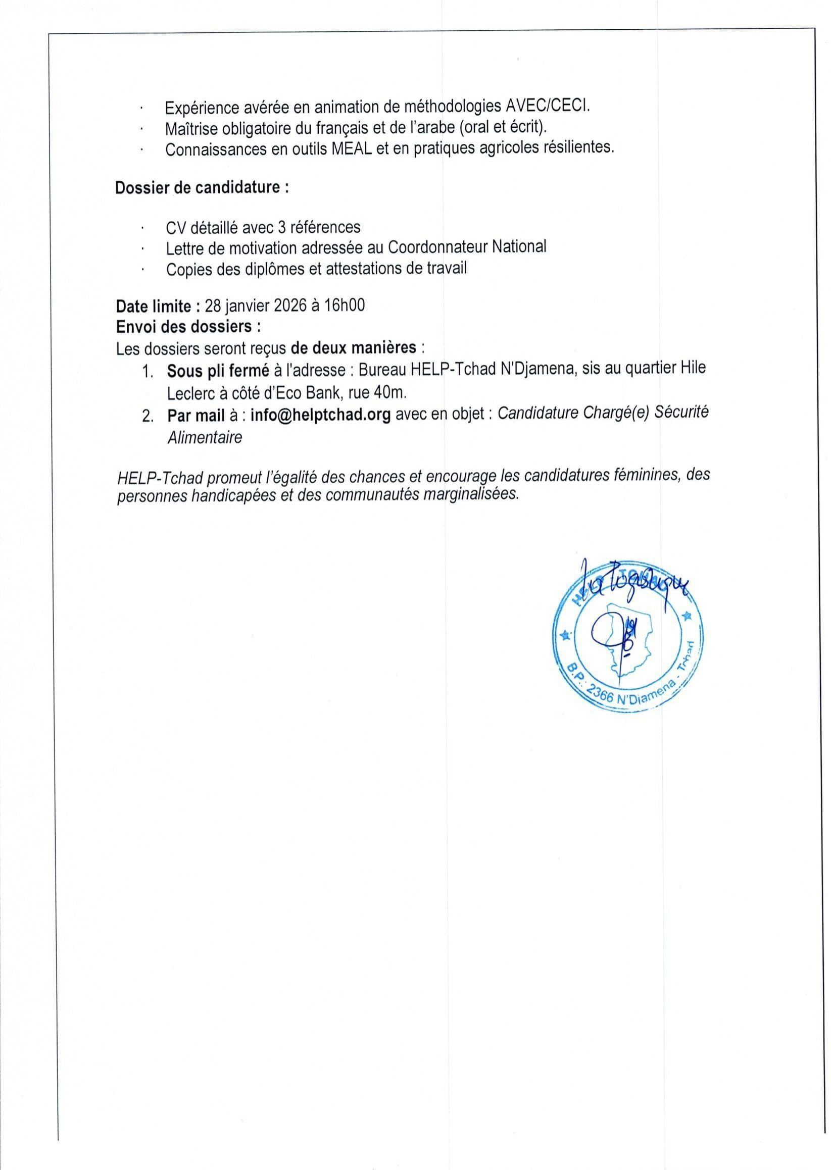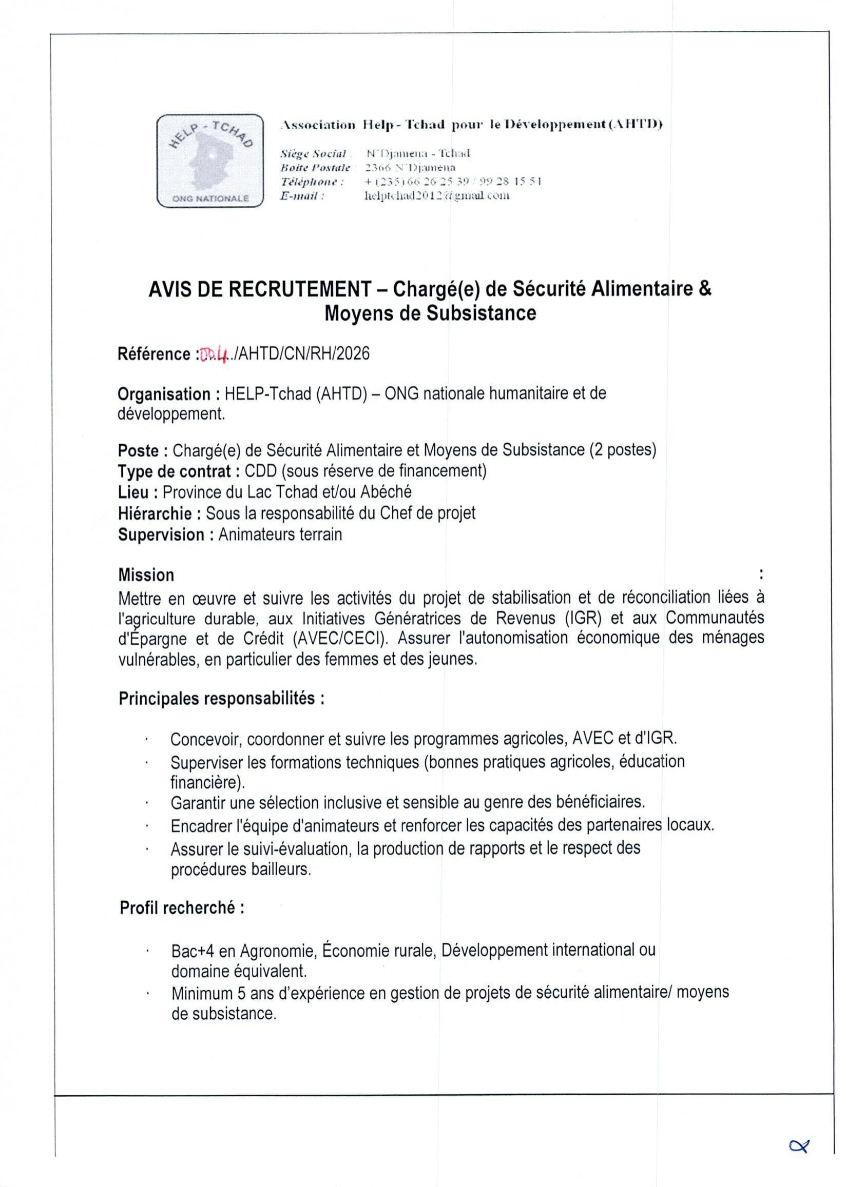Accueil » Opportunités » Afrique » Tchad » HELP-Tchad recrute un(e) Chargé(e) de Sécurité Alimentaire & Moyens de subsistance, Lac/Abéché