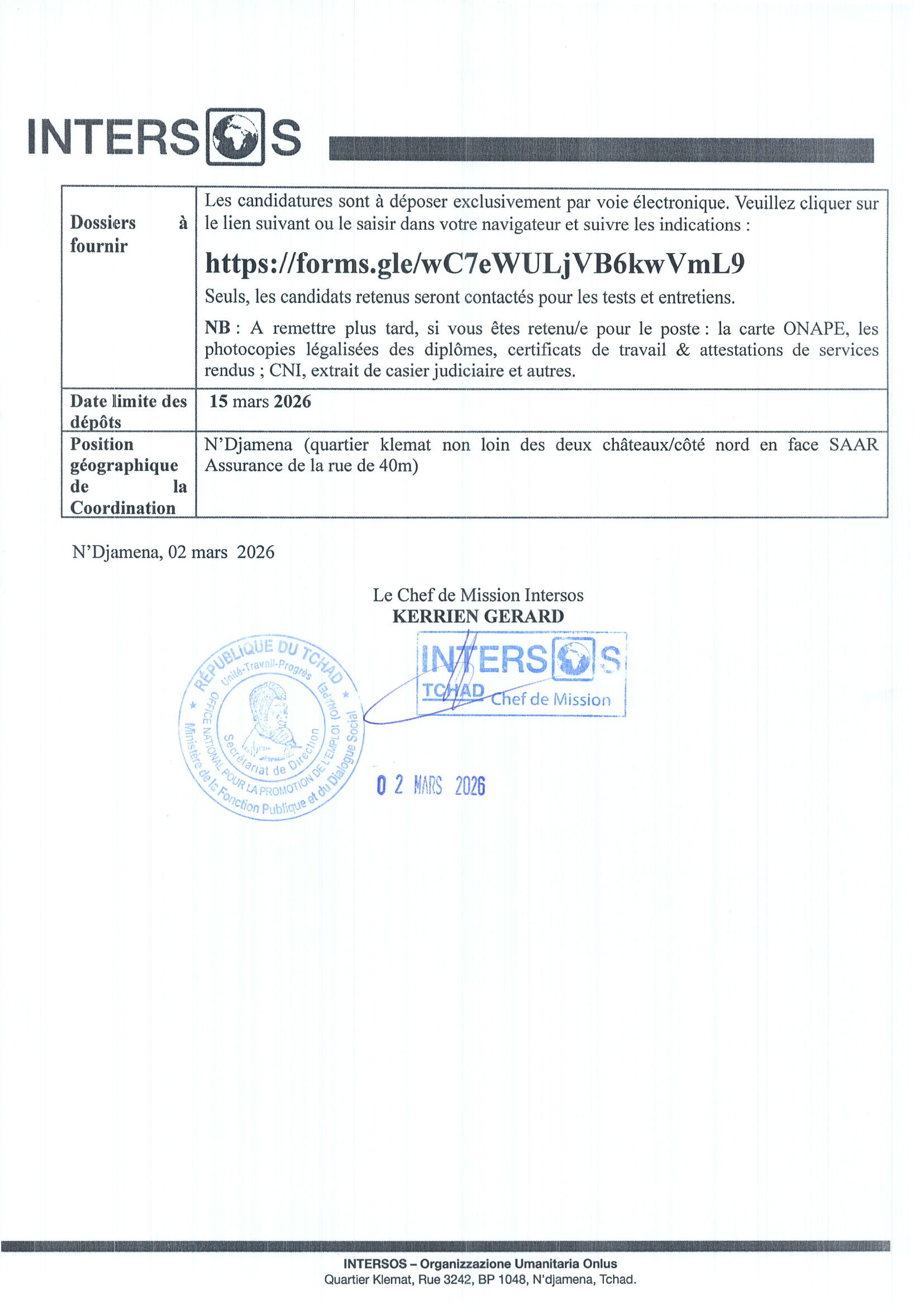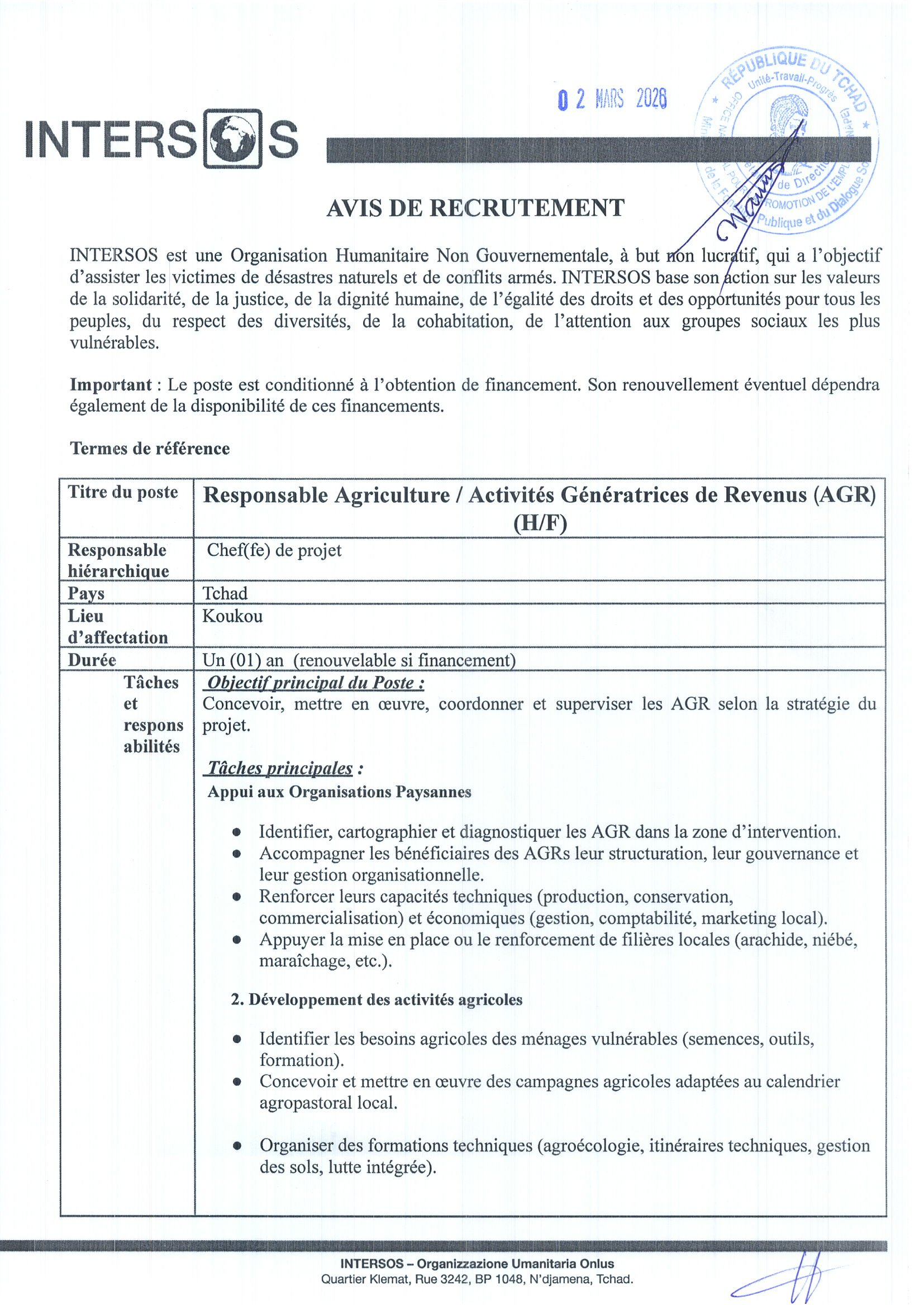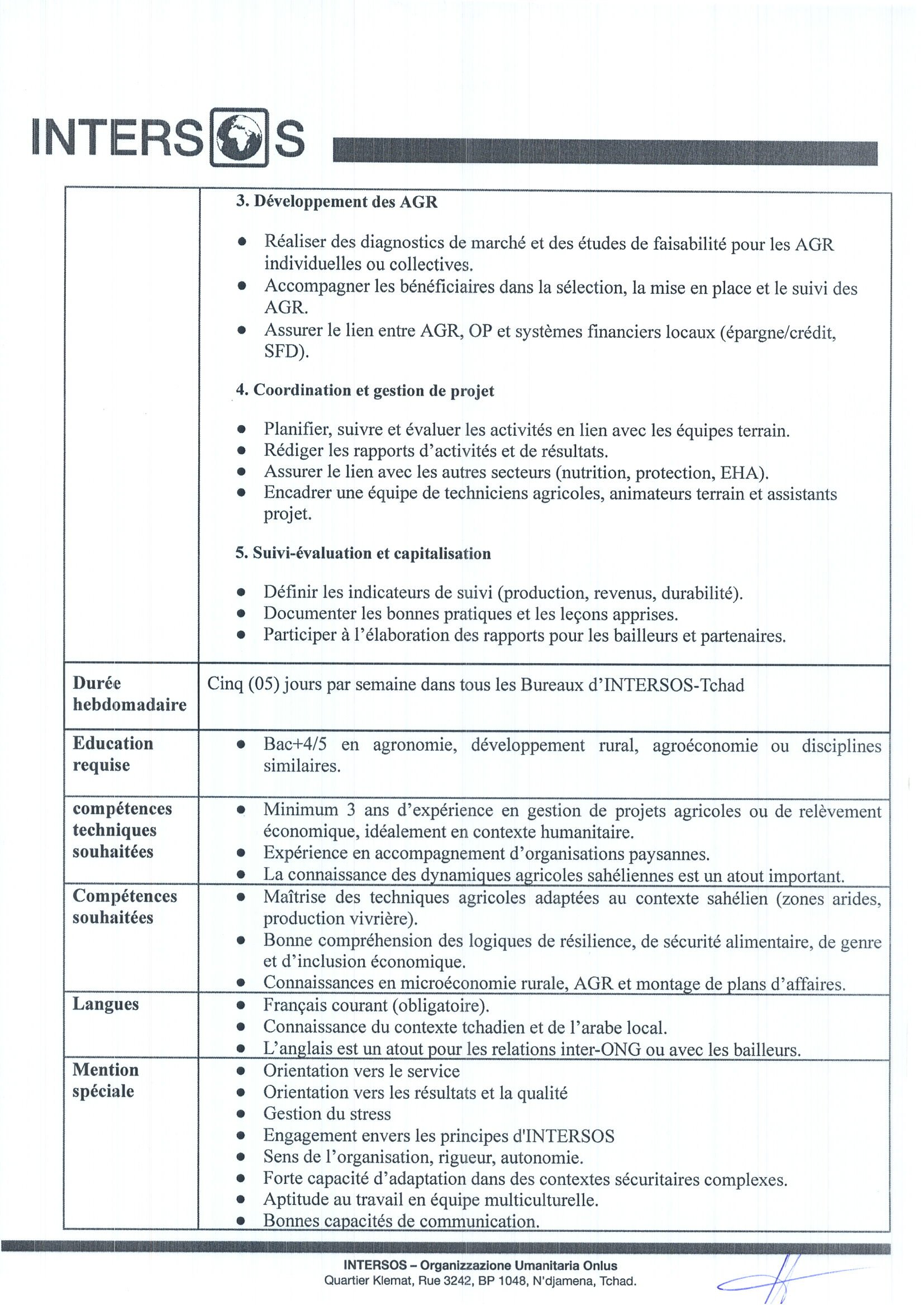 Accueil » Opportunités » Afrique » Tchad » INTERSOS recrute un(e) Responsable Agriculture / Activités Génératrices de Revenus (AGR), poste basé à Koukou