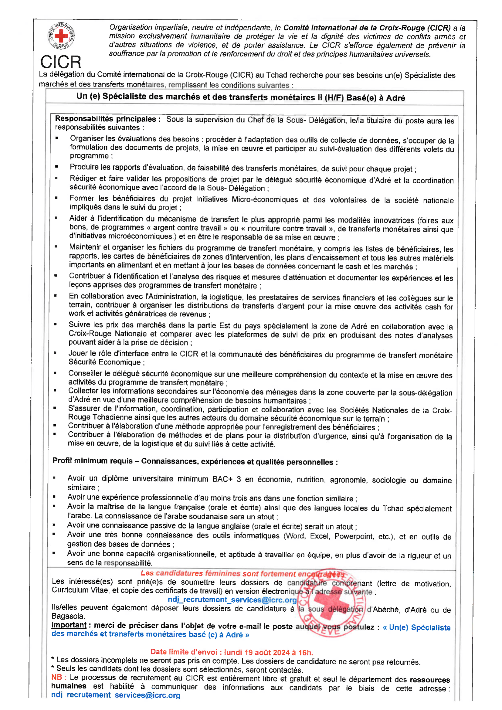 L e Comité International de la Croix-Rouge au Tchad (CICR) recherche un(e) Spécialiste des marchés monétaires, Adré, Tchad