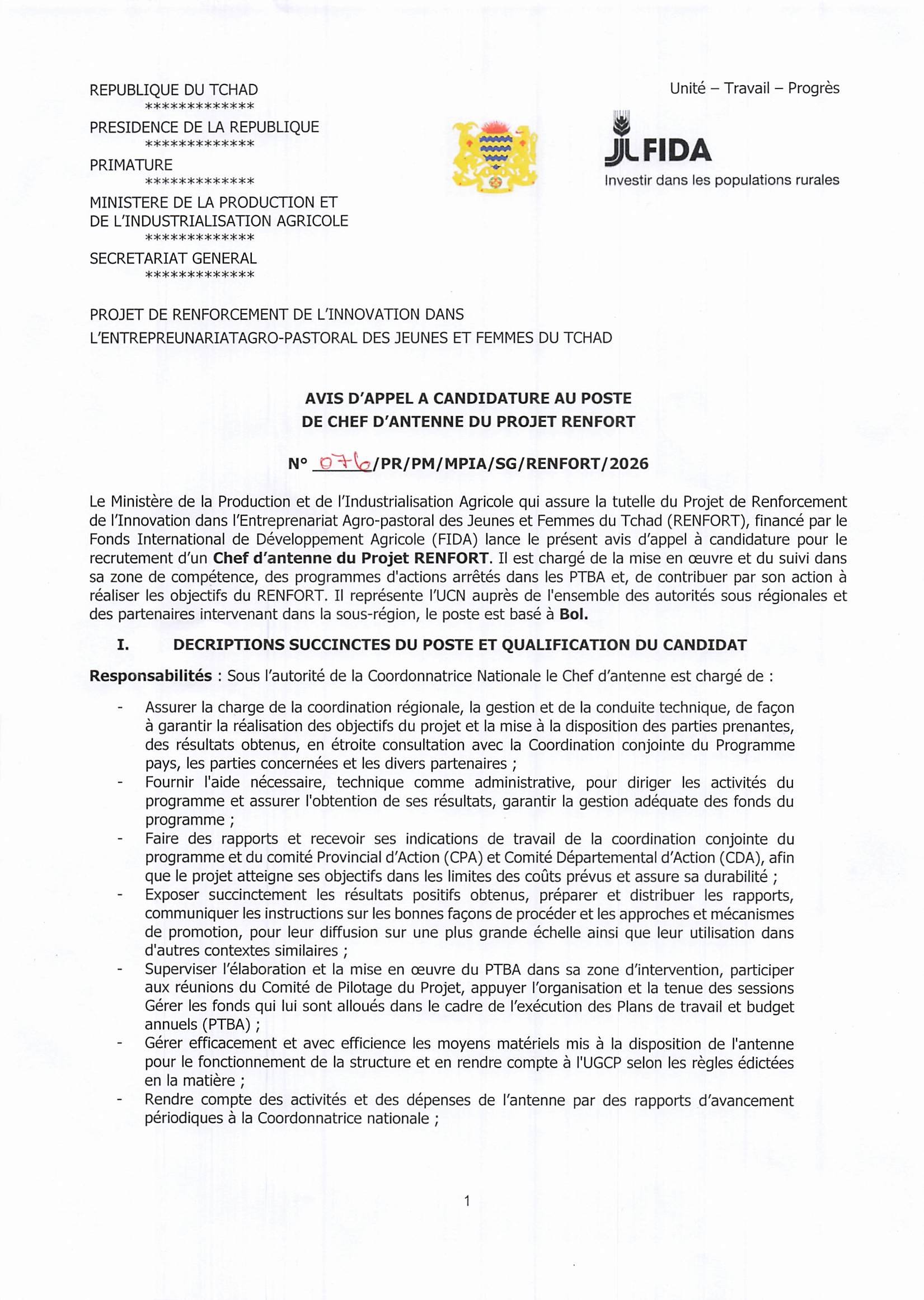 Accueil » Opportunités » Afrique » Tchad » Le Ministère de la Production et de l’Industrialisation Agricole du Tchad recherche un Chef d’antenne du projet RENFORT à Bol