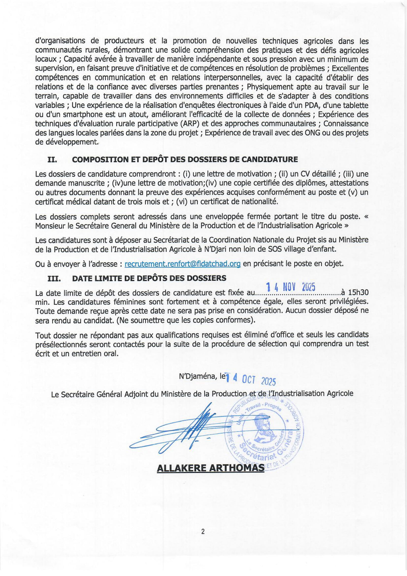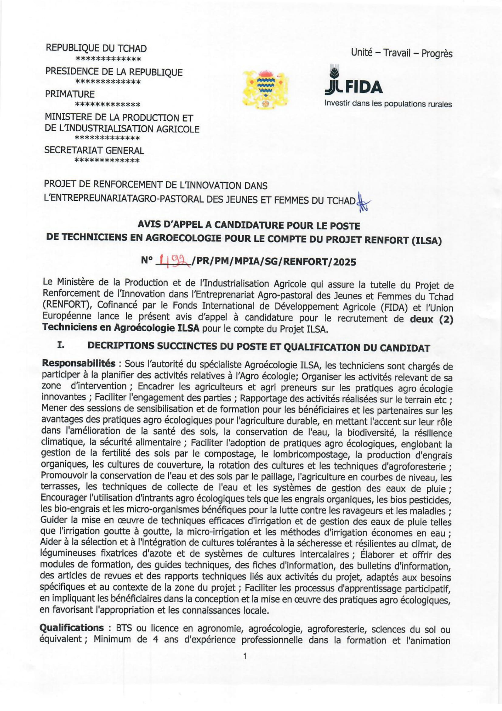 Accueil » Opportunités » Afrique » Tchad » Le Ministère de la Production et de l’Industrialisation Agricole du Tchad recrute Deux (02) Techniciens en Agroécologie, N’Djamena