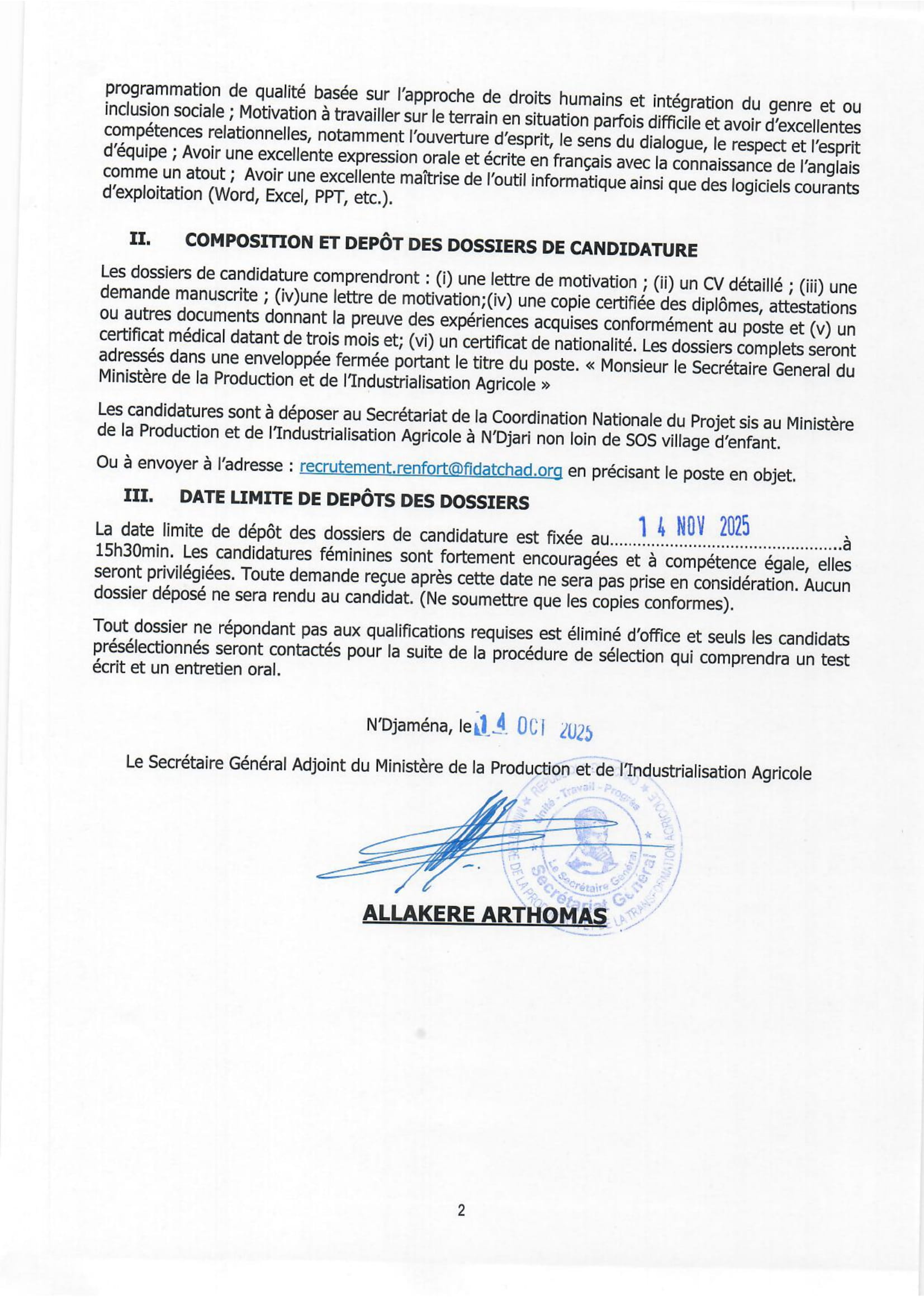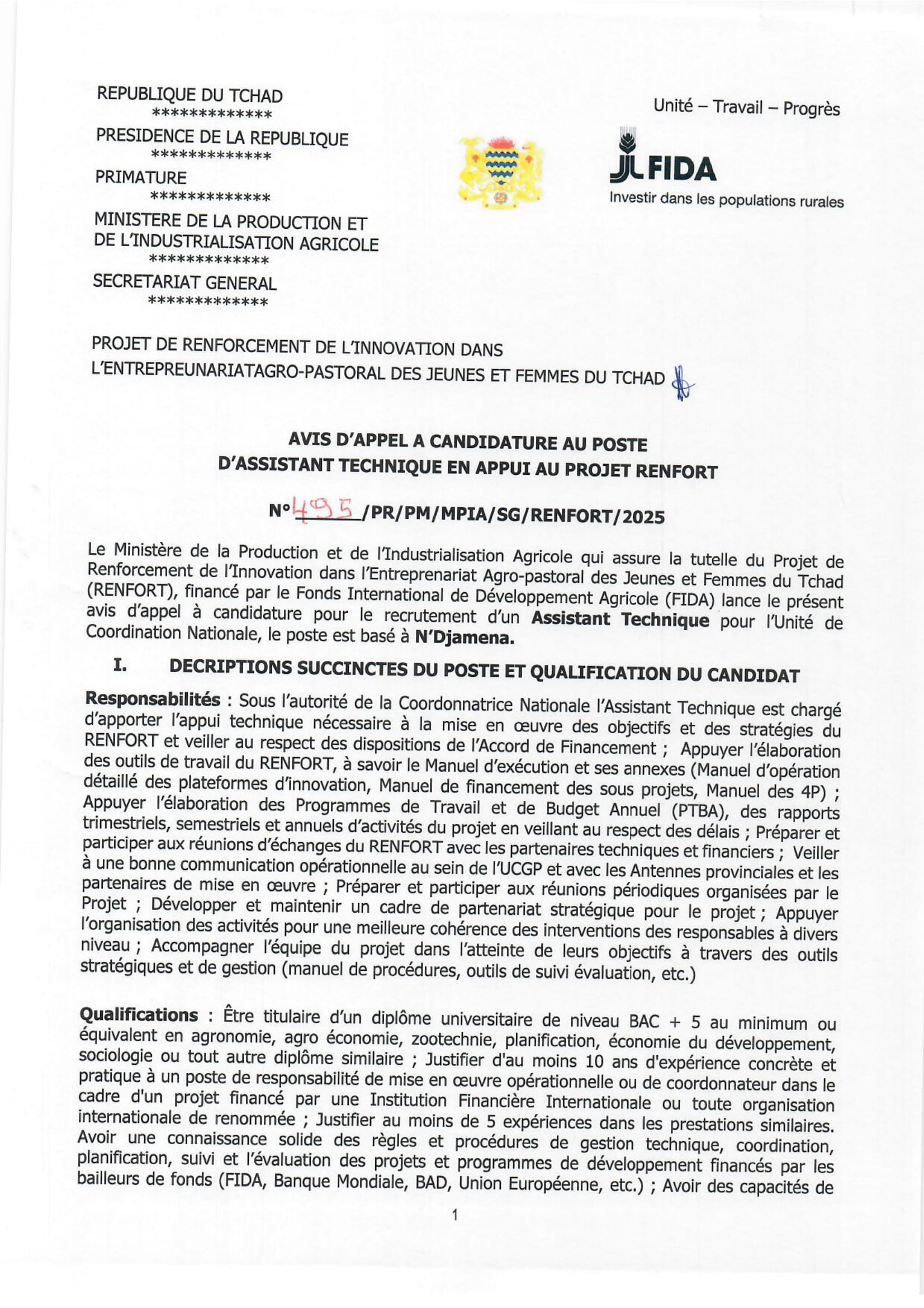 Accueil » Opportunités » Afrique » Tchad » Le Ministère de la Production et de l’Industrialisation Agricole du Tchad recrute un Assistant Technique en Appui au projet RENFORT, N’Djamena