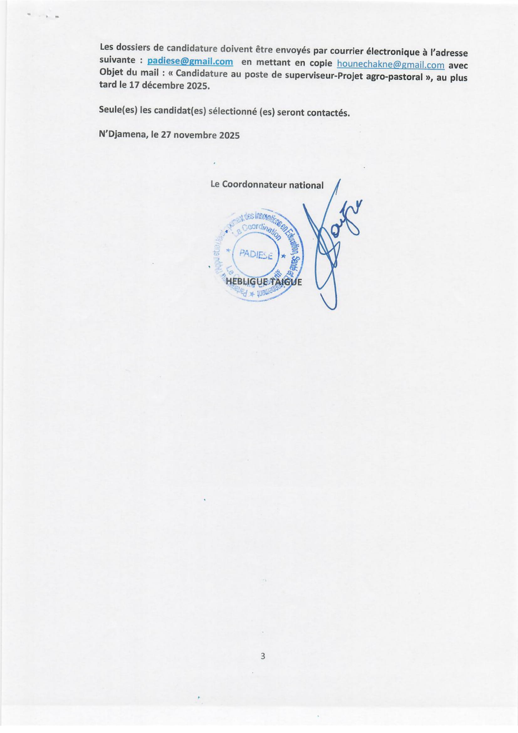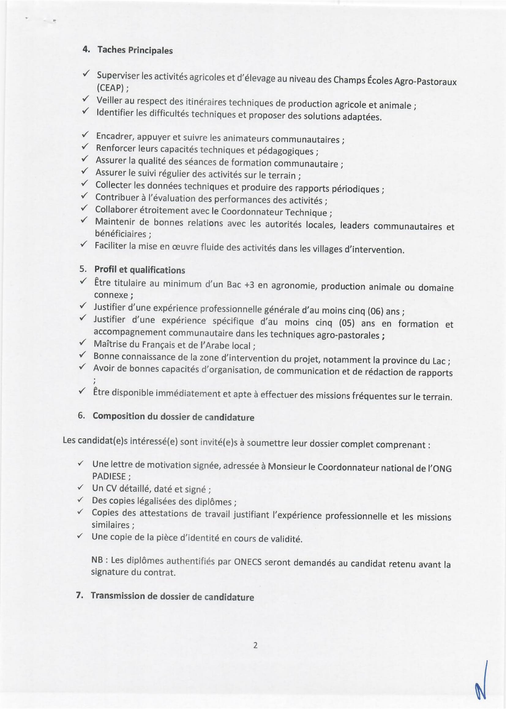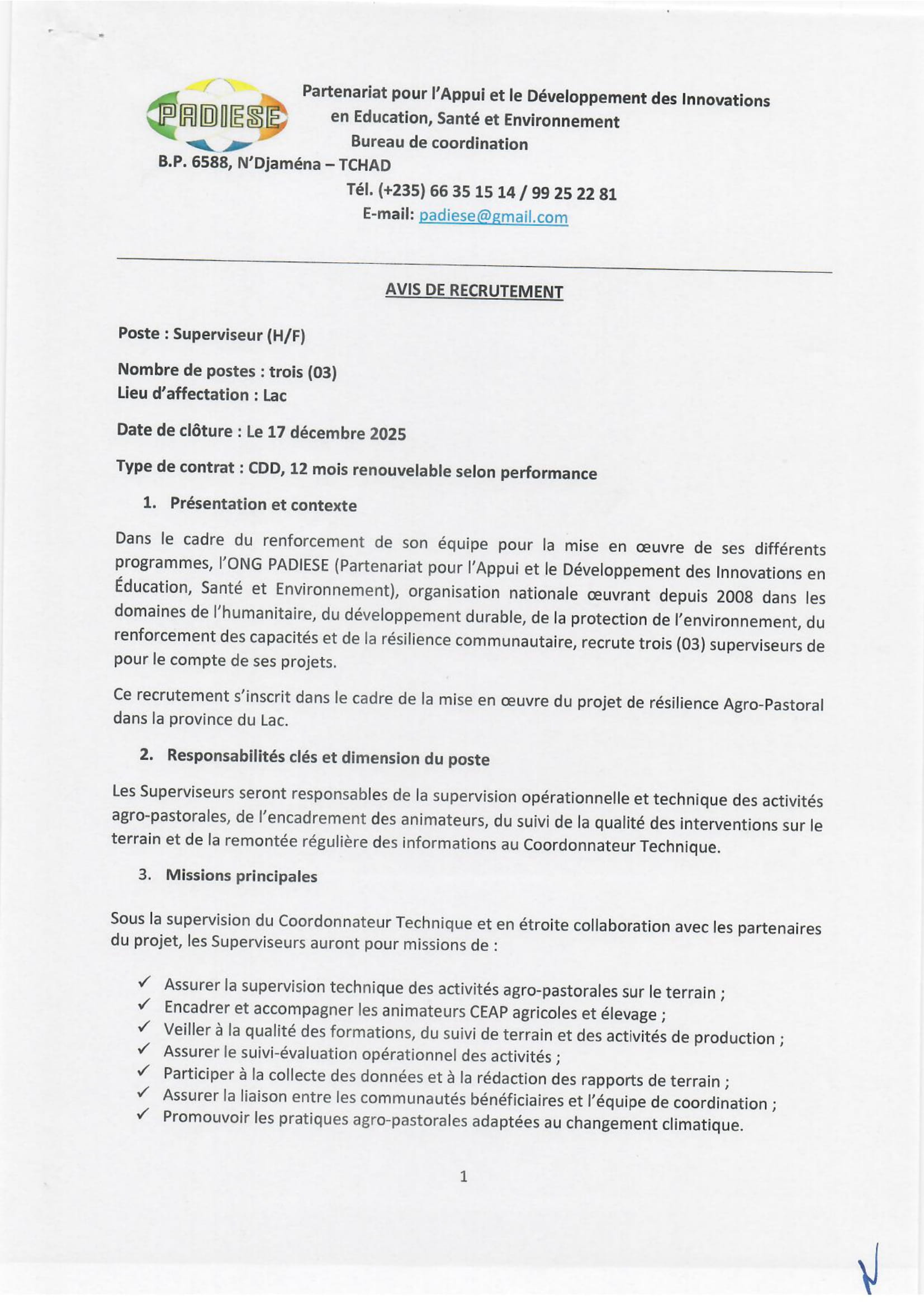 Accueil » Opportunités » Afrique » Tchad » L’ONG PADIESE au Tchad recherche Trois (03) Superviseurs (H/F), postes basés au Lac