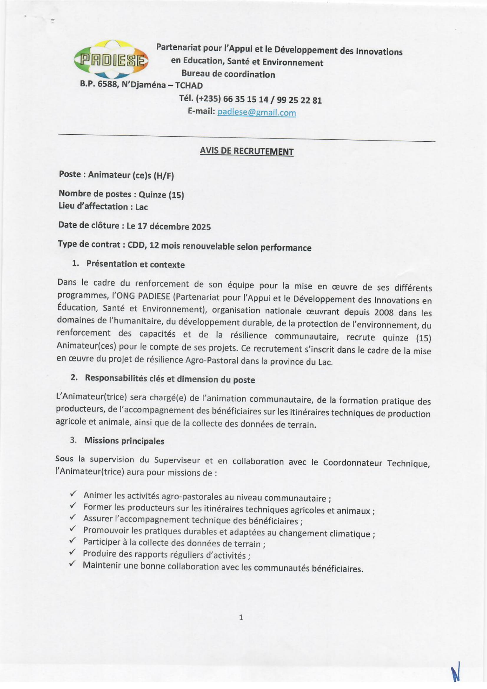 Accueil » Opportunités » Afrique » Tchad » L’ONG PADIESE au Tchad recherche Quinze (15) Animateurs (H/F), postes basés au Lac