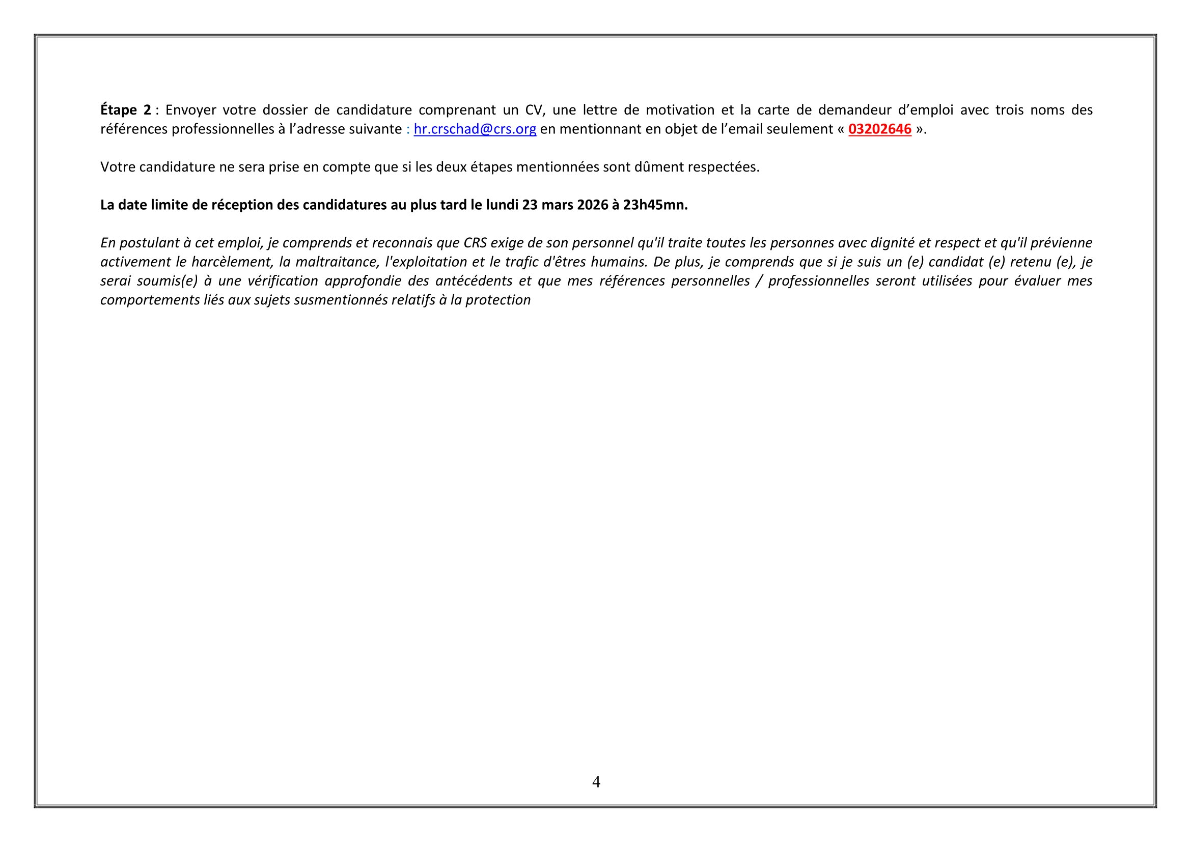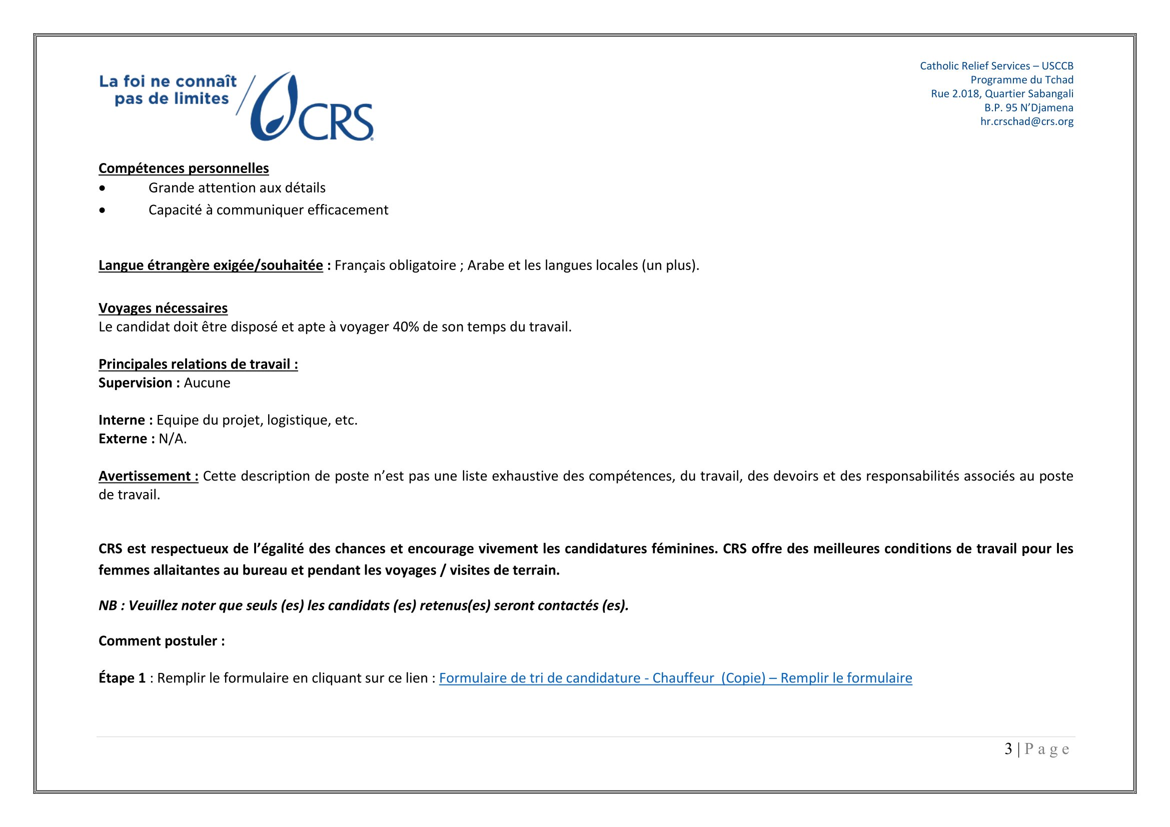 Accueil » Opportunités » Afrique » Tchad » Catholic Relief Services, programme du Tchad, lance un avis de recrutement des Chauffeurs, postes basés à Liwa ou Adré