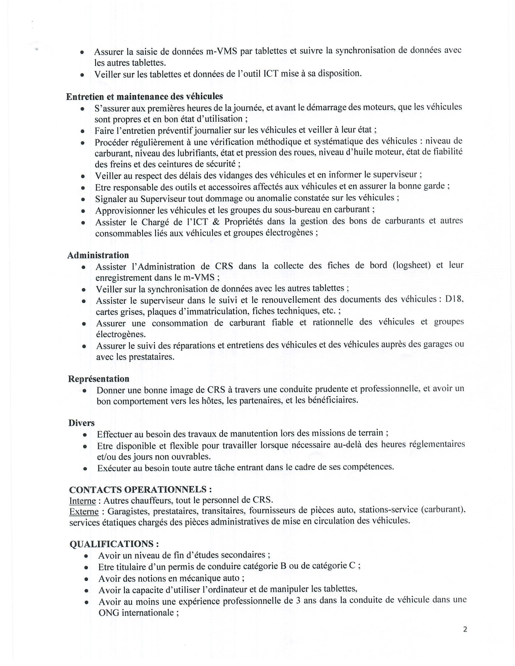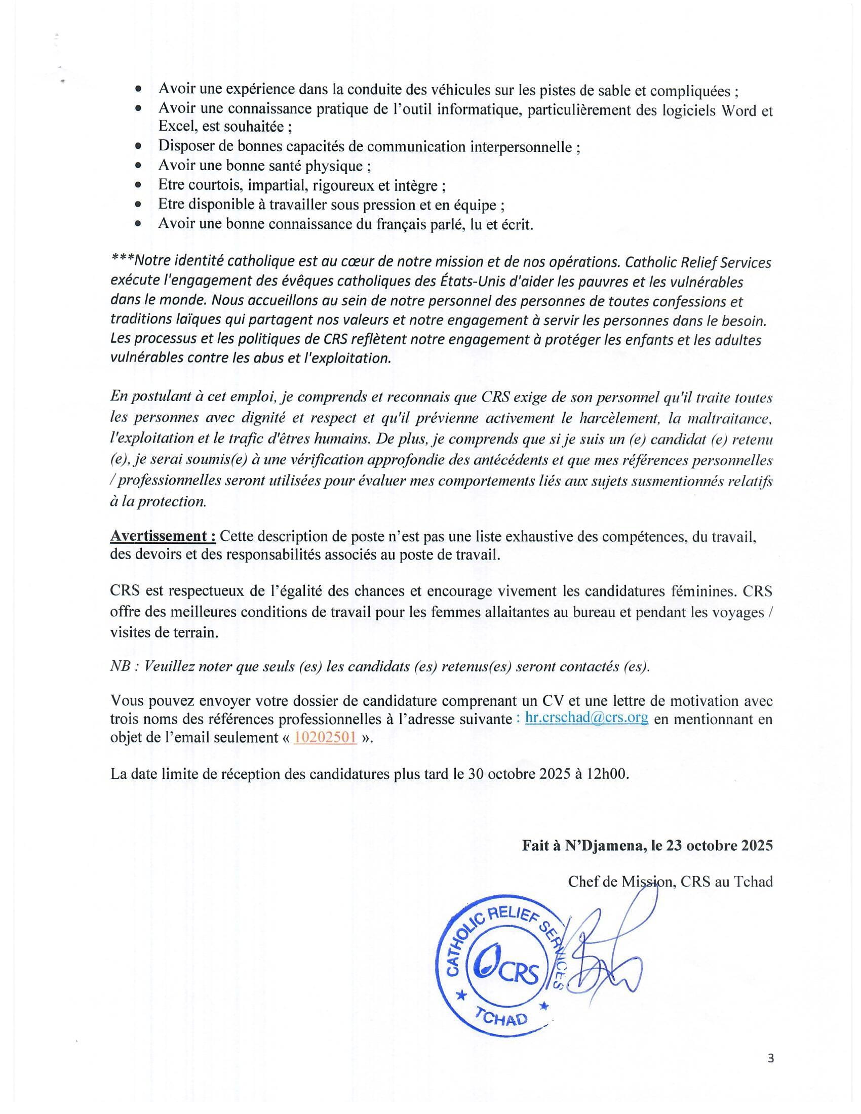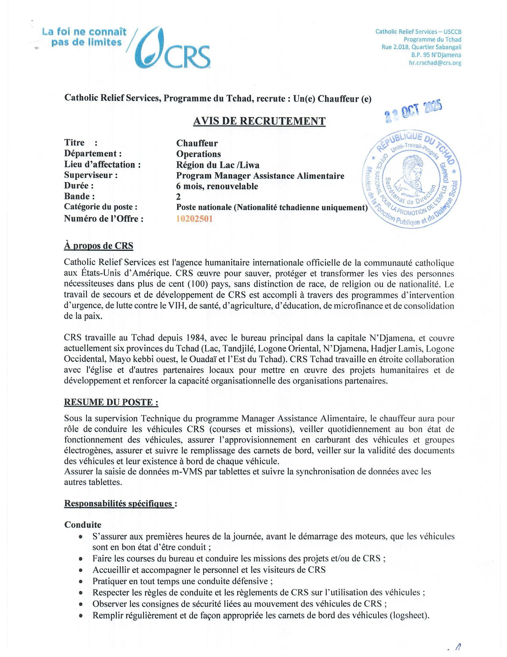 Accueil » Opportunités » Afrique » Tchad » Catholic Relief Services recrute un Chauffeur (H/F) à Liwa, Tchad