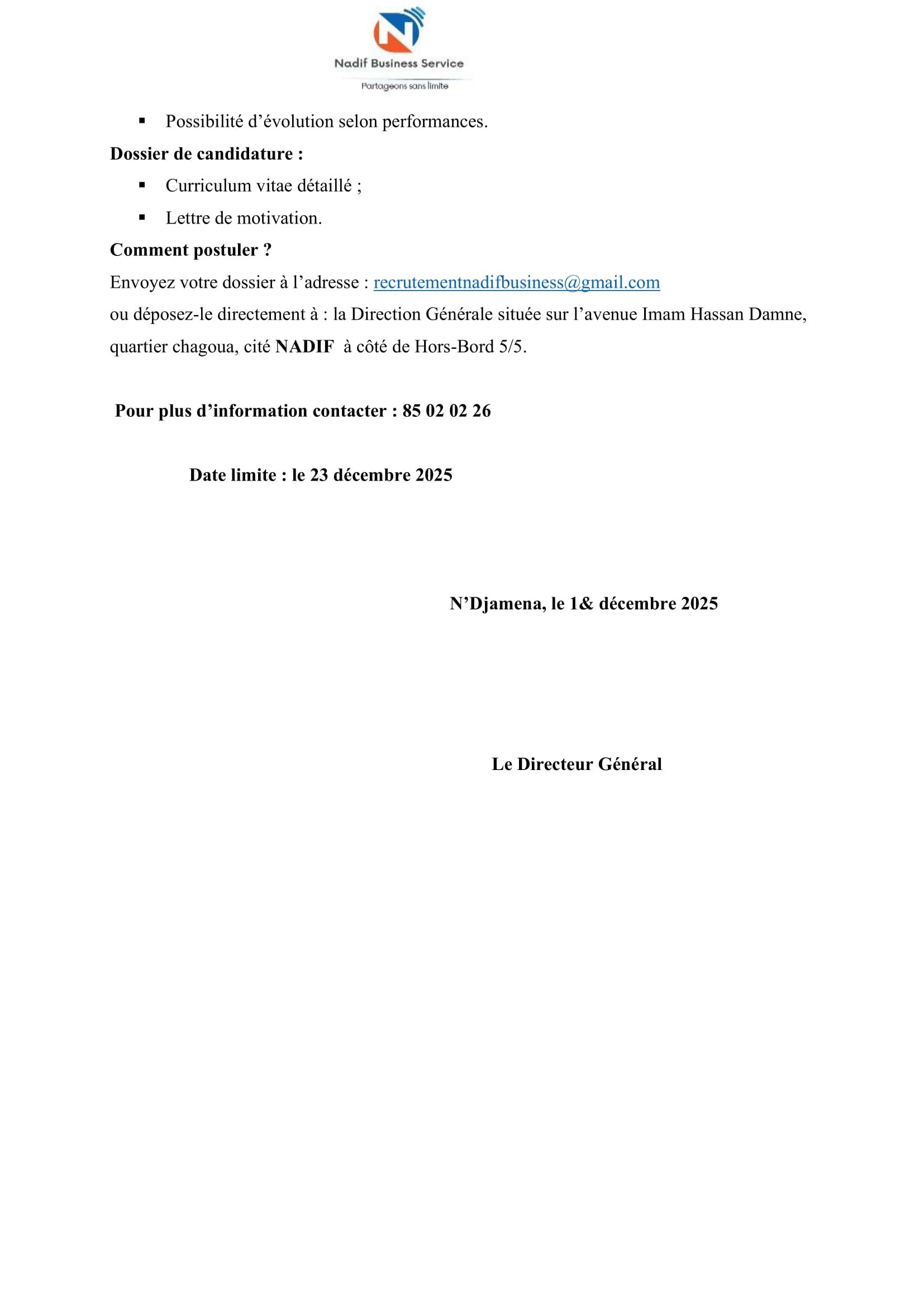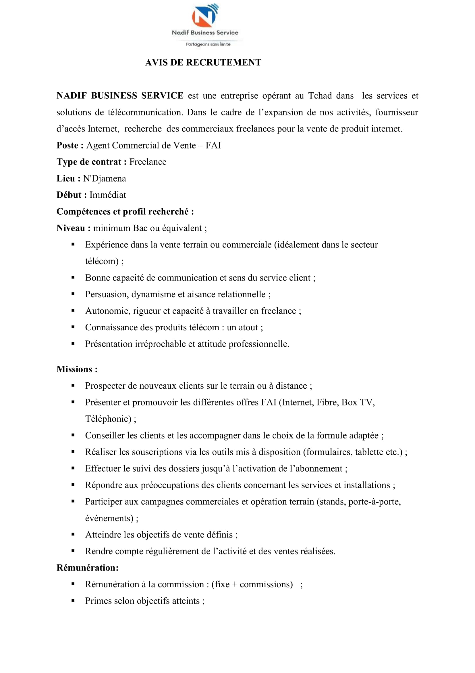 Accueil » Opportunités » Afrique » Tchad » L’Entreprise NADIF BUSINESS SERVICE au Tchad recherche des Agents commerciaux pour la vente de produit internet, postes basés à N’Djamena