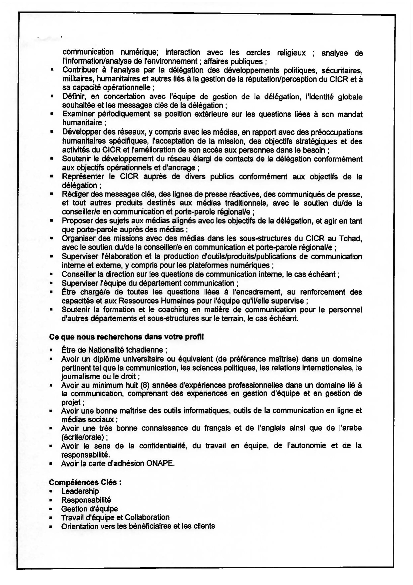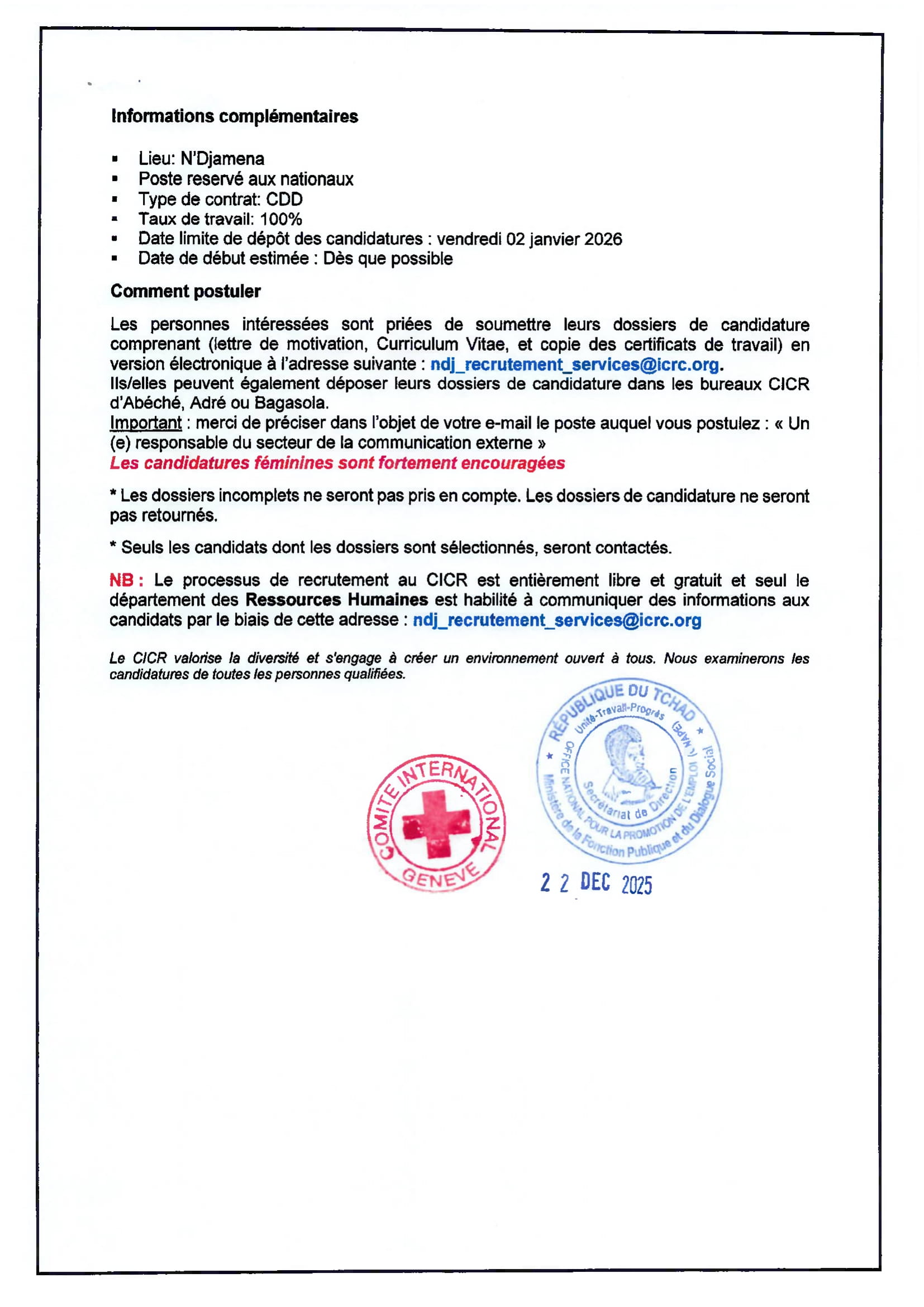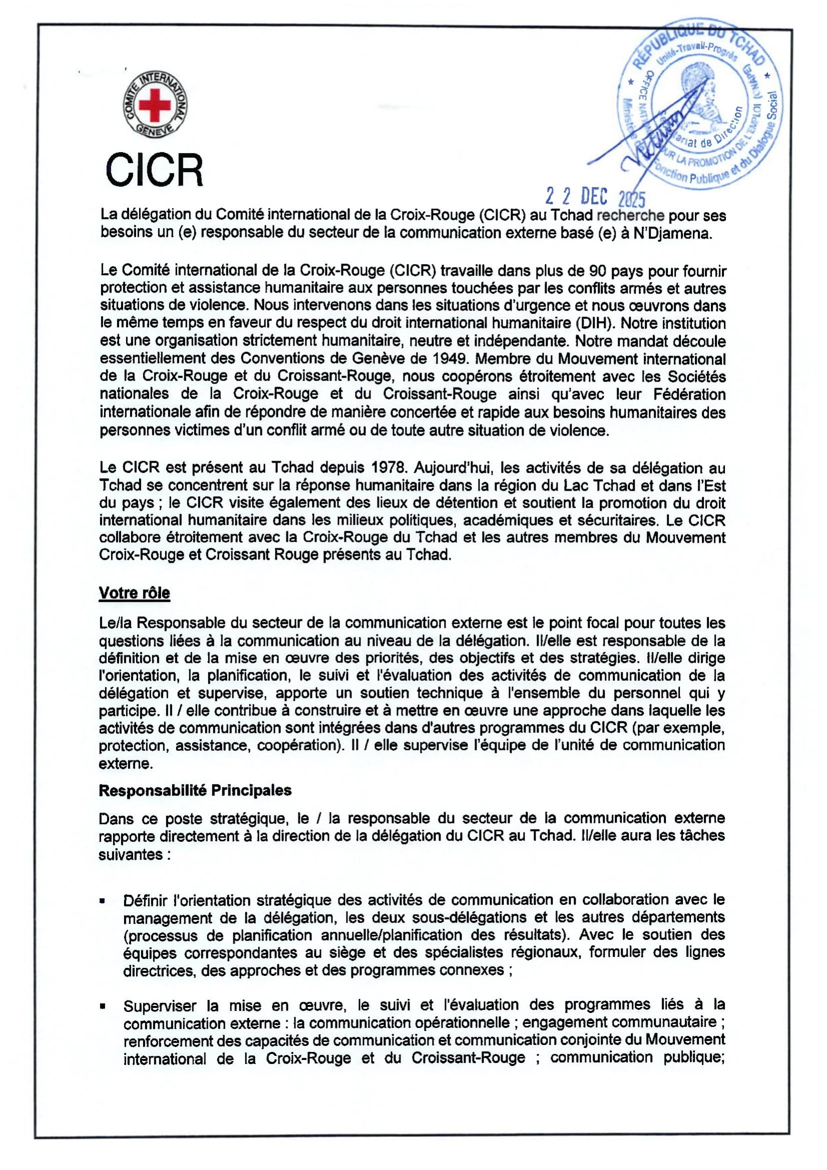 Accueil » Opportunités » Afrique » Tchad » La CICR recherche pour ses besoins un(e) Responsable du secteur de la communication externe basé(e) à N’Djamena, Tchad