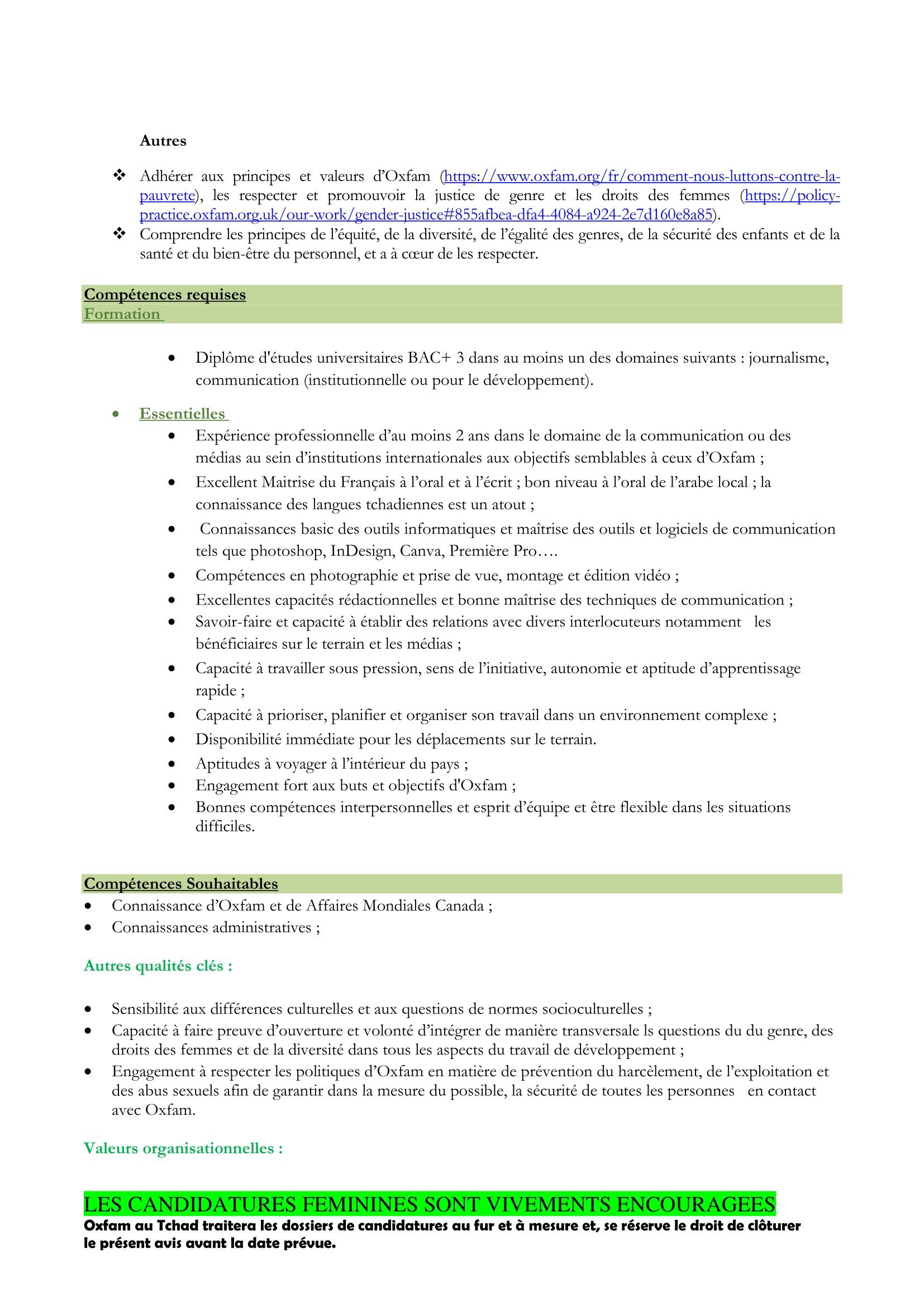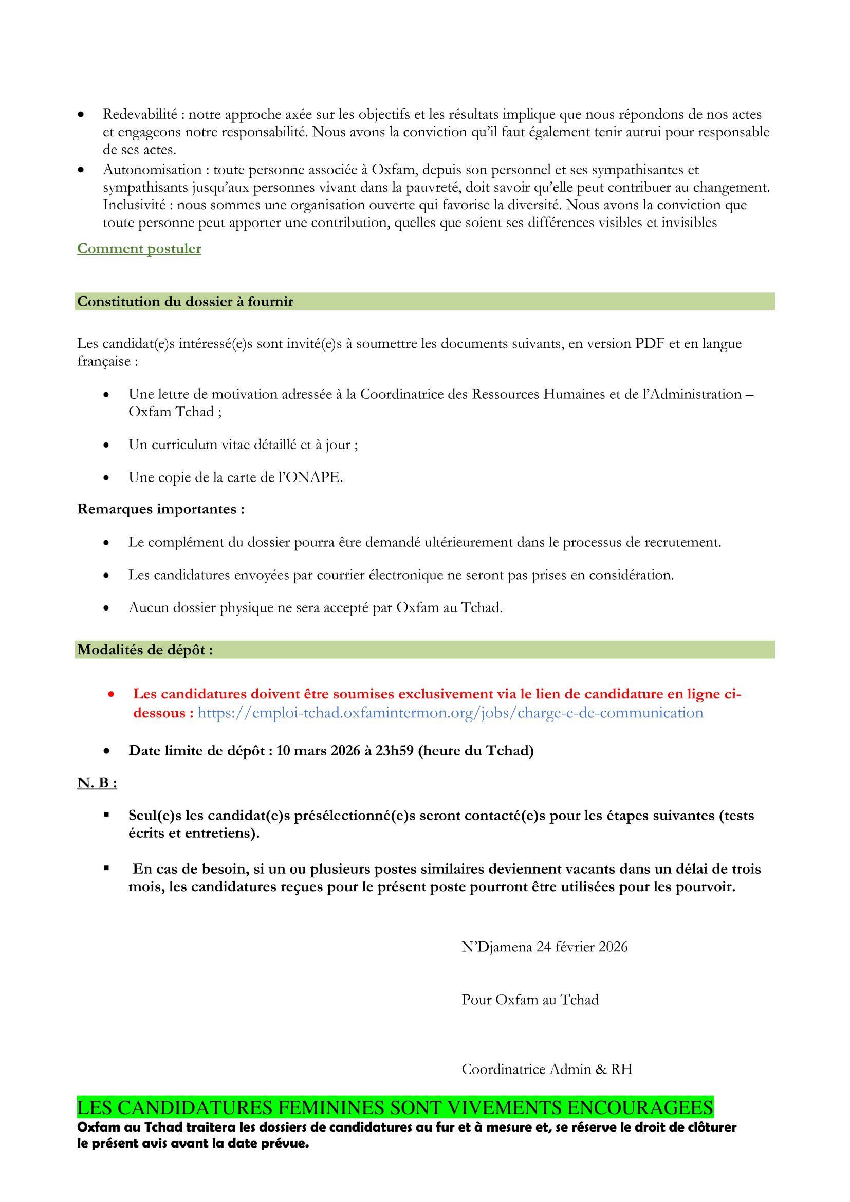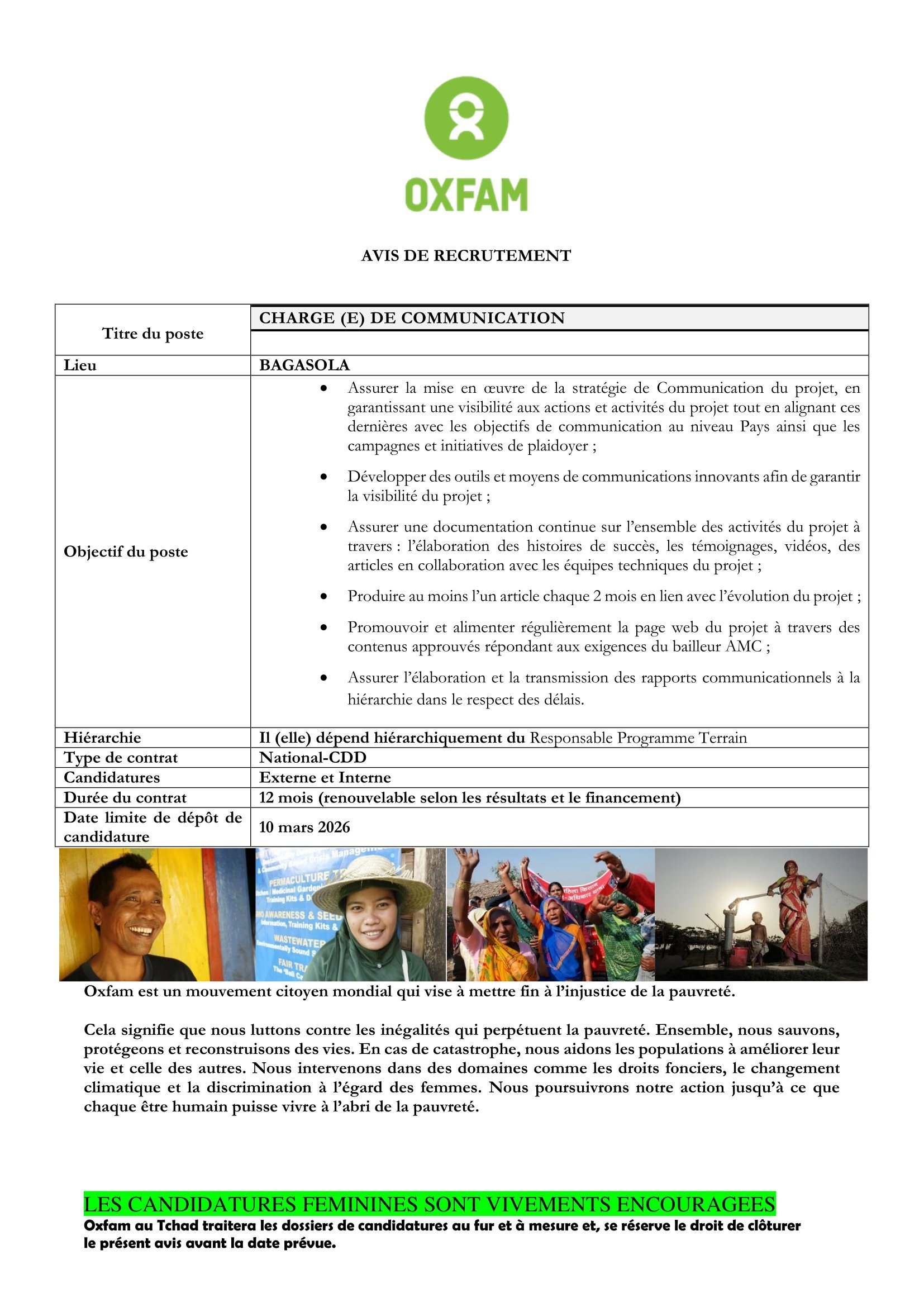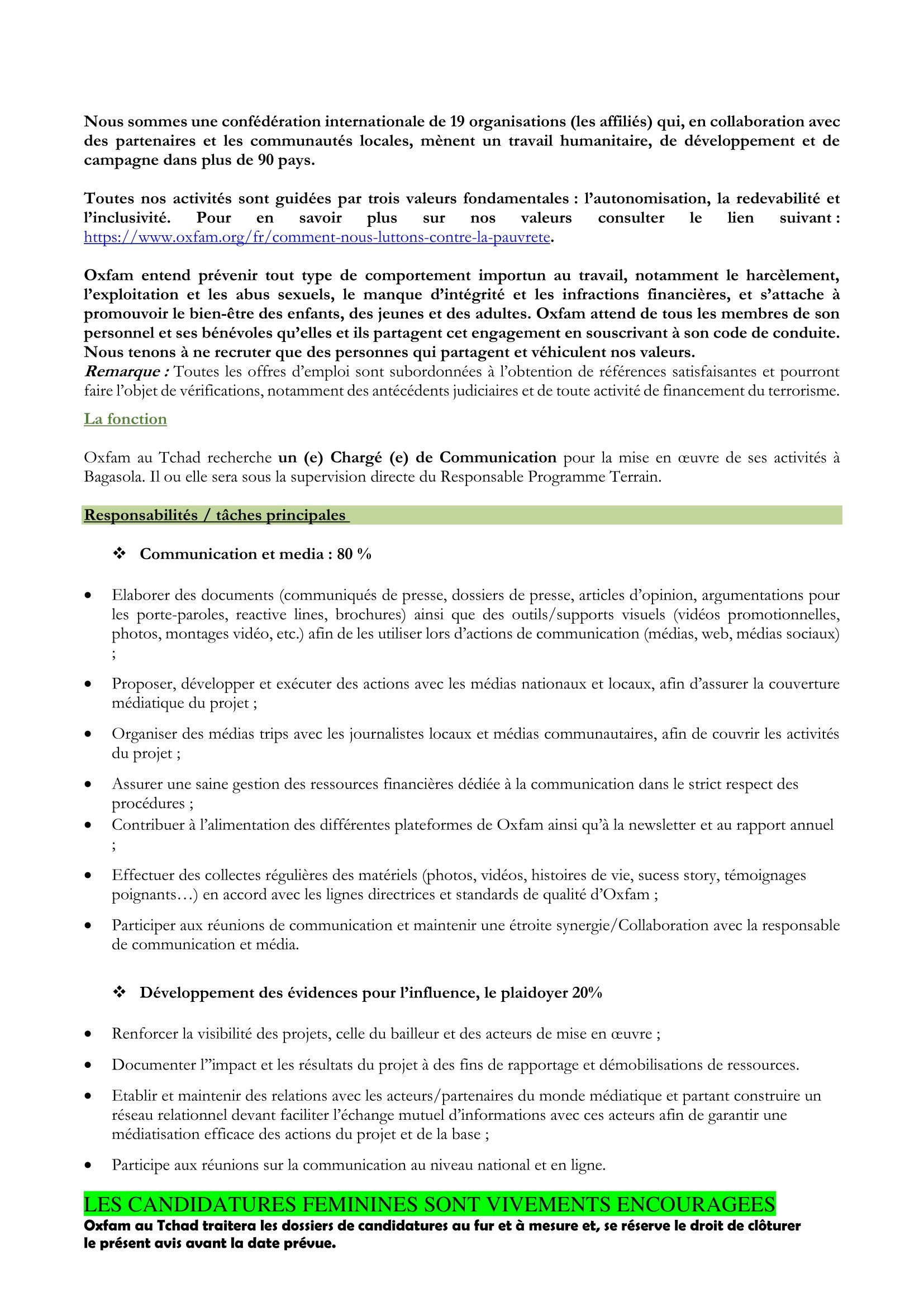 Accueil » Opportunités » Afrique » Tchad » OXFAM Tchad recherche un(e) Chargé(e) de communication, poste basé à Bagasola