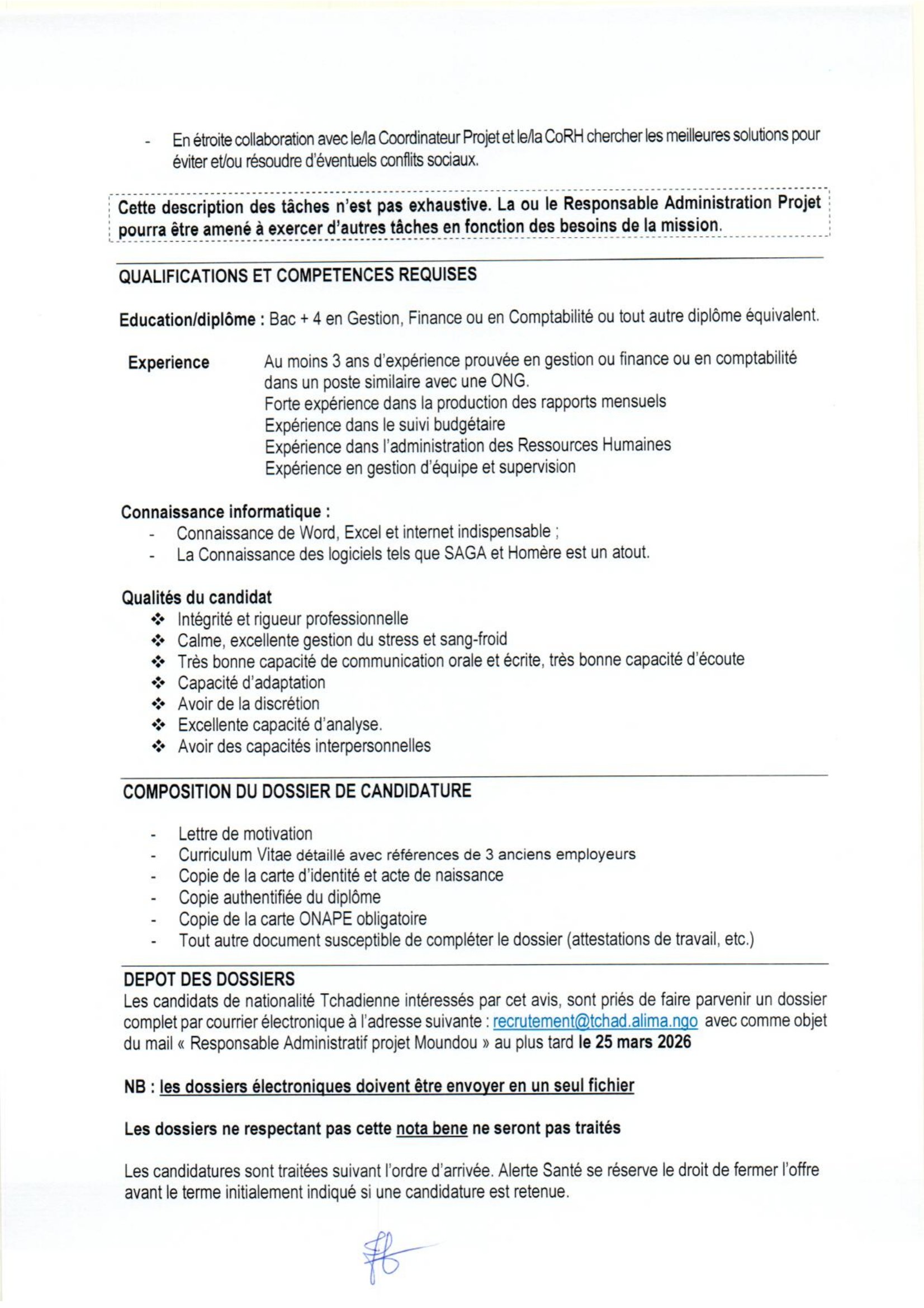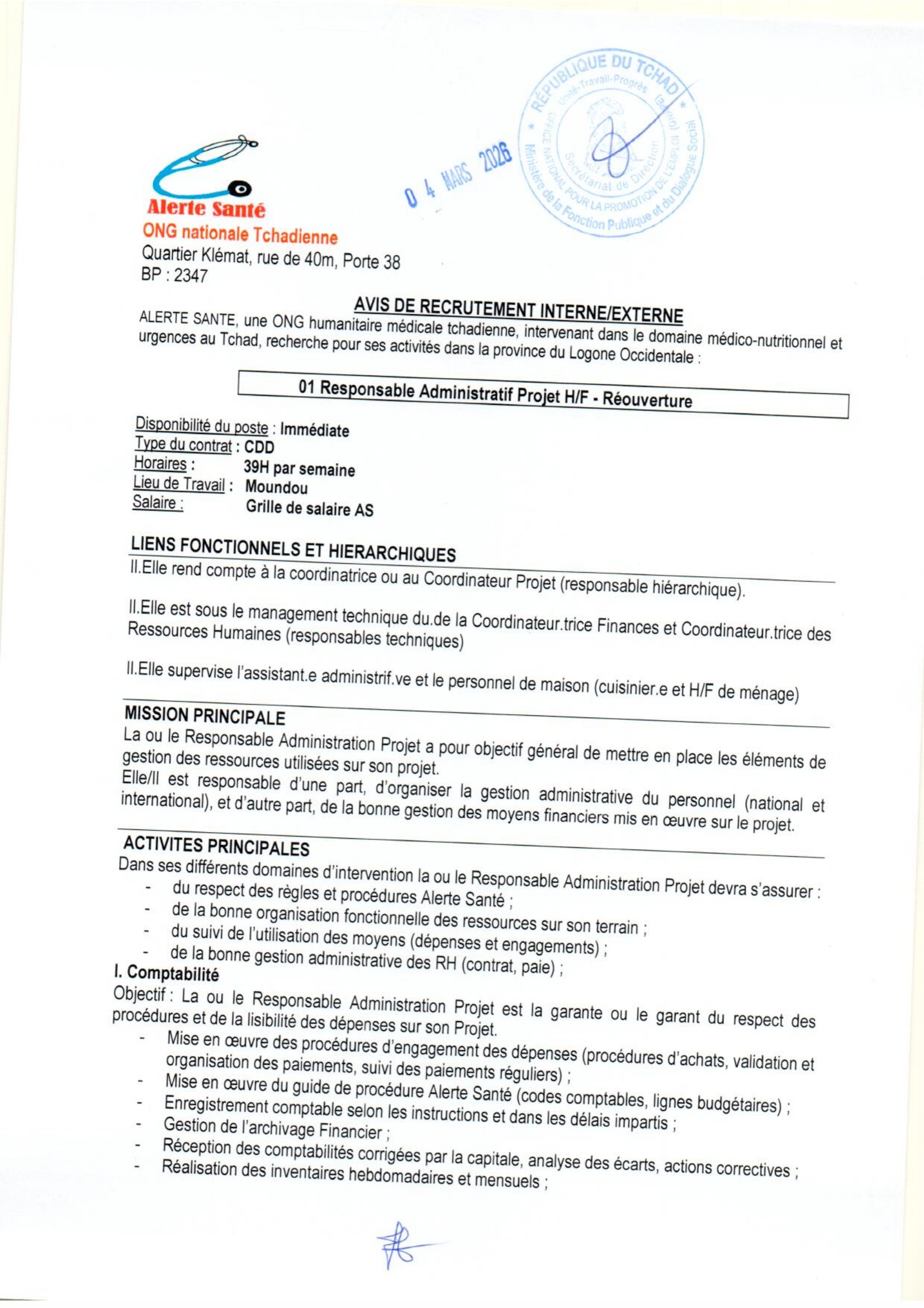 Accueil » Opportunités » Afrique » Tchad » Alerte Santé recherche un(e) Responsable Administratif(ve) Projet, poste basé à Moundou (Tchad)