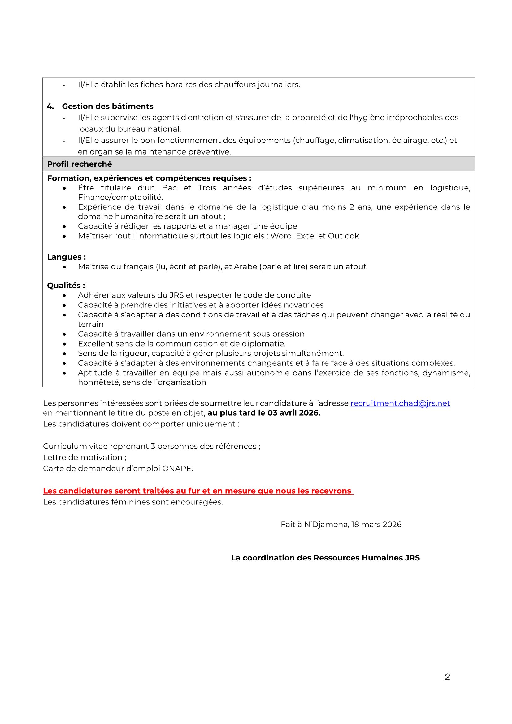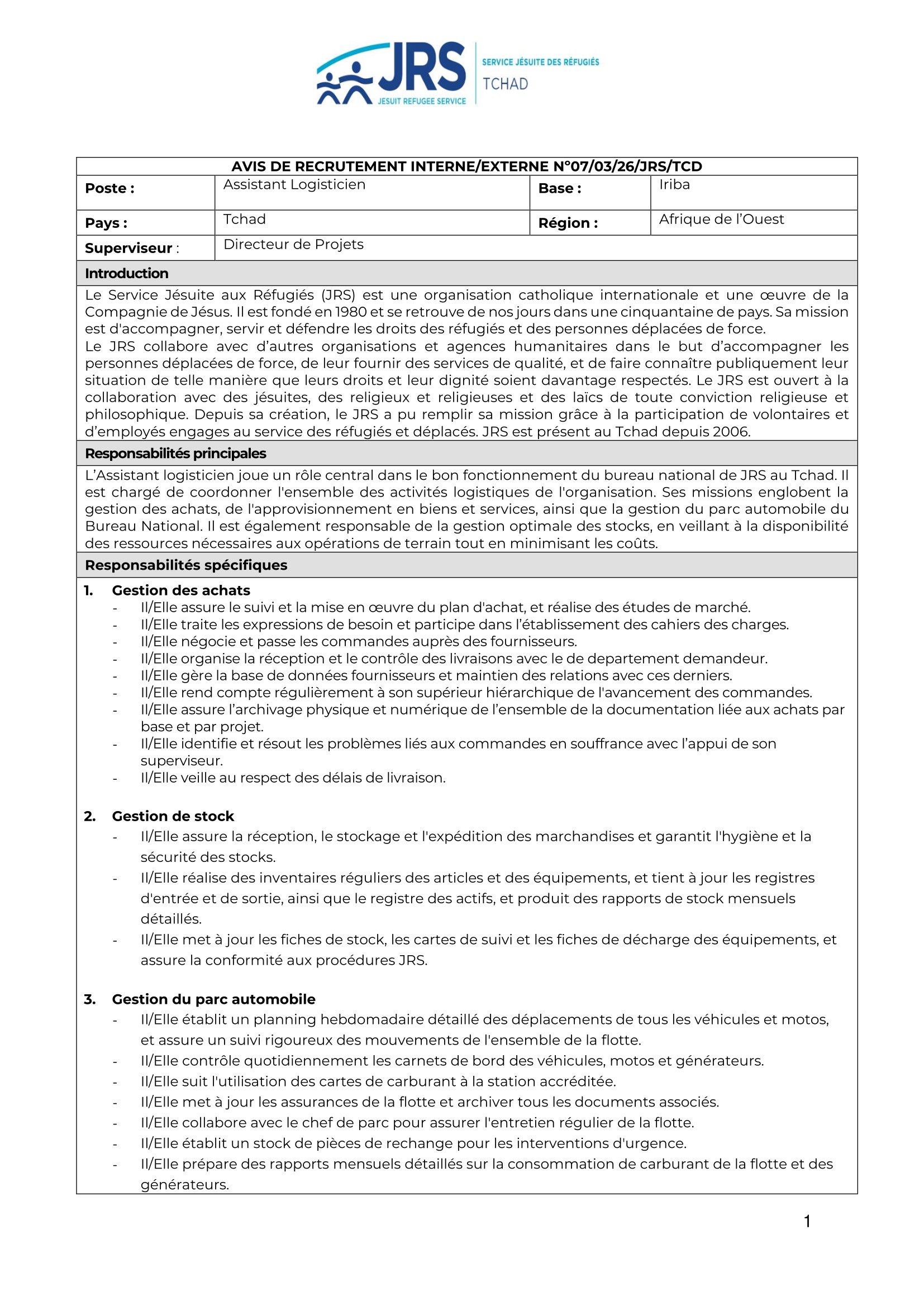 Le Service Jésuite aux Réfugiés (JRS) lance un avis de recrutement d’un(e) Assistant(e) Logisticien(ne) à Iriba, Tchad