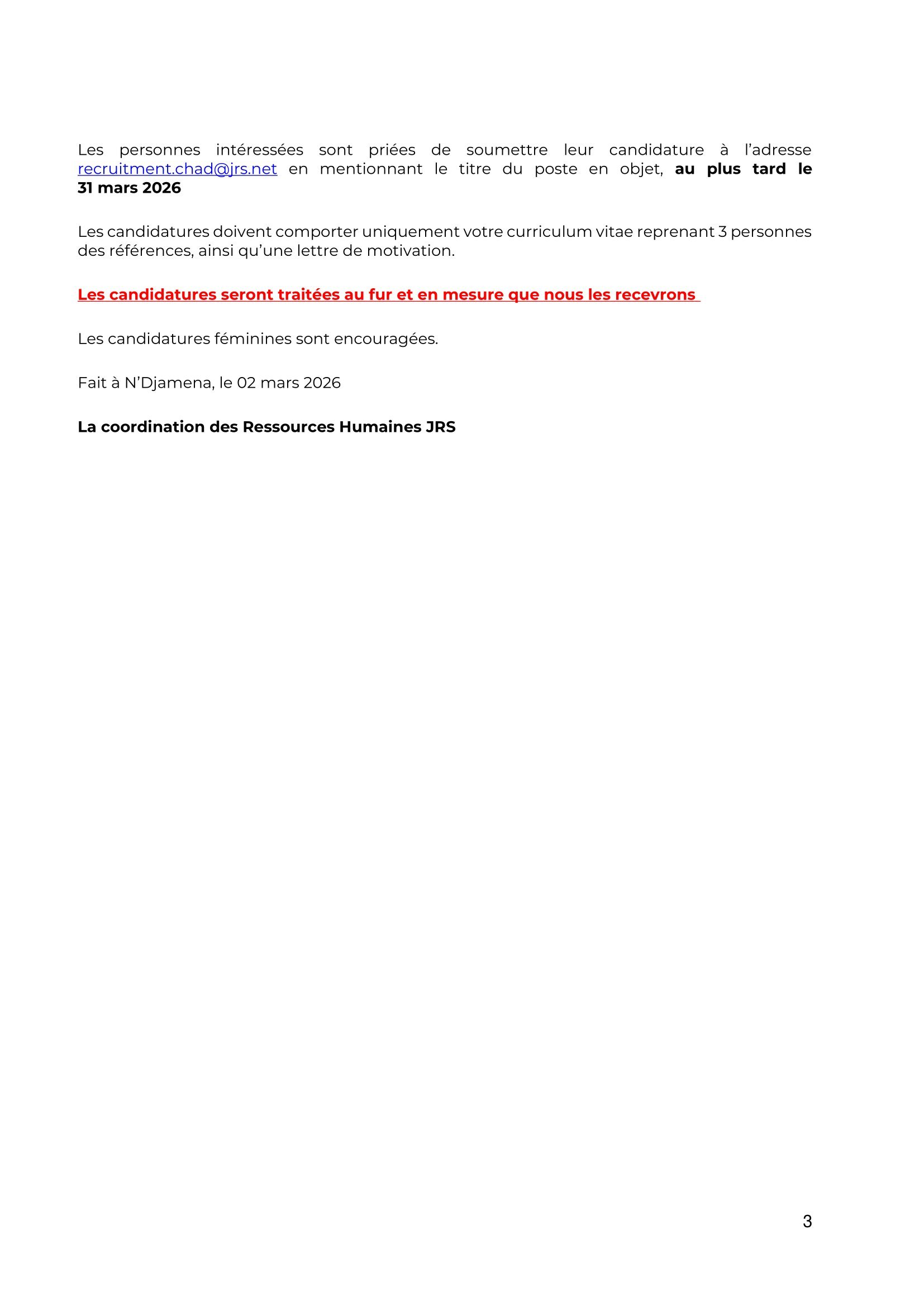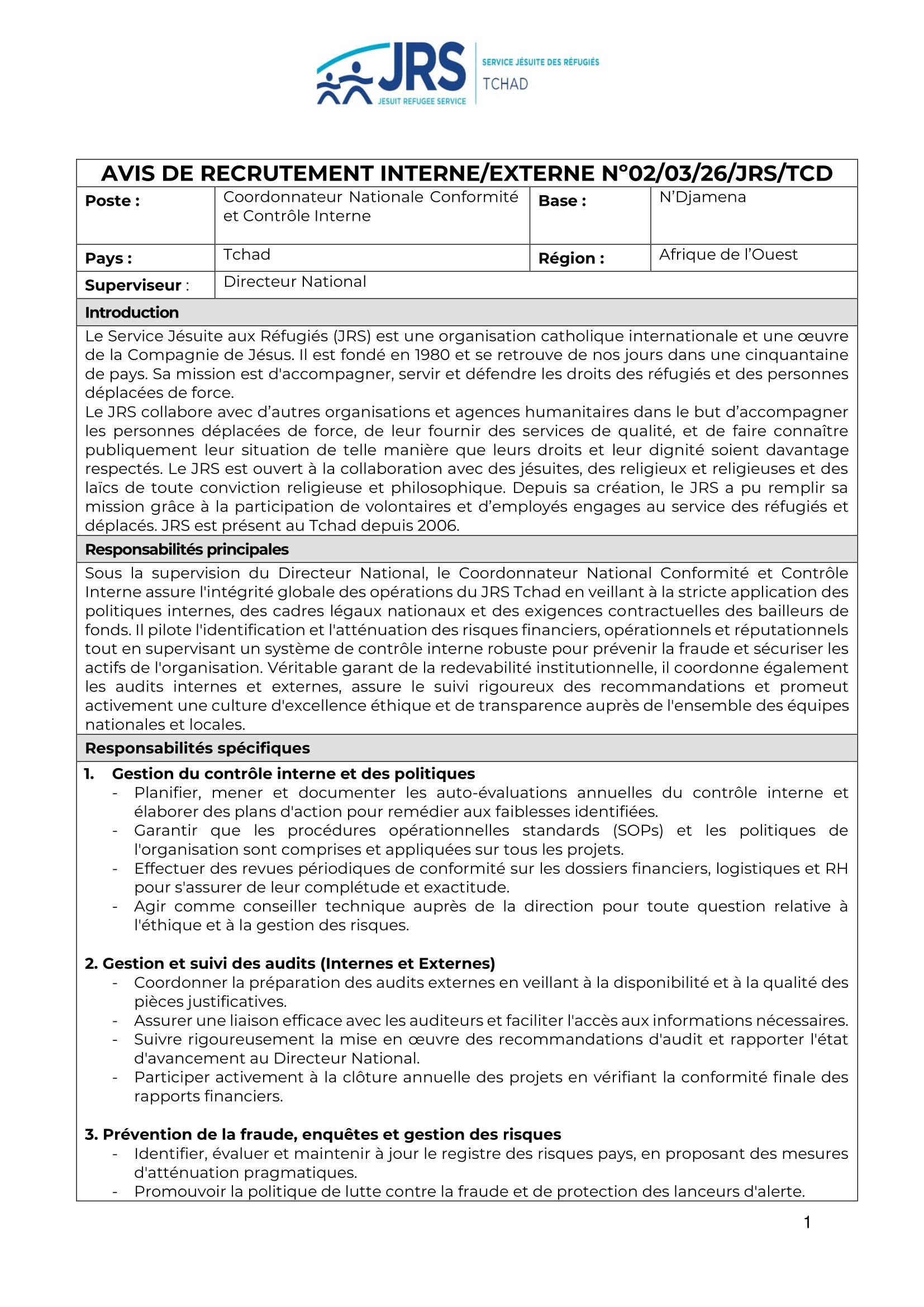Accueil » Opportunités » Afrique » Tchad » Le Service Jésuite des Réfugiés (JRS) recherche un(e) Coordinateur(rice) National(e) Conformité et Contrôle Interne, poste basé à N’Djamena