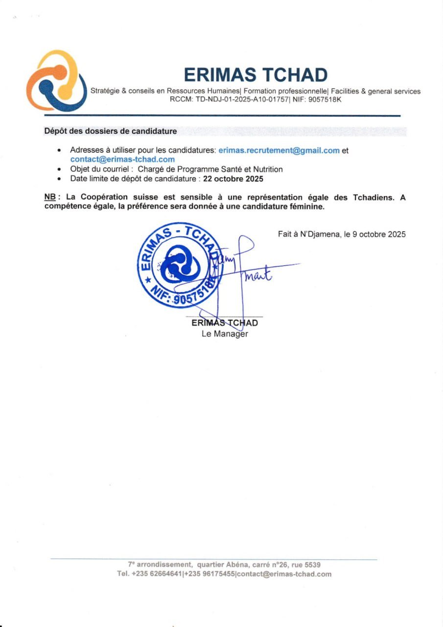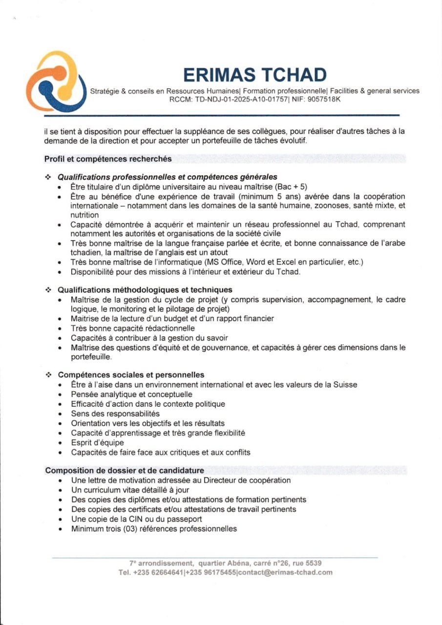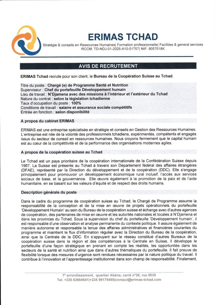 Accueil » Opportunités » Afrique » Tchad » ERIMAS Tchad recrute à N’Djamena un(e) Chargé(e) de Programme Santé et Nutrition (H/F) pour le Bureau de la Coopération Suisse, Tchad