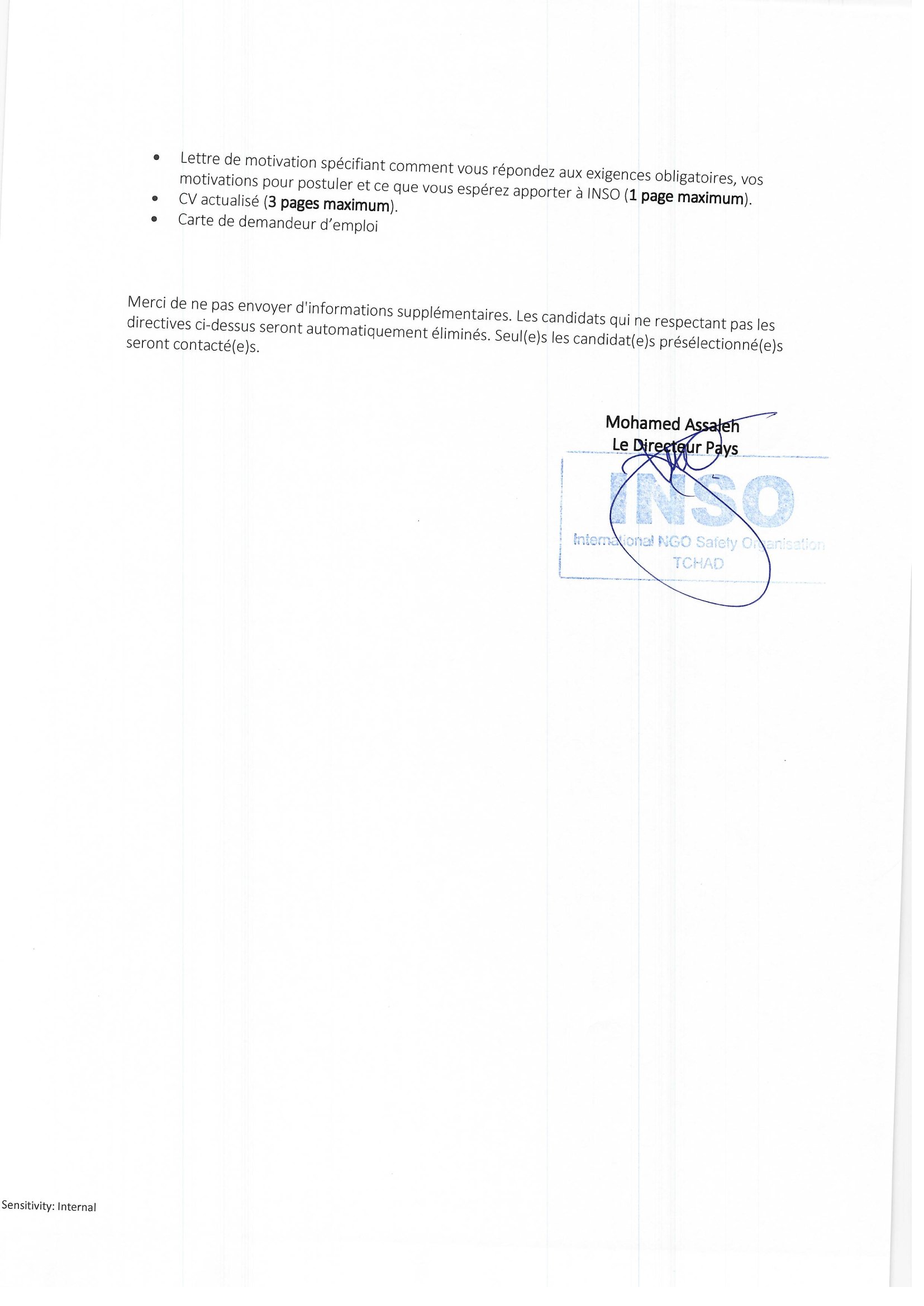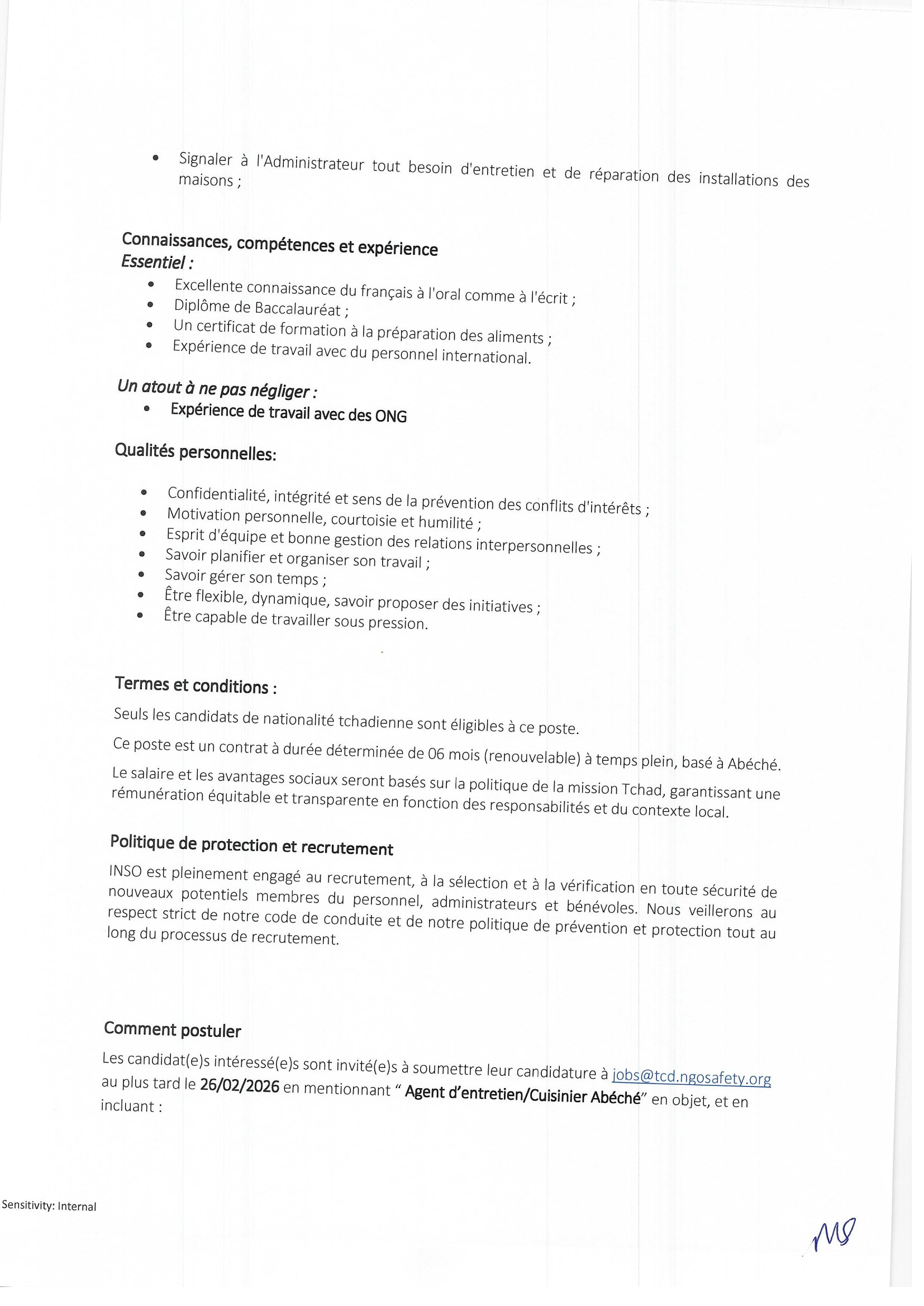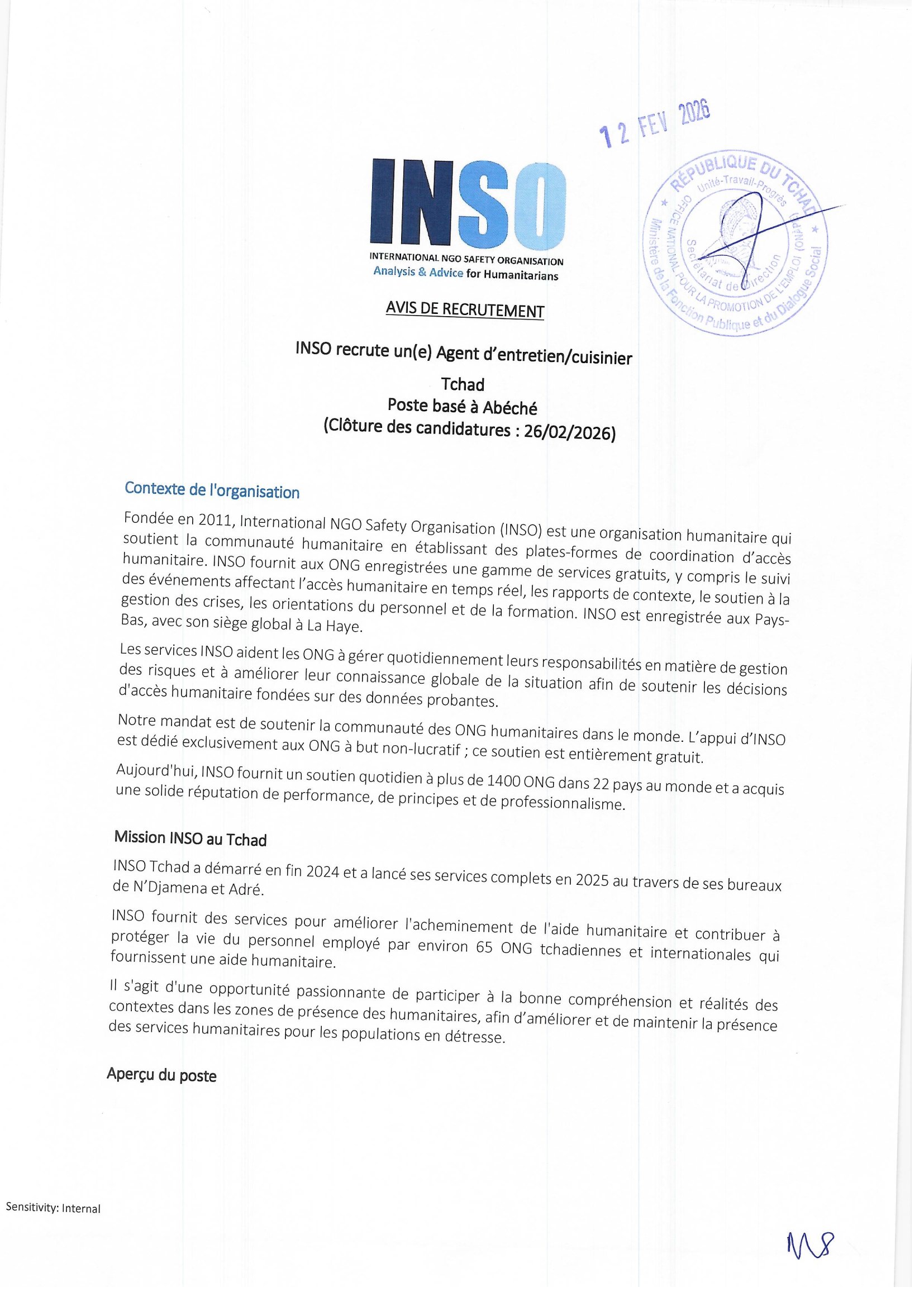 Accueil » Opportunités » Afrique » Tchad » INSO recrute un(e) Agent(e) d’entretien/Cuisinier(ère) à Abéché, Tchad
