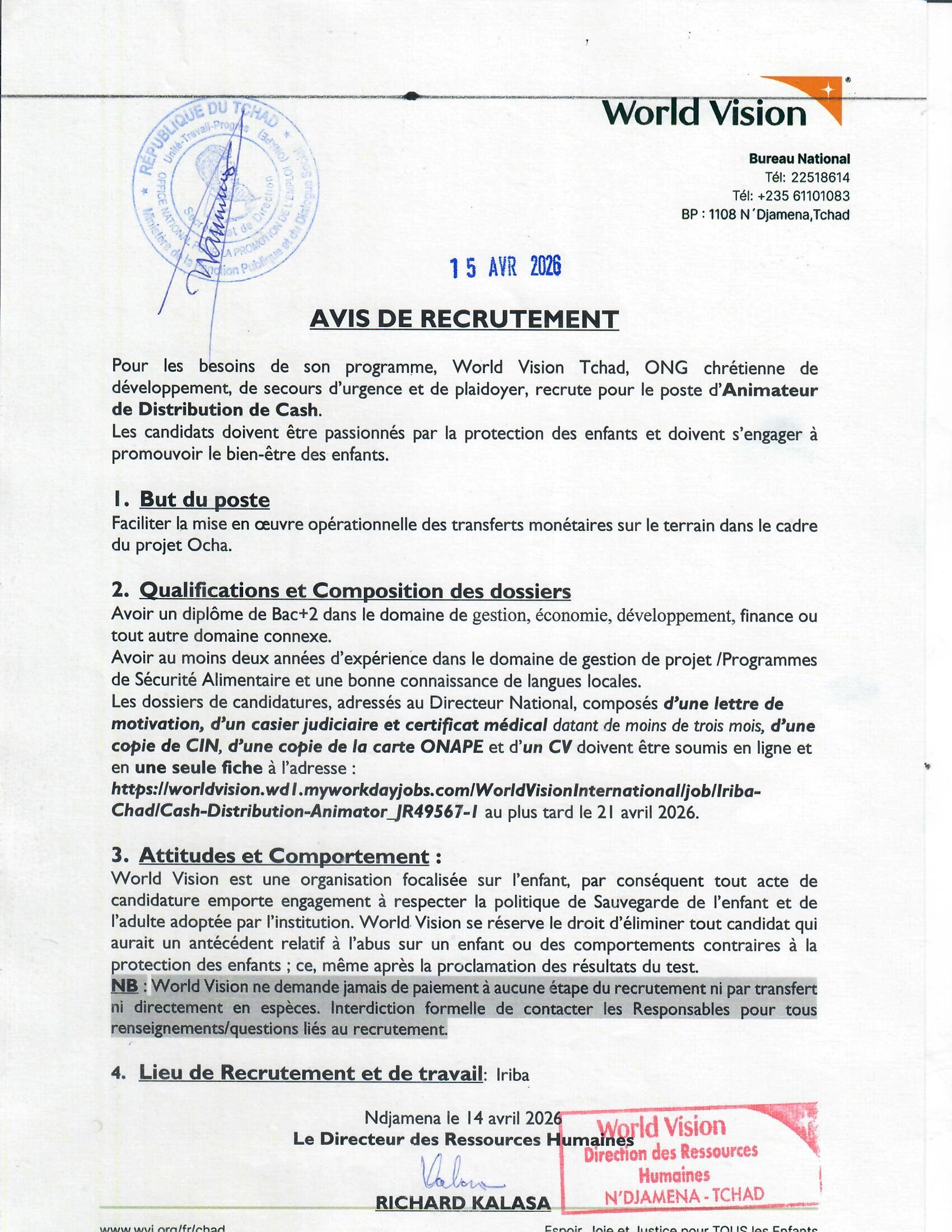 Accueil » Opportunités » Afrique » Tchad » World Vision Tchad recrute un(e) Animateur(rice) de distribution Cash, poste basé à Iriba
