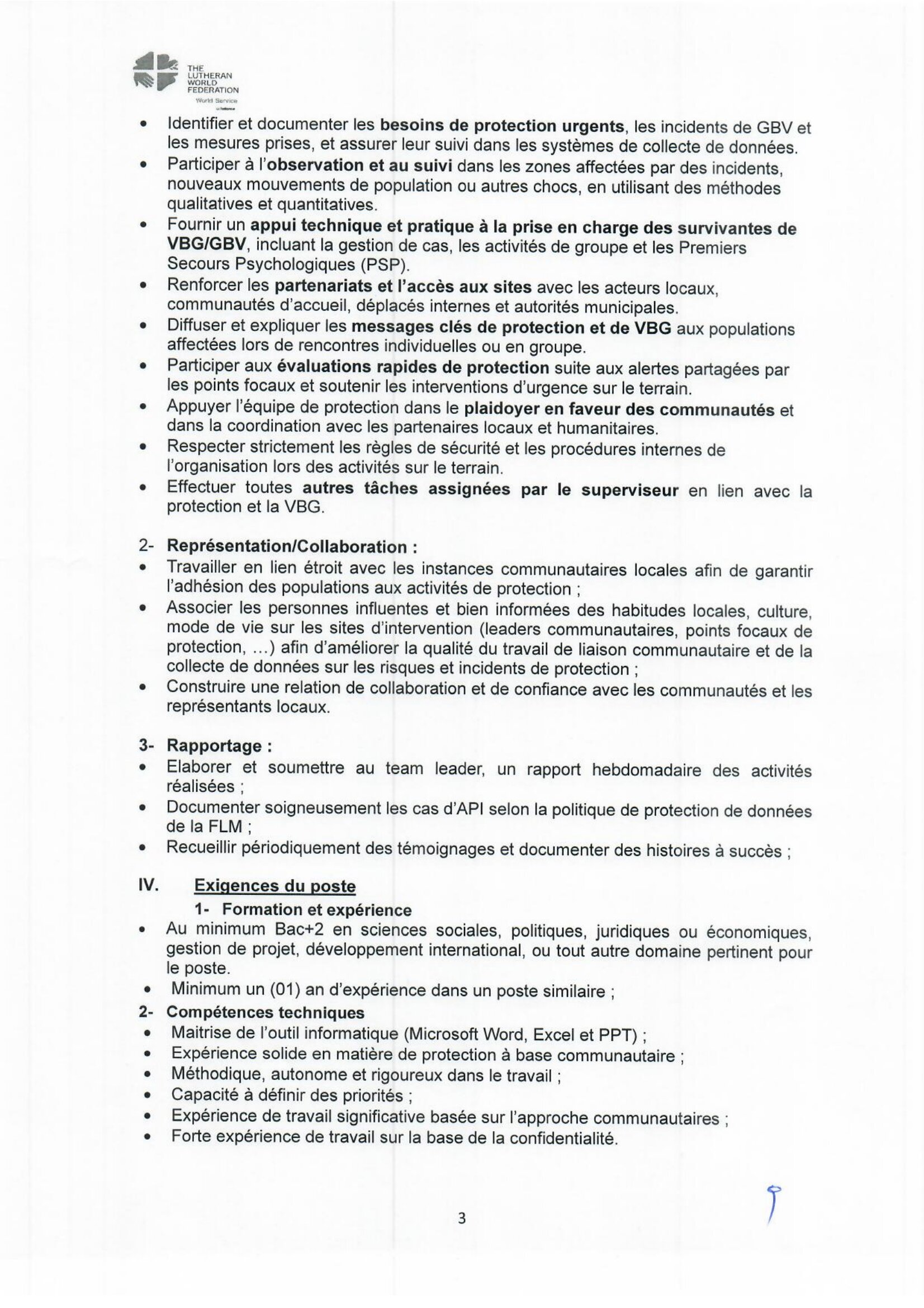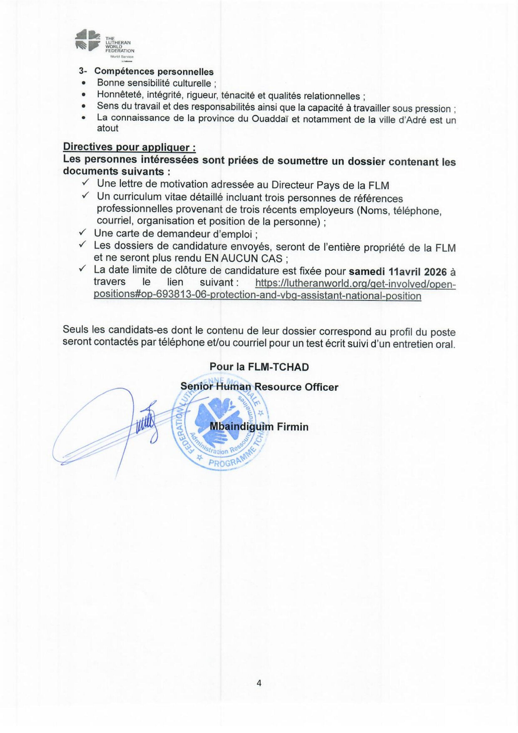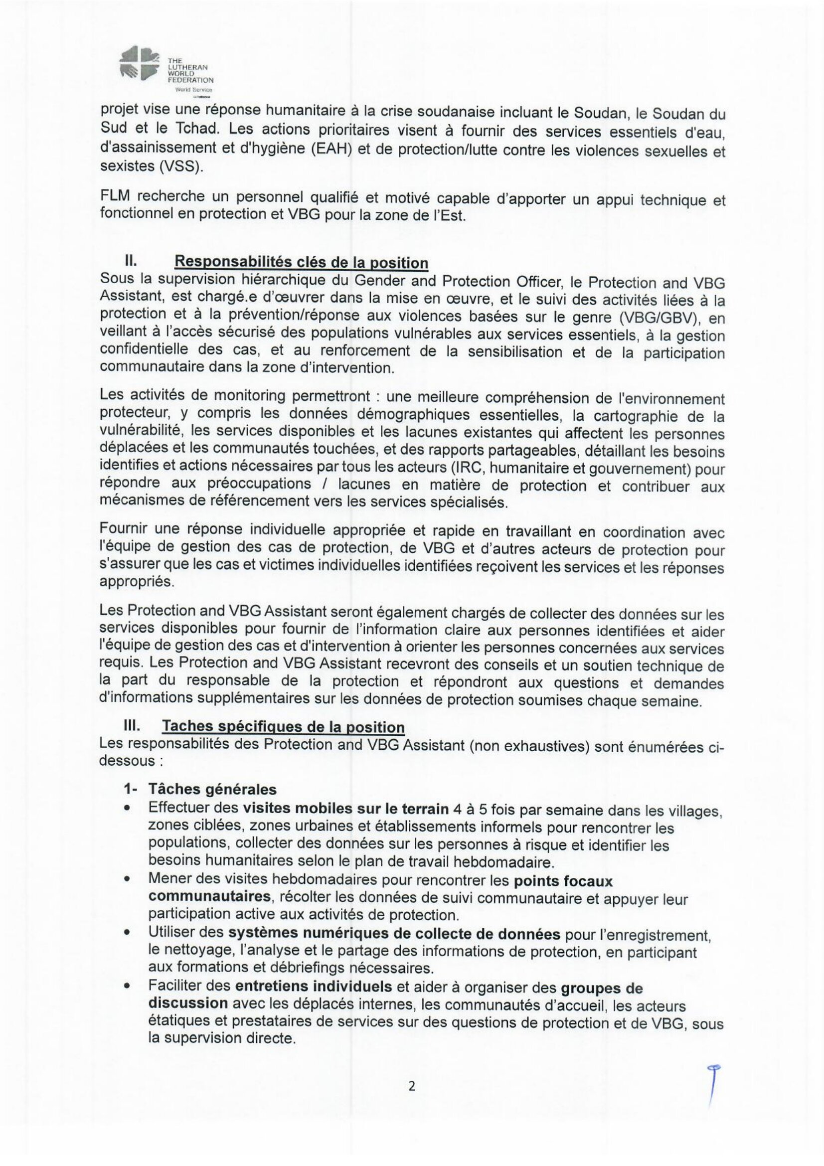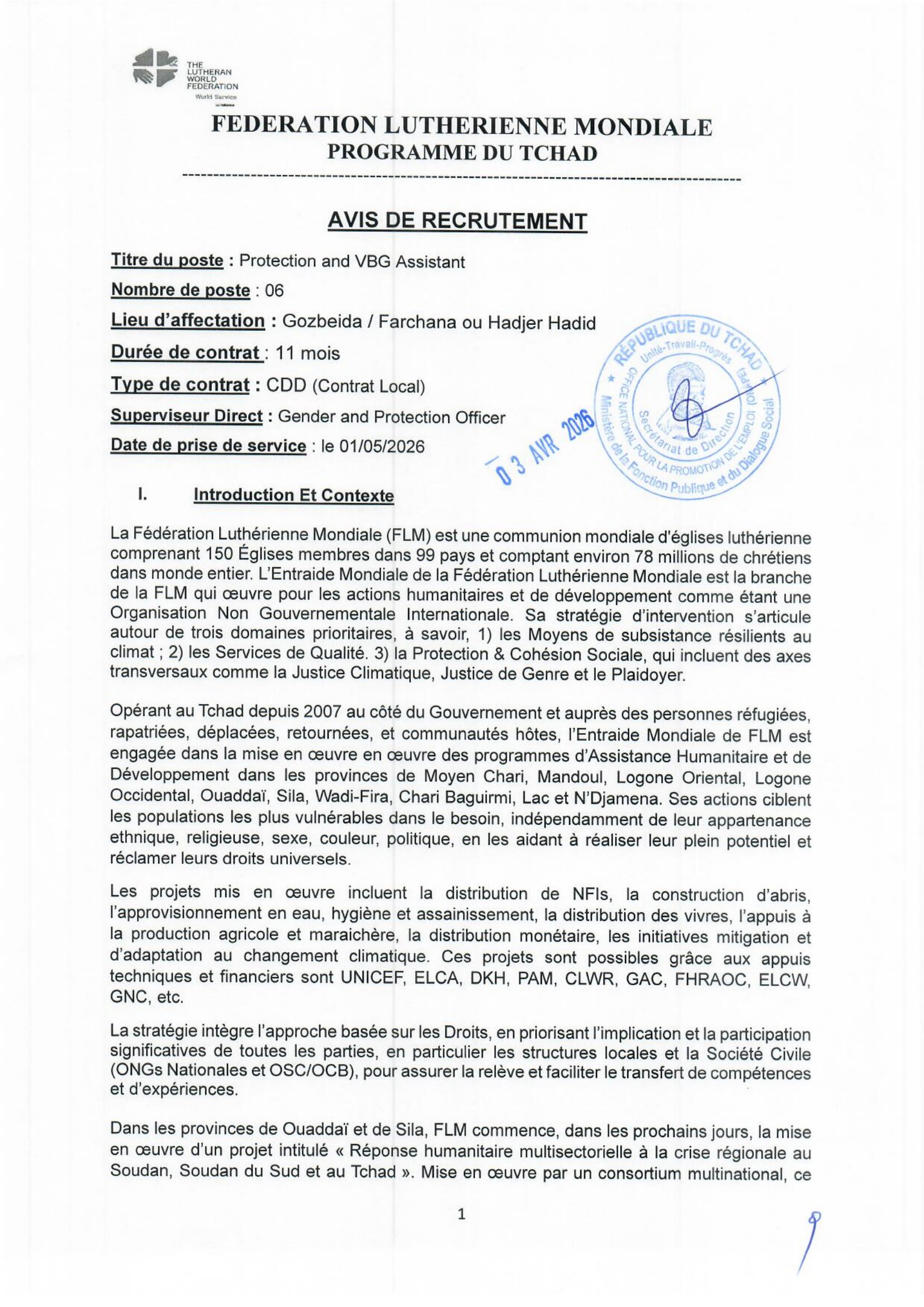 Accueil » Opportunités » Afrique » Tchad » La Fédération Luthérienne Mondiale (FLM) au Tchad recrute (06) Assistants Protection et VBG, postes basés à Goz-Beïda/Farchana ou Hadjer-Hadid