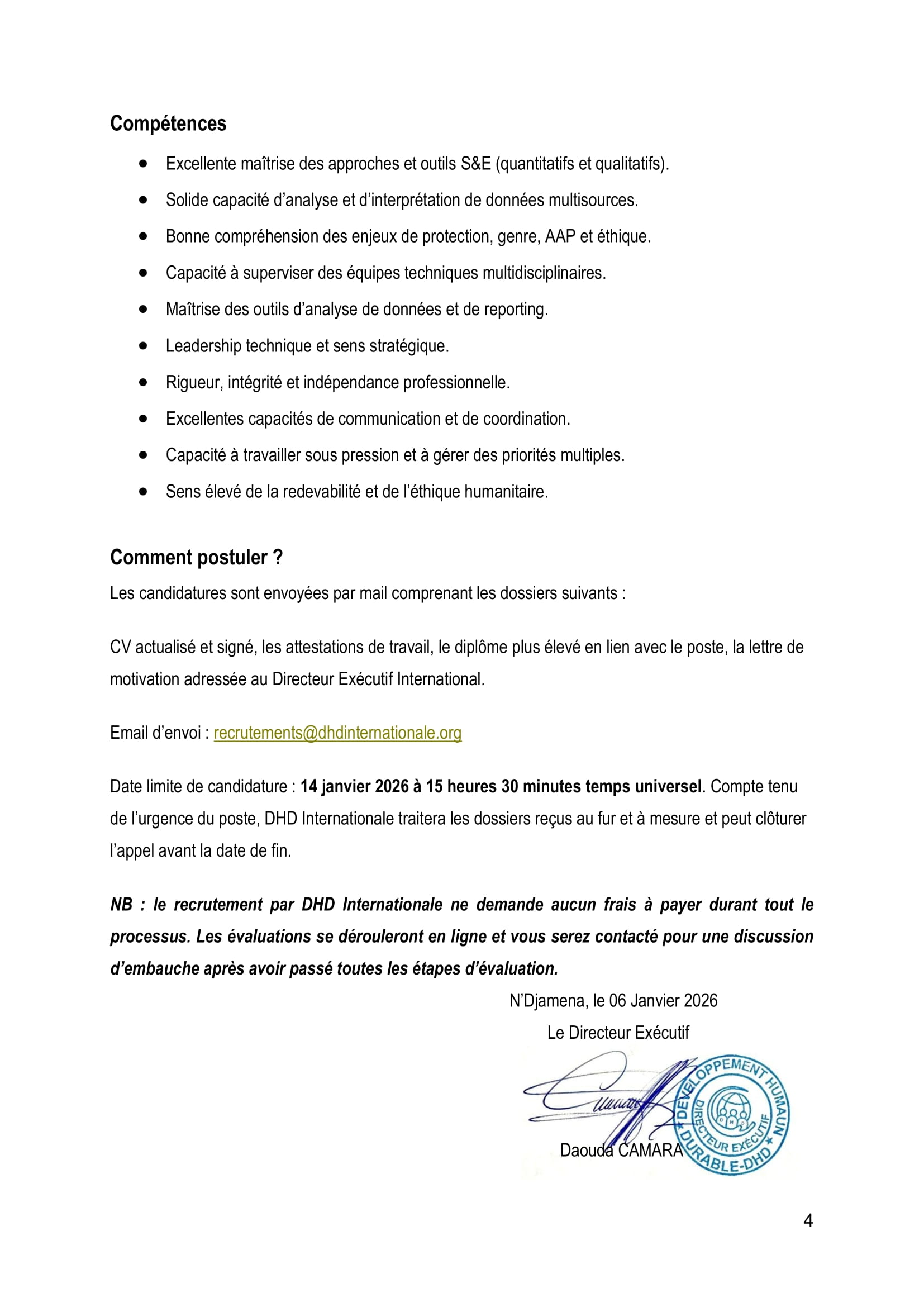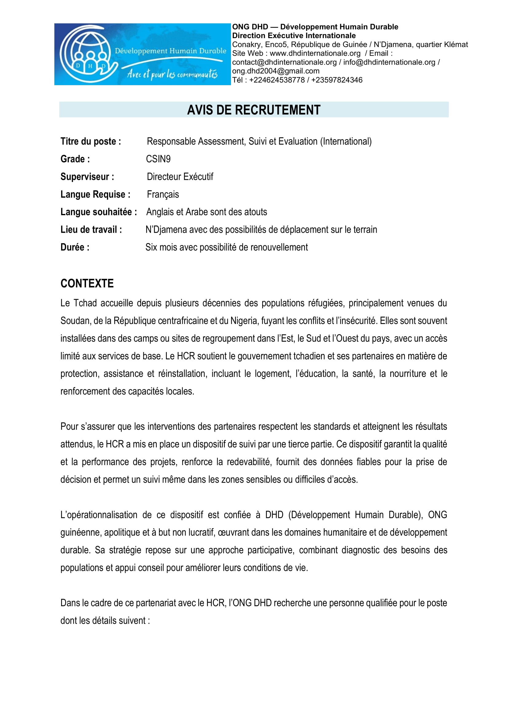 ONG Développement Humain Durable (DHD) recrute un(e) Responsable Assessment, Suivi et Évaluation au Tchad