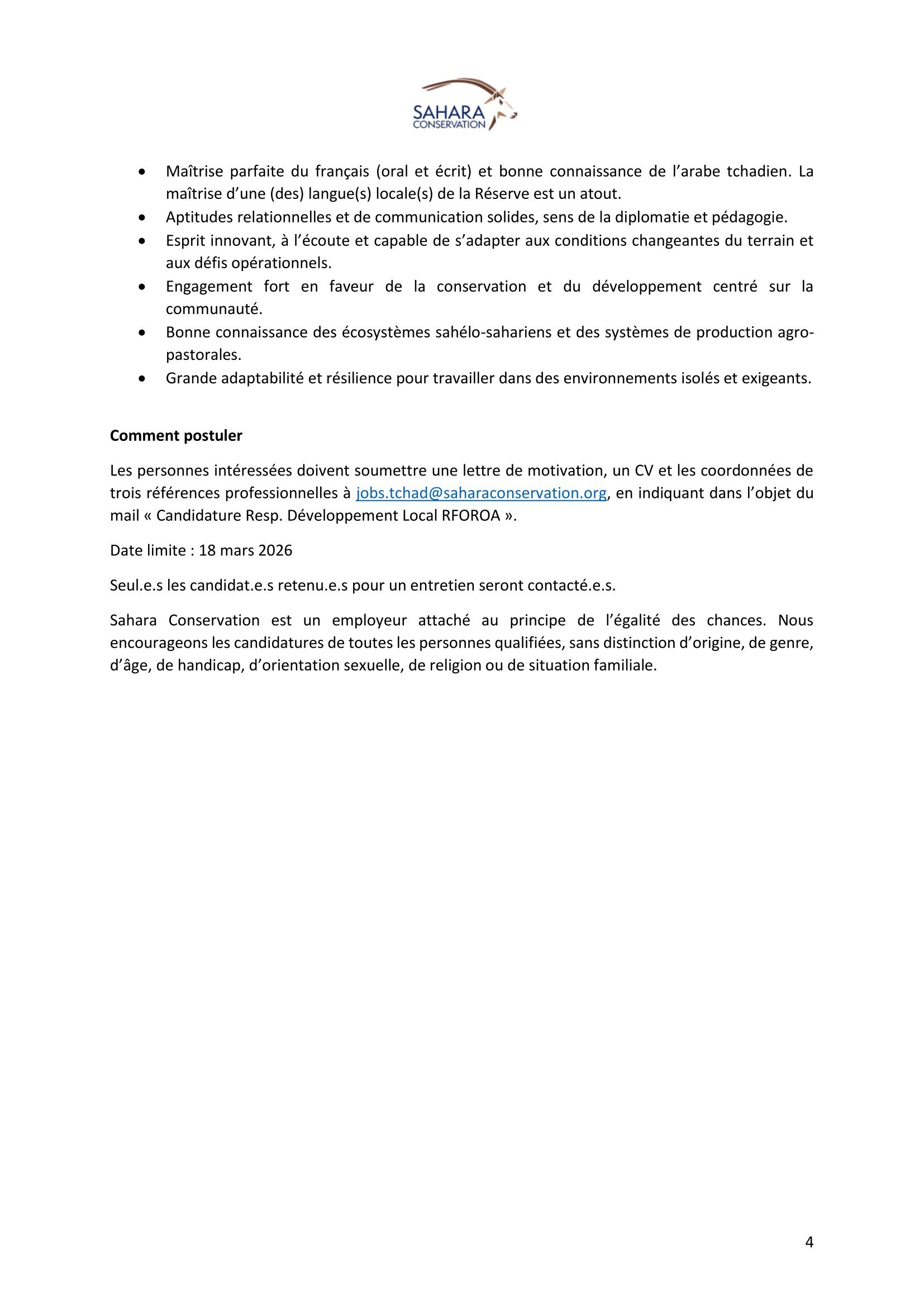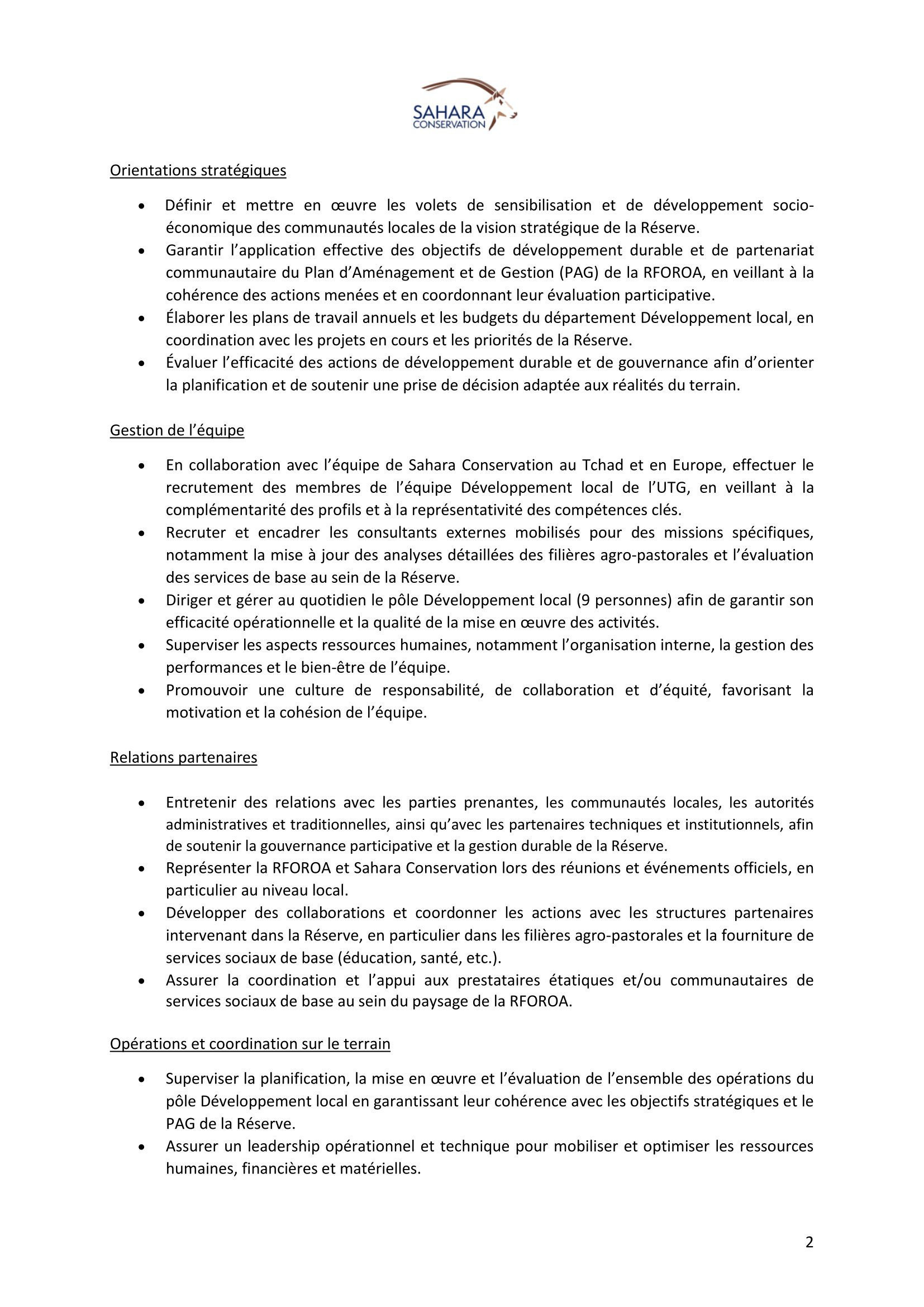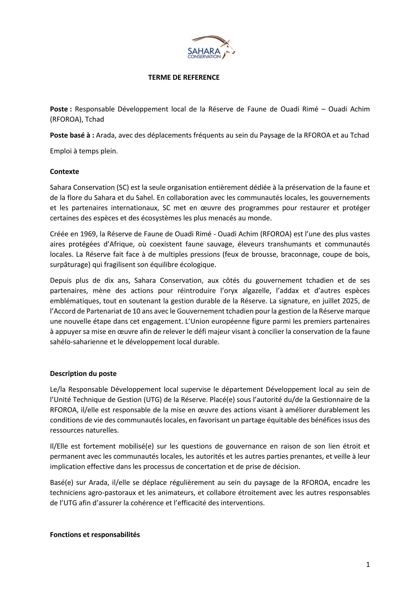 Accueil » Opportunités » Afrique » Tchad » Sahara Conservation recherche un(e) Responsable de Développement Local de la Réserve de Faune de Ouadi Rimé – Ouadi Achim, Tchad