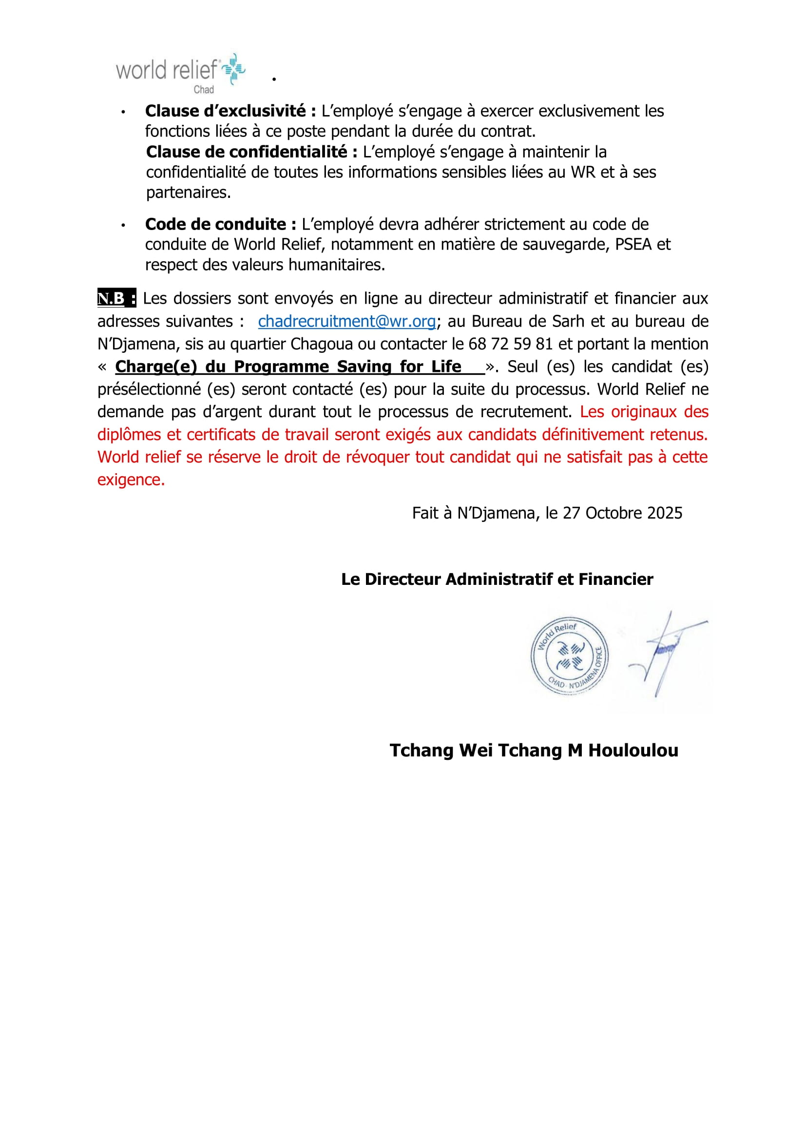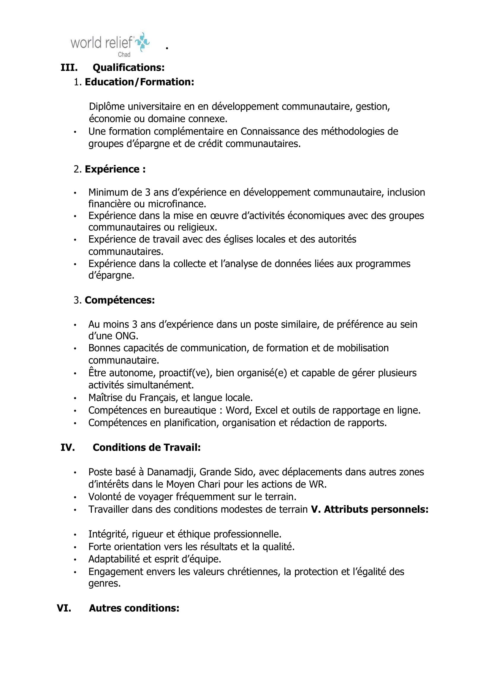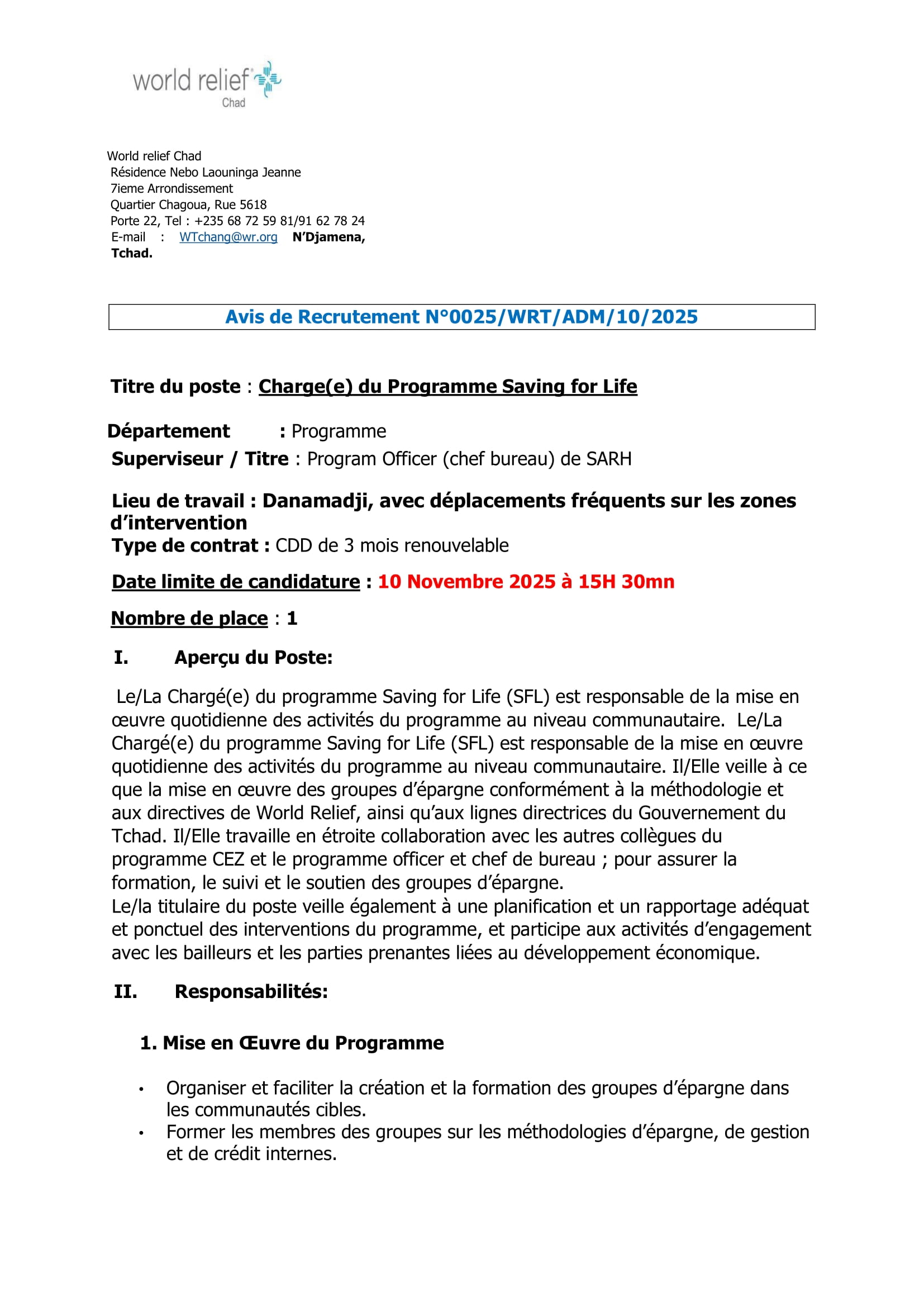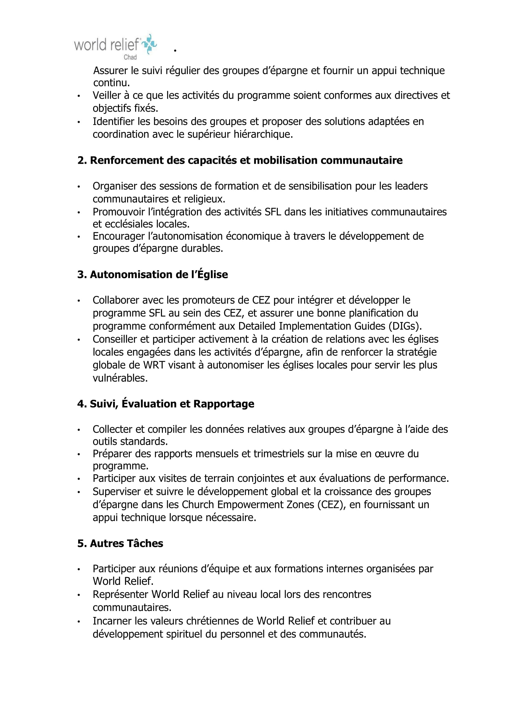 Accueil » Opportunités » Afrique » Tchad » World Relief recrute à Danamadji un(e) Chargé(e) du Programme Saving For Life, Tchad