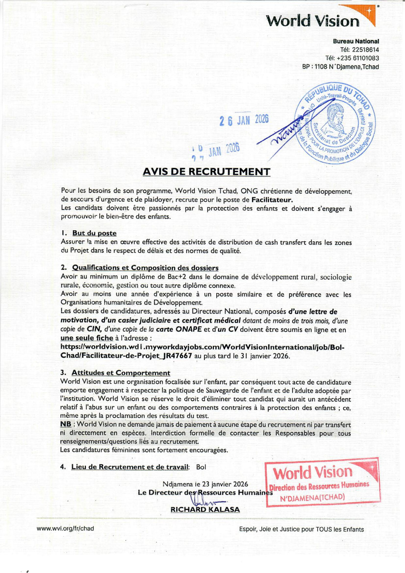 World Vision recrute un Facilitateur de Projet Cash Transfer au Tchad