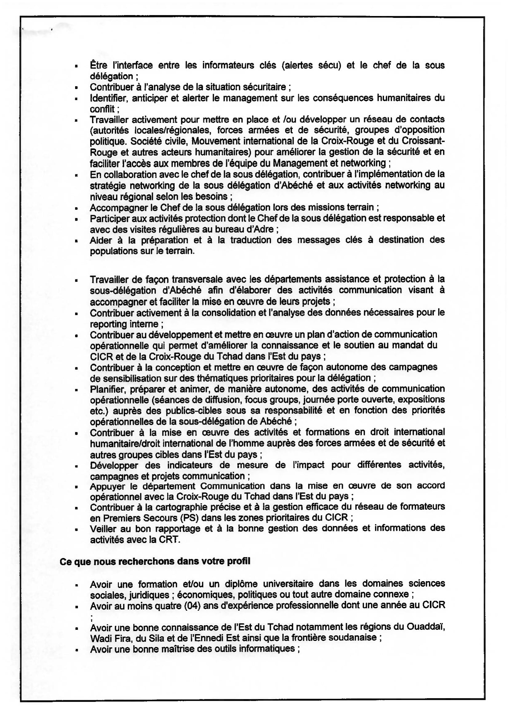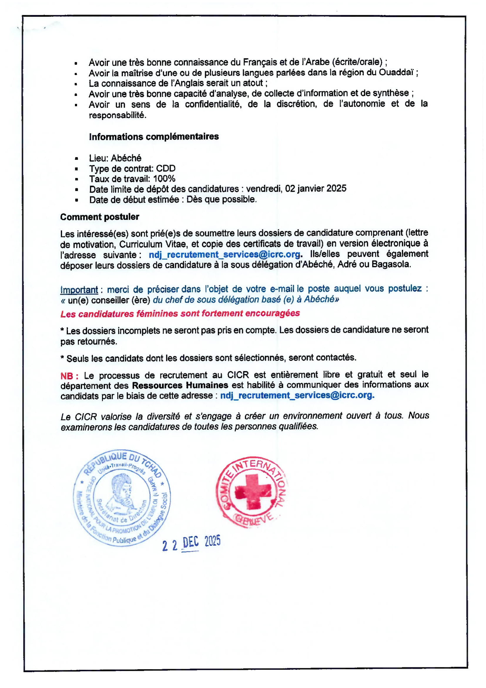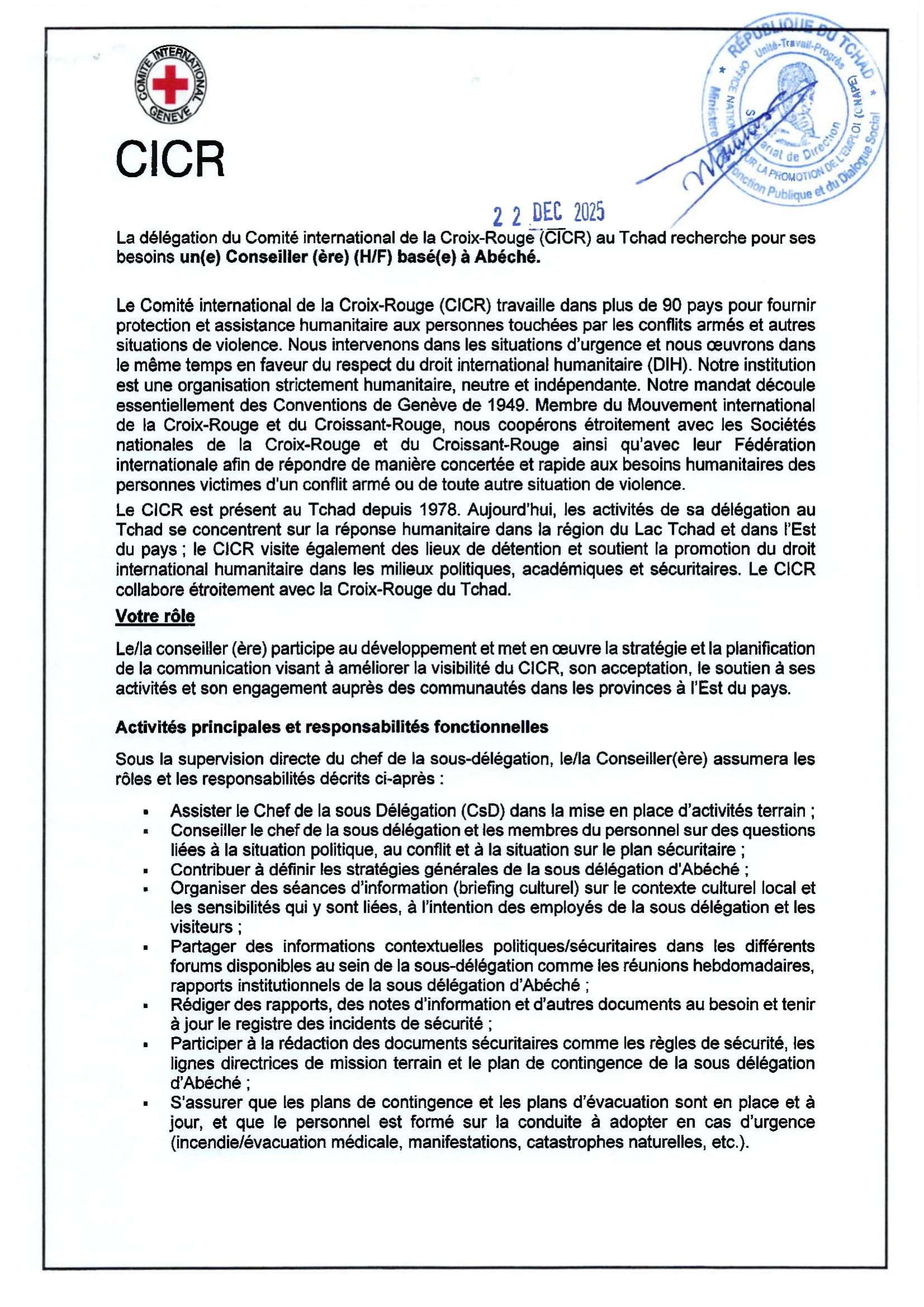 La CICR recherche pour ses besoins un(e) Conseiller(ère) basé(e) à Abéché, Tchad