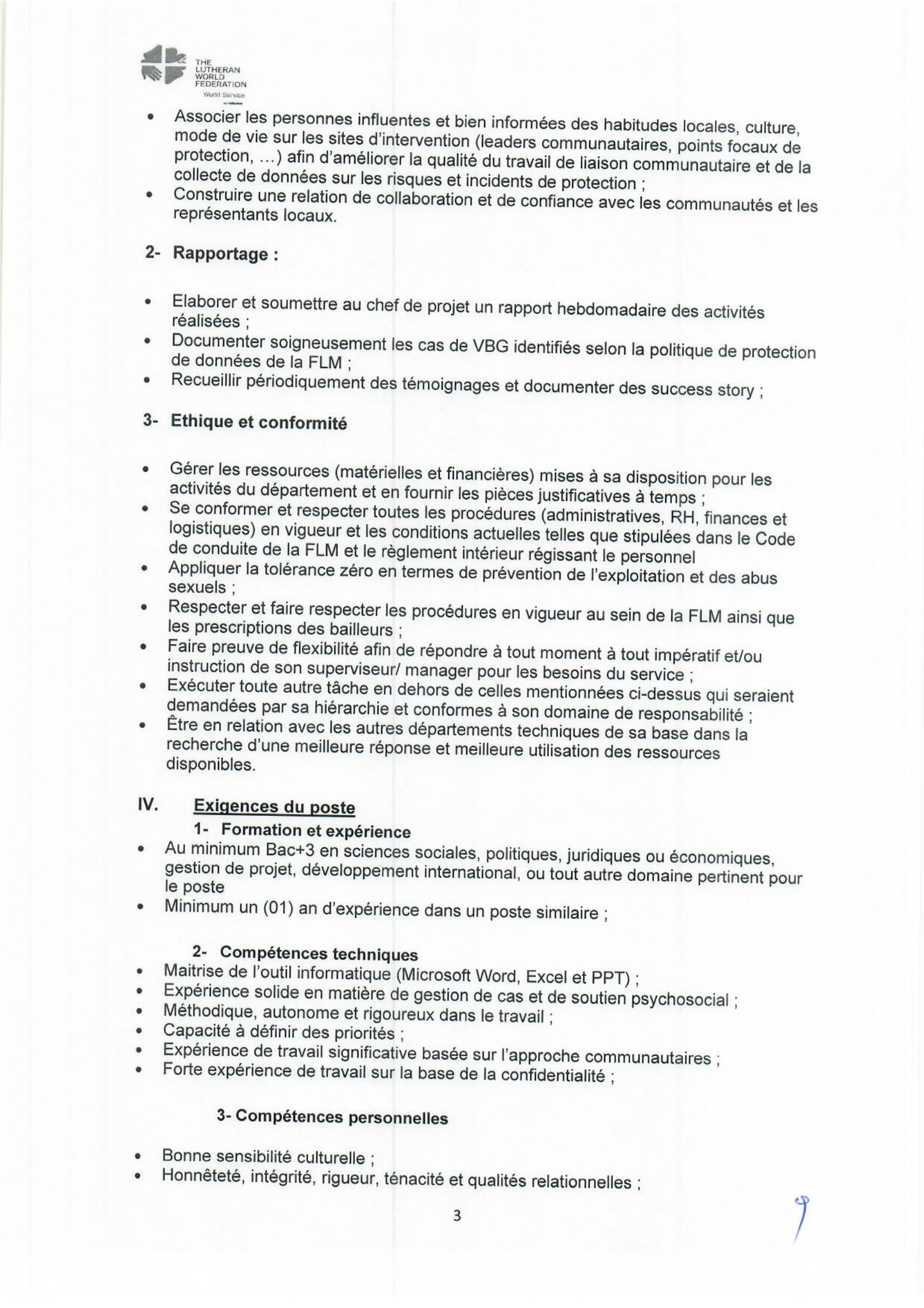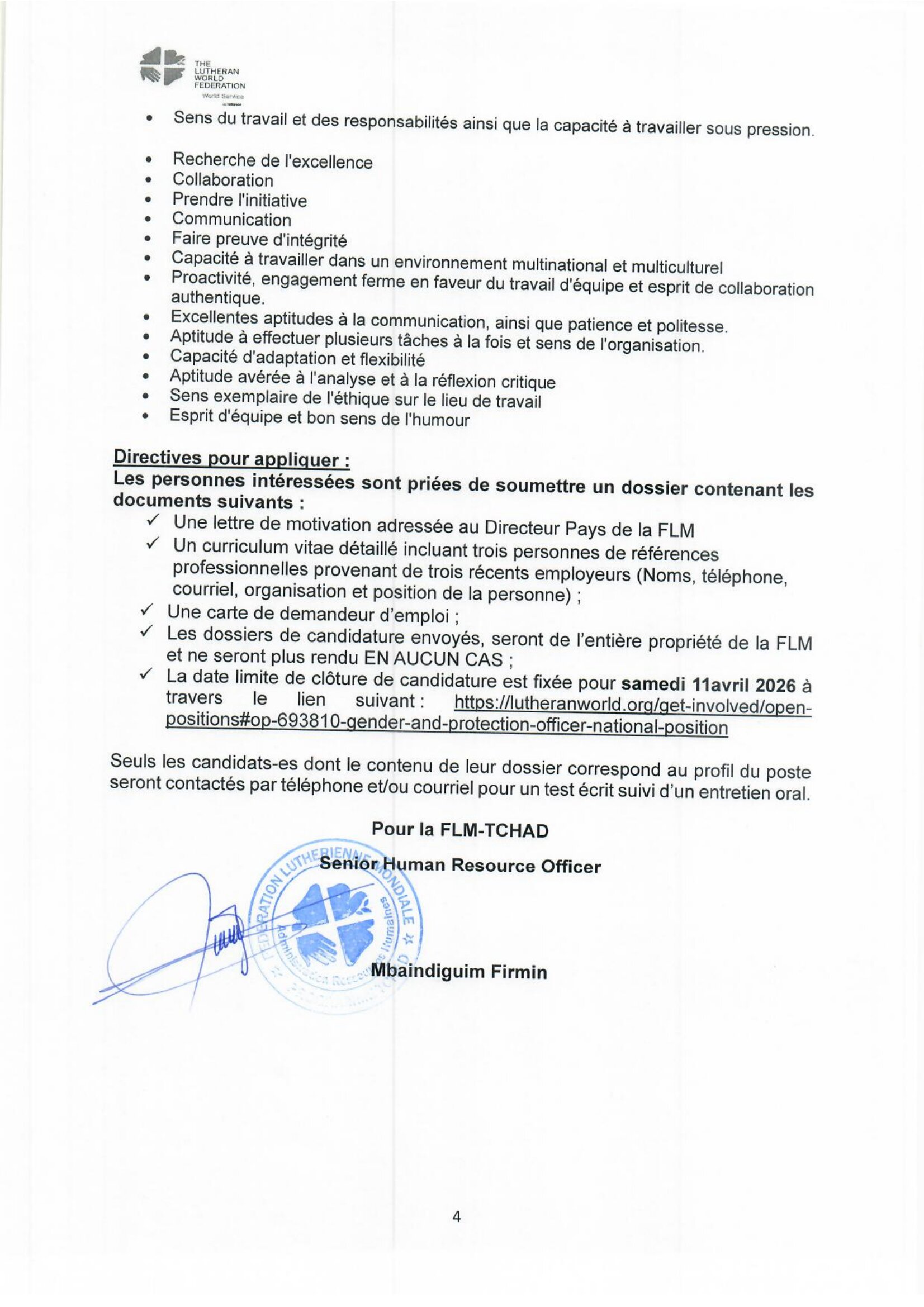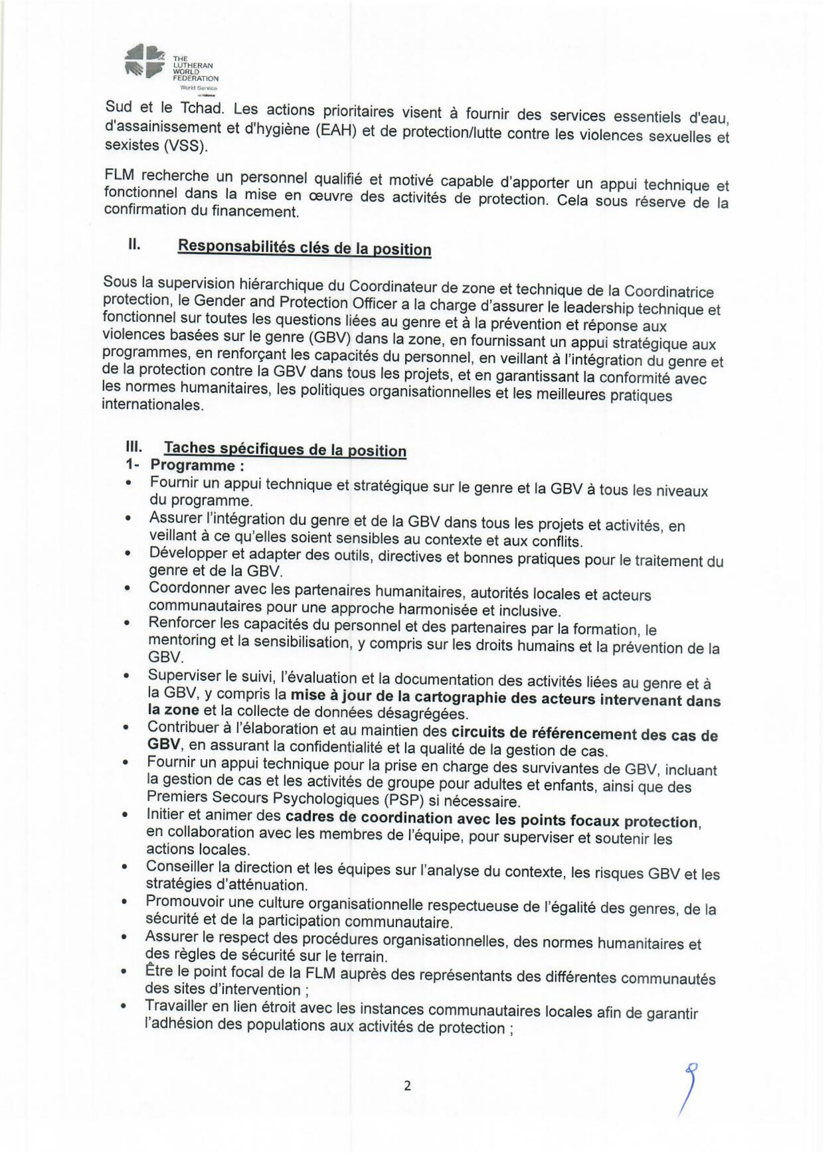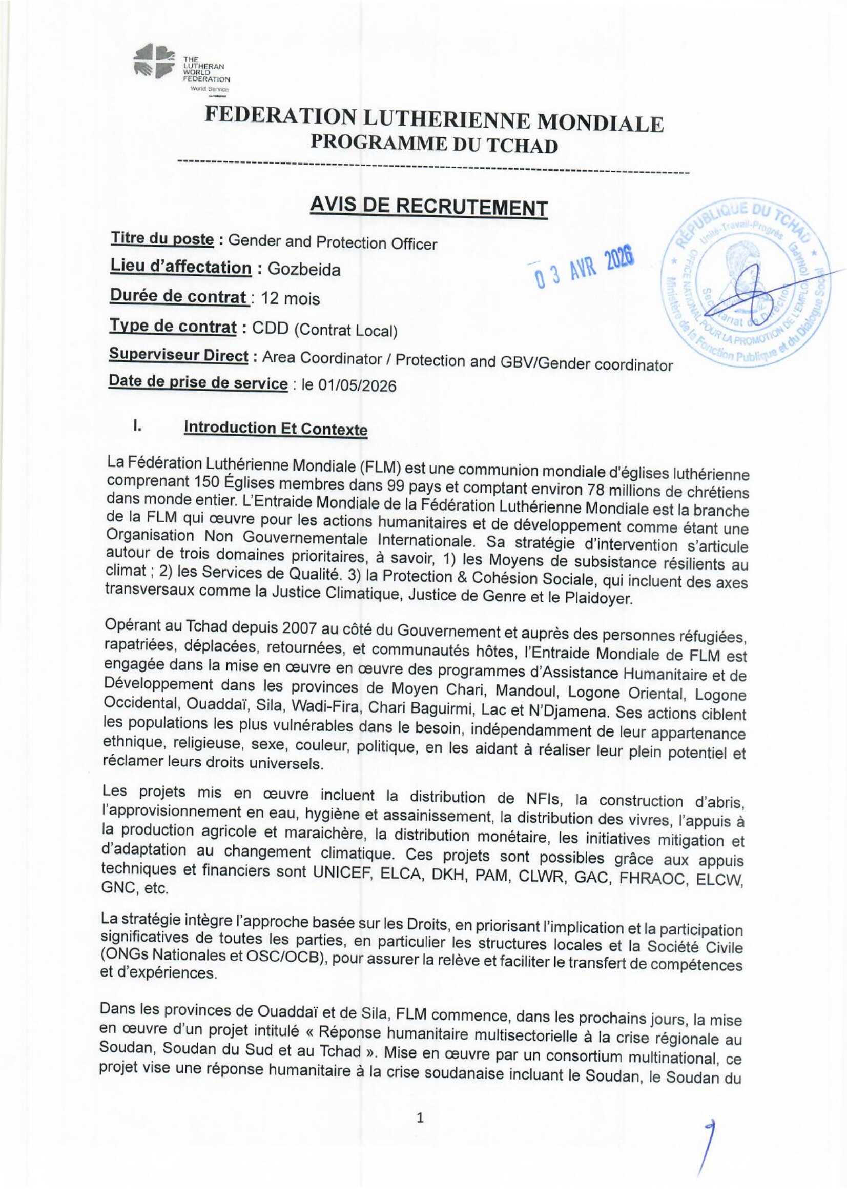 Accueil » Opportunités » Afrique » Tchad » La Fédération Luthérienne Mondiale (FLM) au Tchad recrute un(e) Responsable de Protection et Genre, poste basé à Goz-Beïda