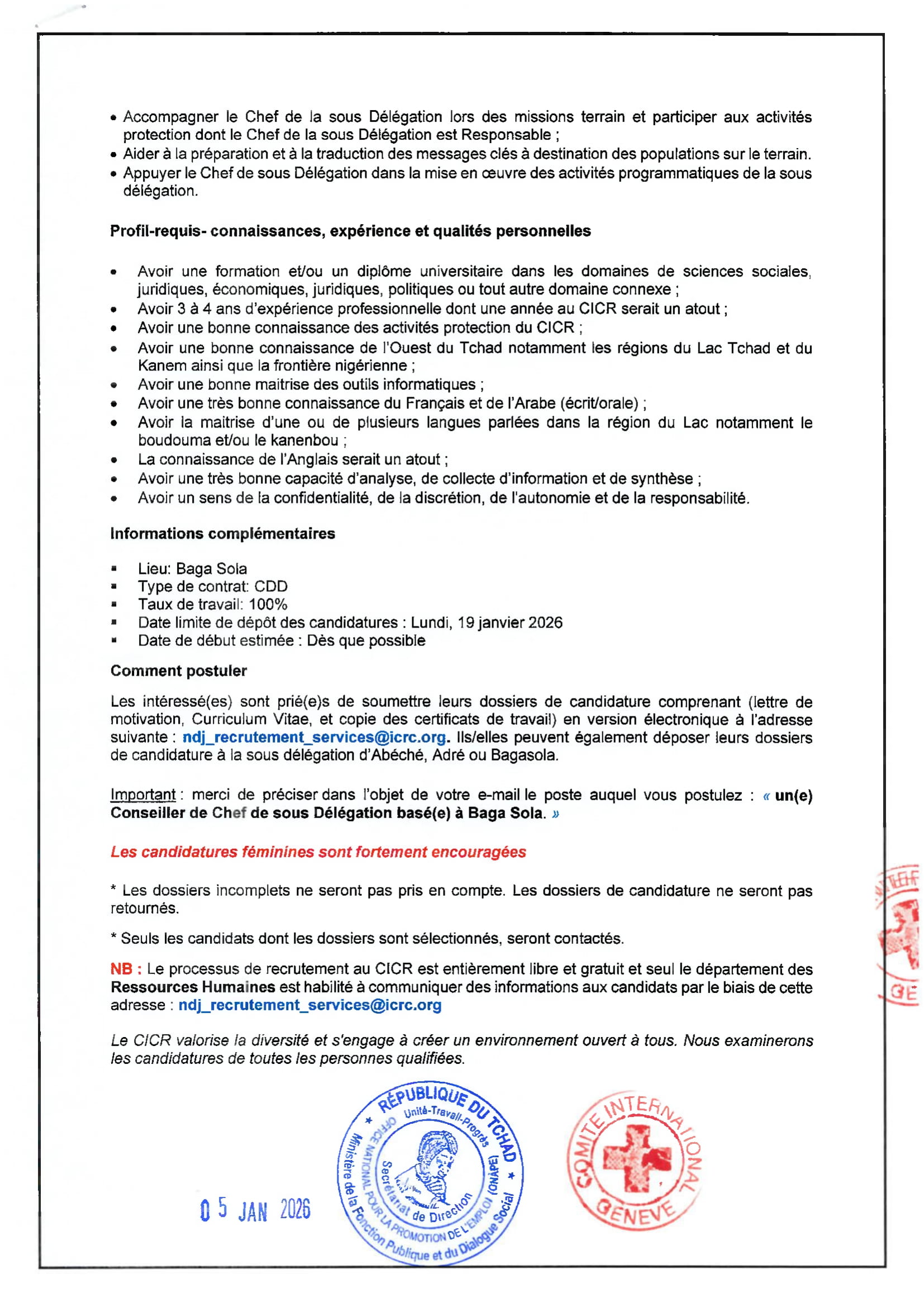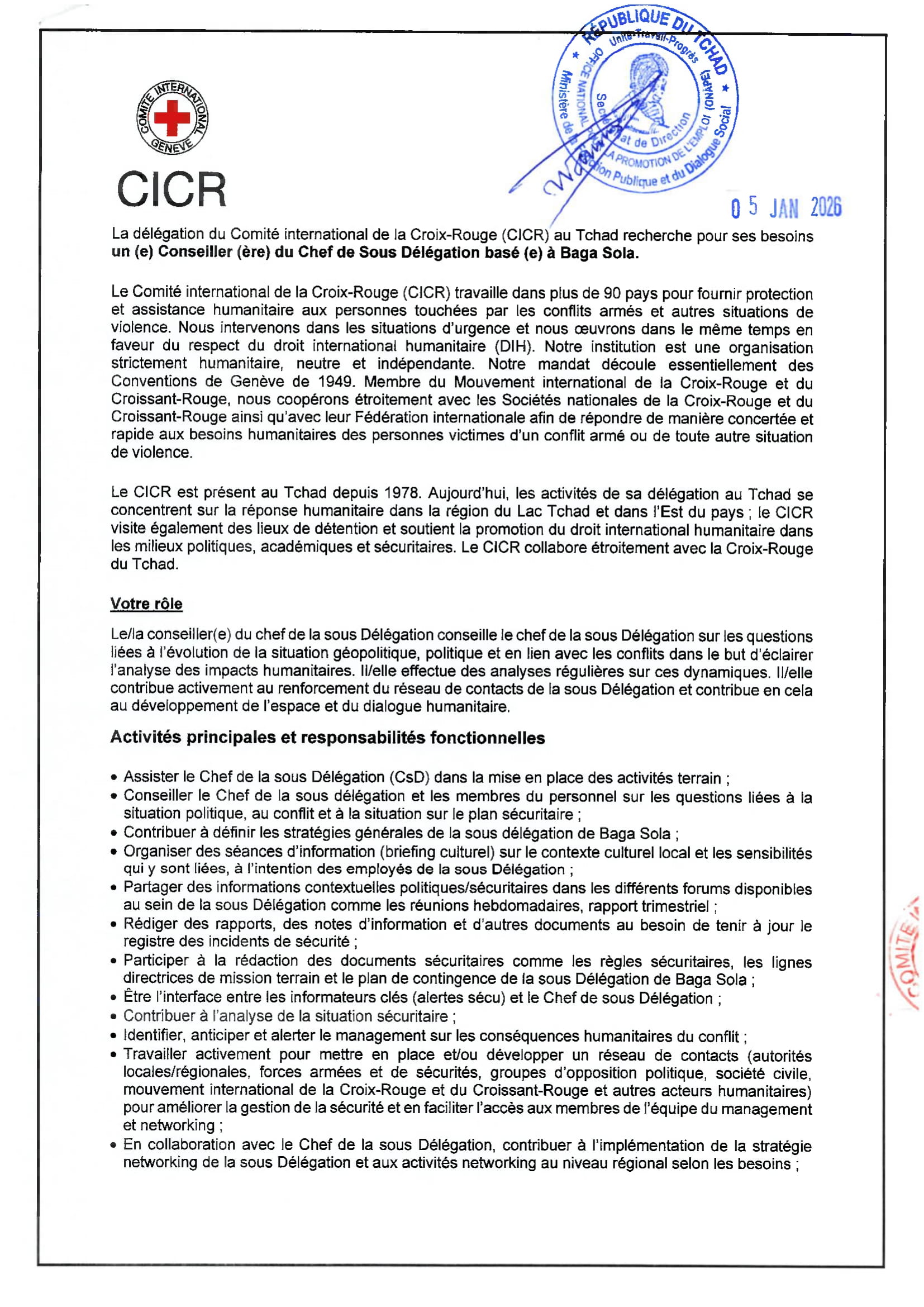 Le Comité International de la Croix-Rouge (CICR) au Tchad recherche un(e) Conseiller(ère) du Chef de Sous Délégation, poste basé à Baga Sola